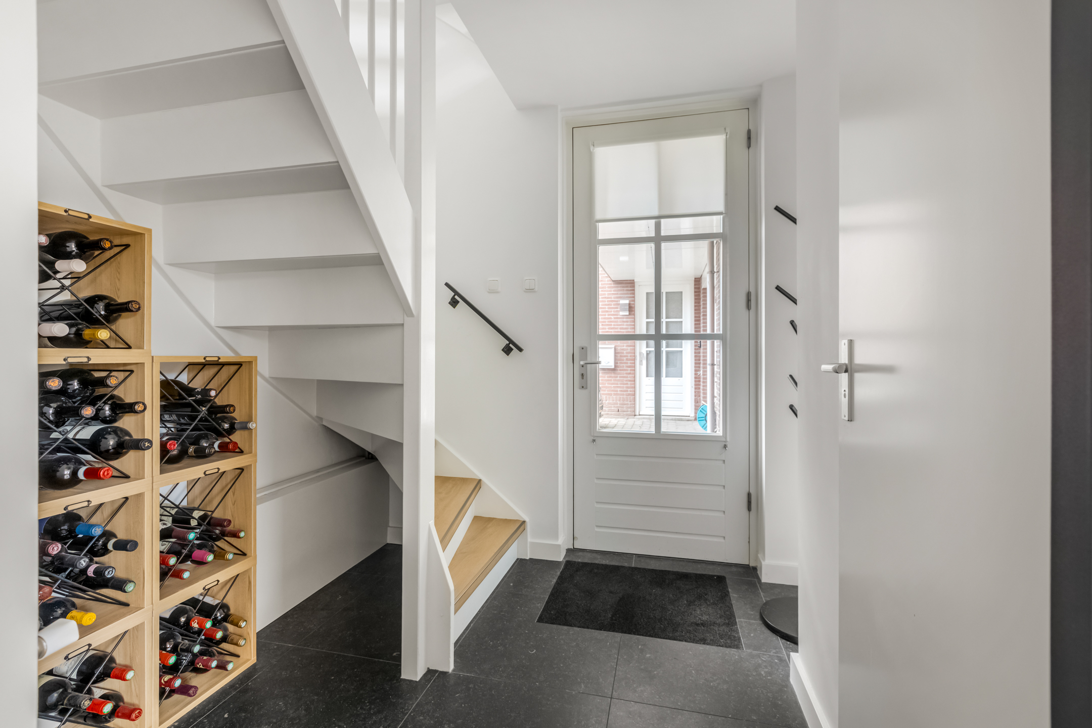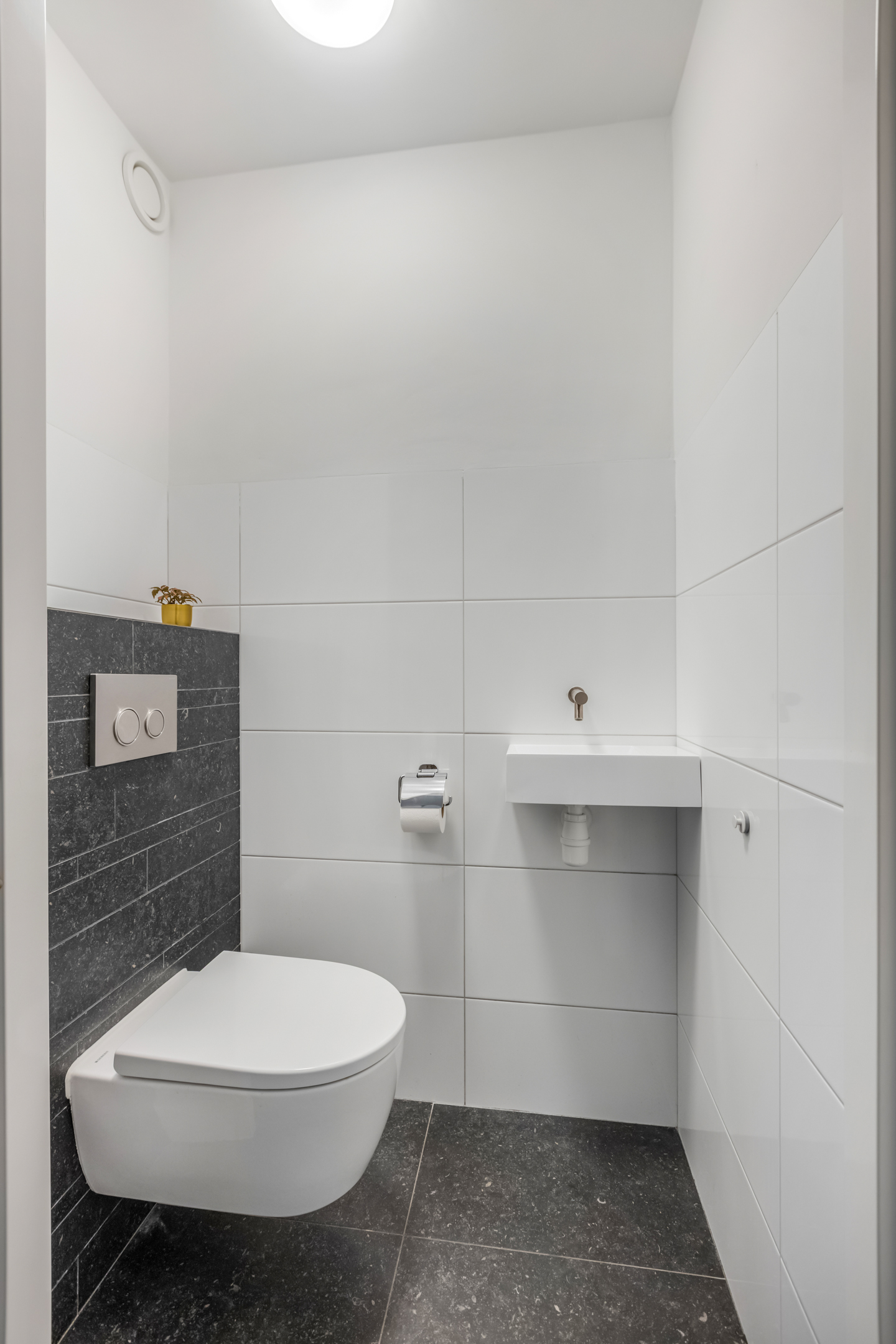 Entree, hal met garderobehoek, meterkast en een moderne toiletruimte voorzien van een hangcloset en fonteintje, trapopgang naar de verdiepingen en de lichte, L-vormige woonkamer.