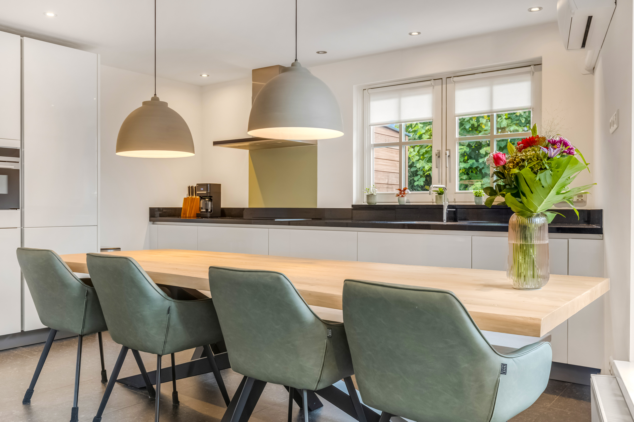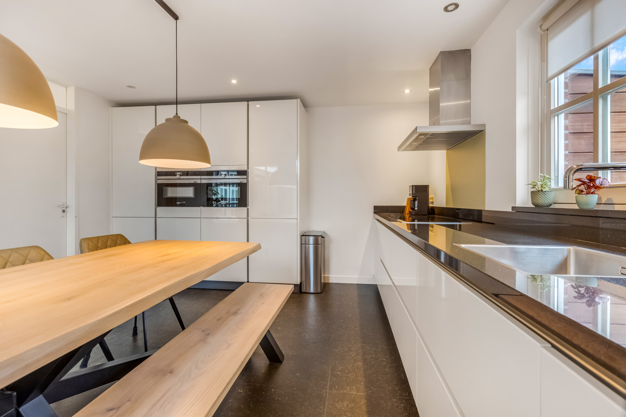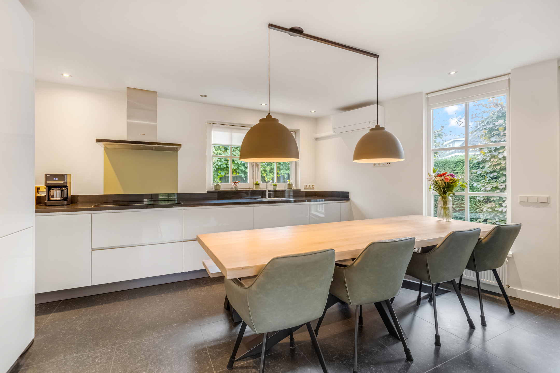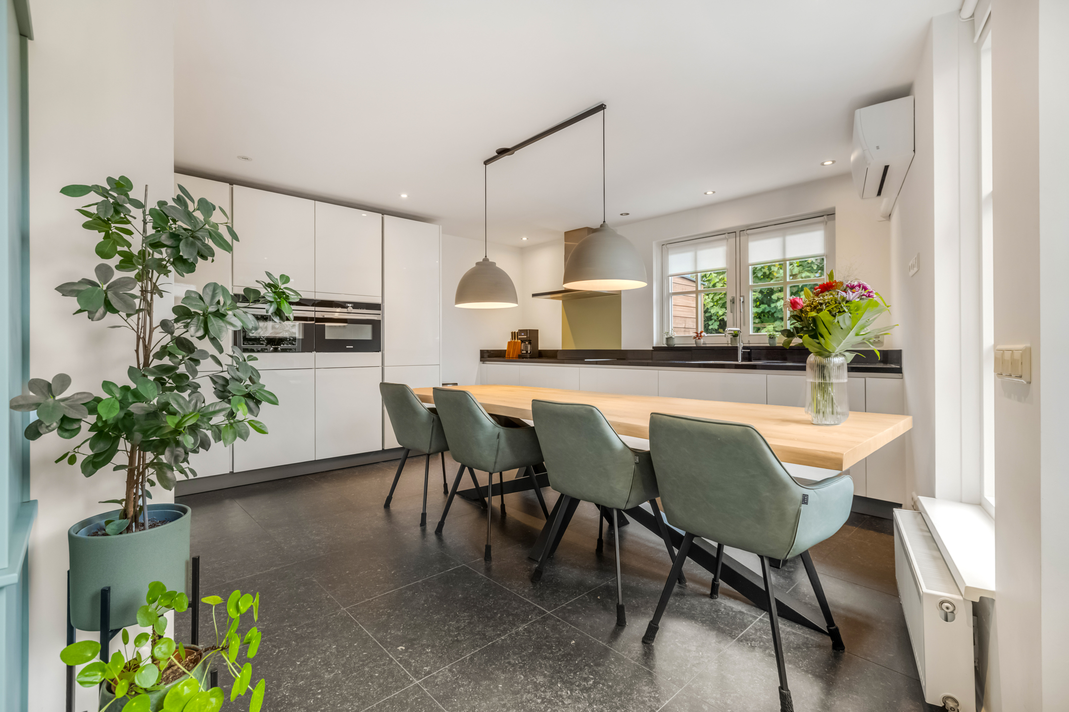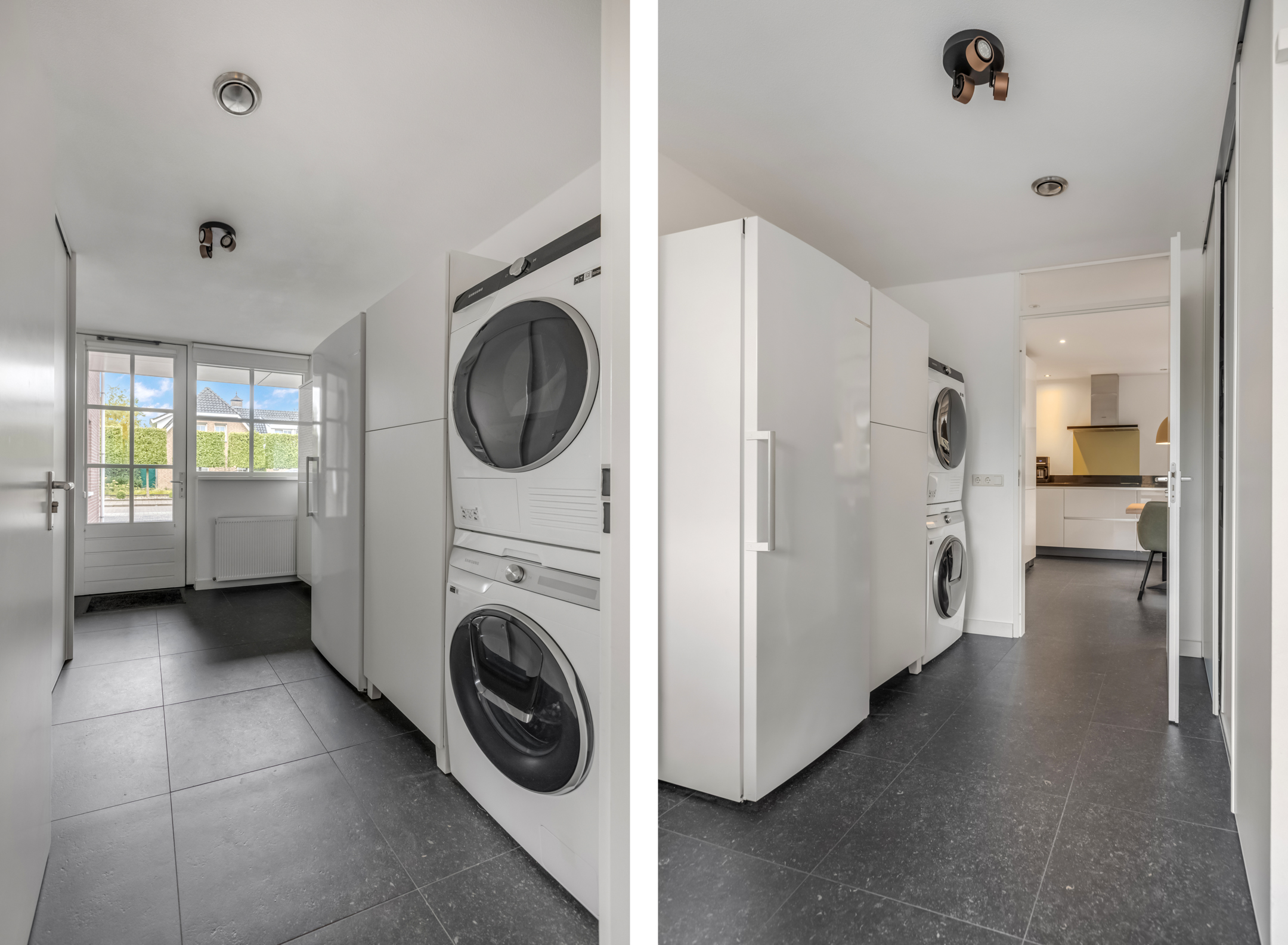 De royale woonkamer is sfeervol afgewerkt met een eikenhouten vloer en beschikt over een lichte serre, waardoor het natuurlijke daglicht rijkelijk binnenvalt. De woonkamer staat in open verbinding met de ruime woonkeuken, wat zorgt voor een harmonieuze en open indeling. Via openslaande deuren is de fraai aangelegde achtertuin direct toegankelijk, waardoor binnen en buiten op aangename wijze in elkaar overlopen. De woonkeuken biedt ruimschoots plaats voor een grote eethoek, is voorzien van vloerverwarming, airconditioning en verleent directe toegang tot de achtertuin. De keuken is luxueus uitgevoerd met veel bergruimte in een royale kastenwand, een natuurstenen aanrechtblad en hoogwaardige inbouwapparatuur, waaronder een Quooker, inductiekookplaat, combi-magnetron, oven, vaatwasser en afzuigkap. De voormalige garage is zowel vanuit de keuken als vanaf de oprit toegankelijk en is op smaakvolle wijze ingericht als was- en bergruimte, voorzien van een grote vaste kast. Dit zorgt voor extra functionele leefruimte en wooncomfort.