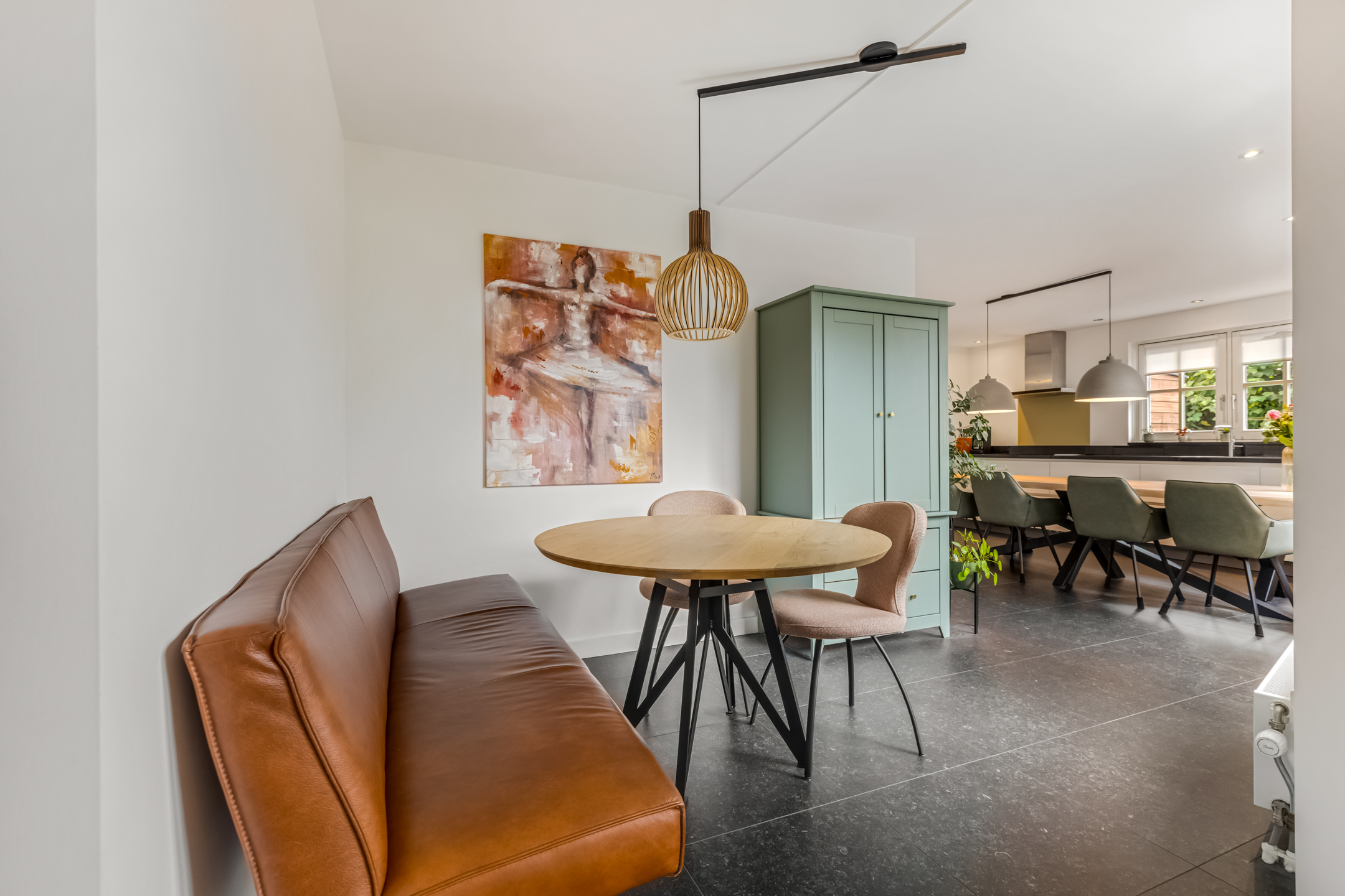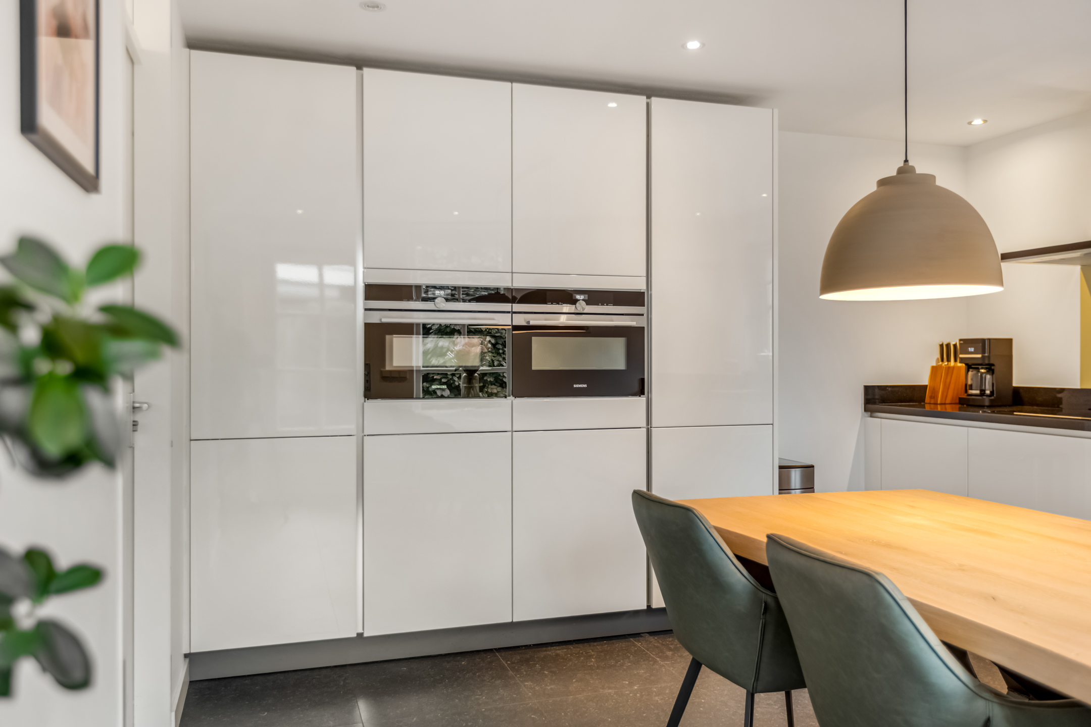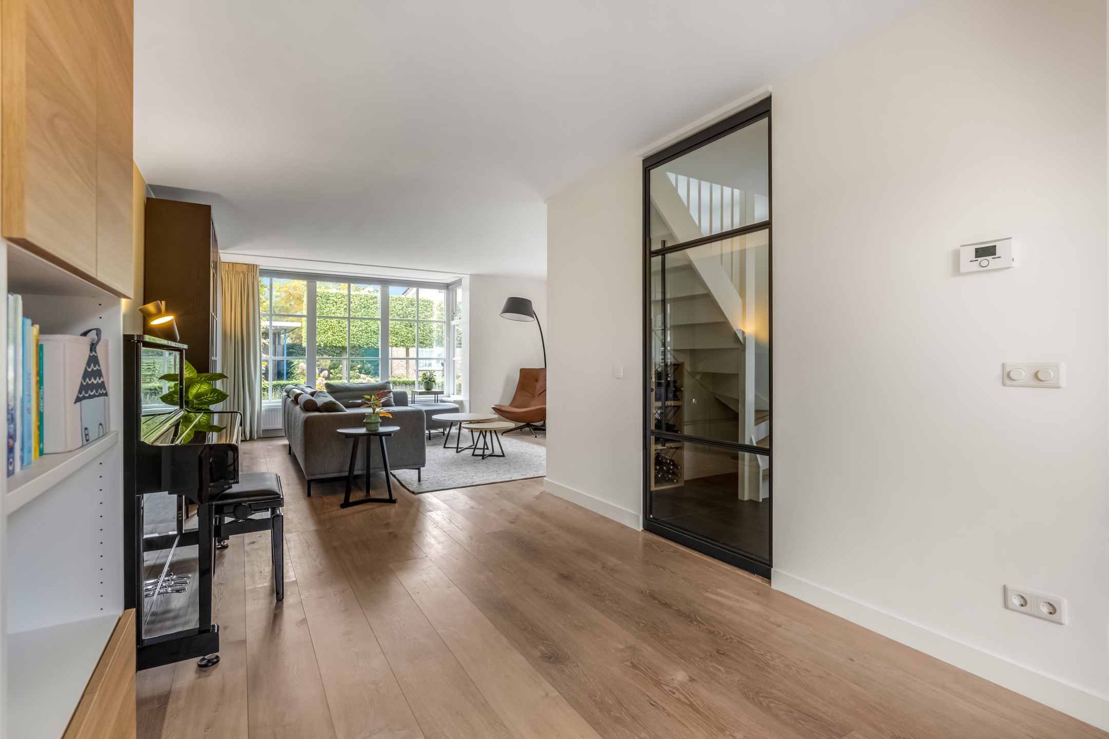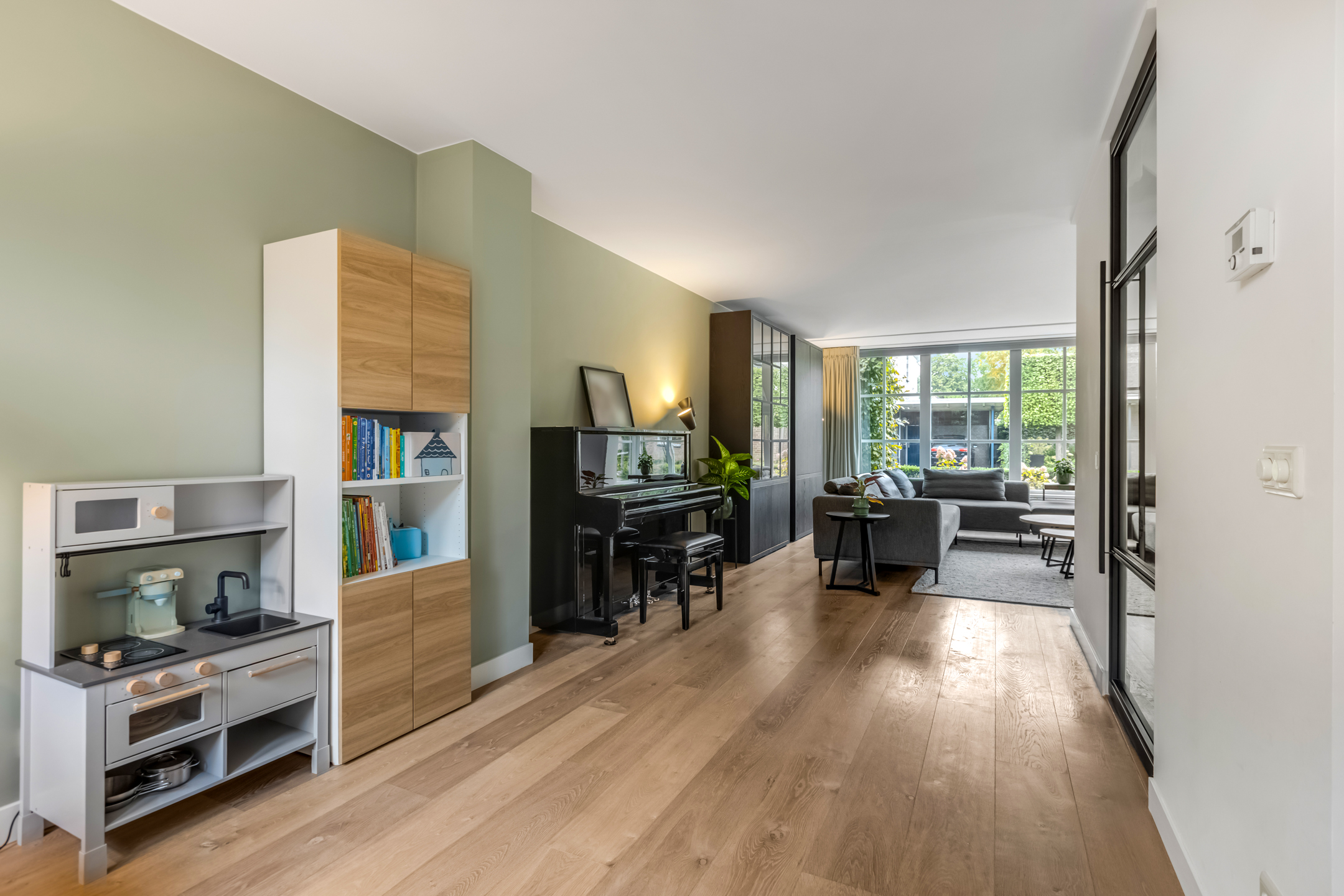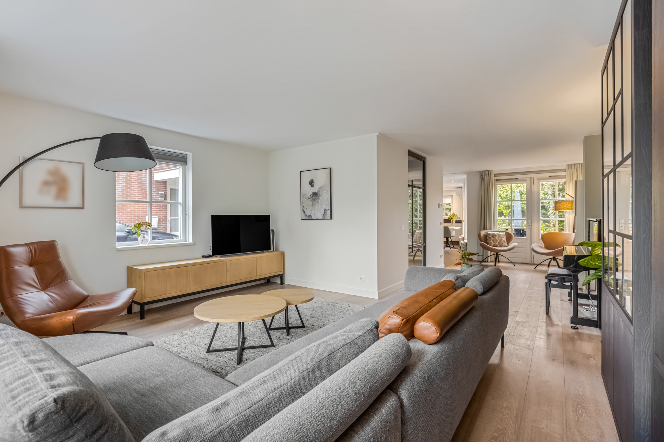 De royale woonkamer is sfeervol afgewerkt met een eikenhouten vloer en beschikt over een lichte serre, waardoor het natuurlijke daglicht rijkelijk binnenvalt. De woonkamer staat in open verbinding met de ruime woonkeuken, wat zorgt voor een harmonieuze en open indeling. Via openslaande deuren is de fraai aangelegde achtertuin direct toegankelijk, waardoor binnen en buiten op aangename wijze in elkaar overlopen. De woonkeuken biedt ruimschoots plaats voor een grote eethoek, is voorzien van vloerverwarming, airconditioning en verleent directe toegang tot de achtertuin. De keuken is luxueus uitgevoerd met veel bergruimte in een royale kastenwand, een natuurstenen aanrechtblad en hoogwaardige inbouwapparatuur, waaronder een Quooker, inductiekookplaat, combi-magnetron, oven, vaatwasser en afzuigkap. De voormalige garage is zowel vanuit de keuken als vanaf de oprit toegankelijk en is op smaakvolle wijze ingericht als was- en bergruimte, voorzien van een grote vaste kast. Dit zorgt voor extra functionele leefruimte en wooncomfort.