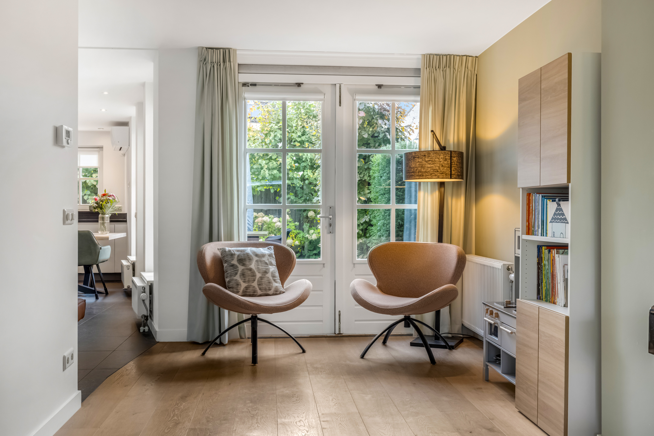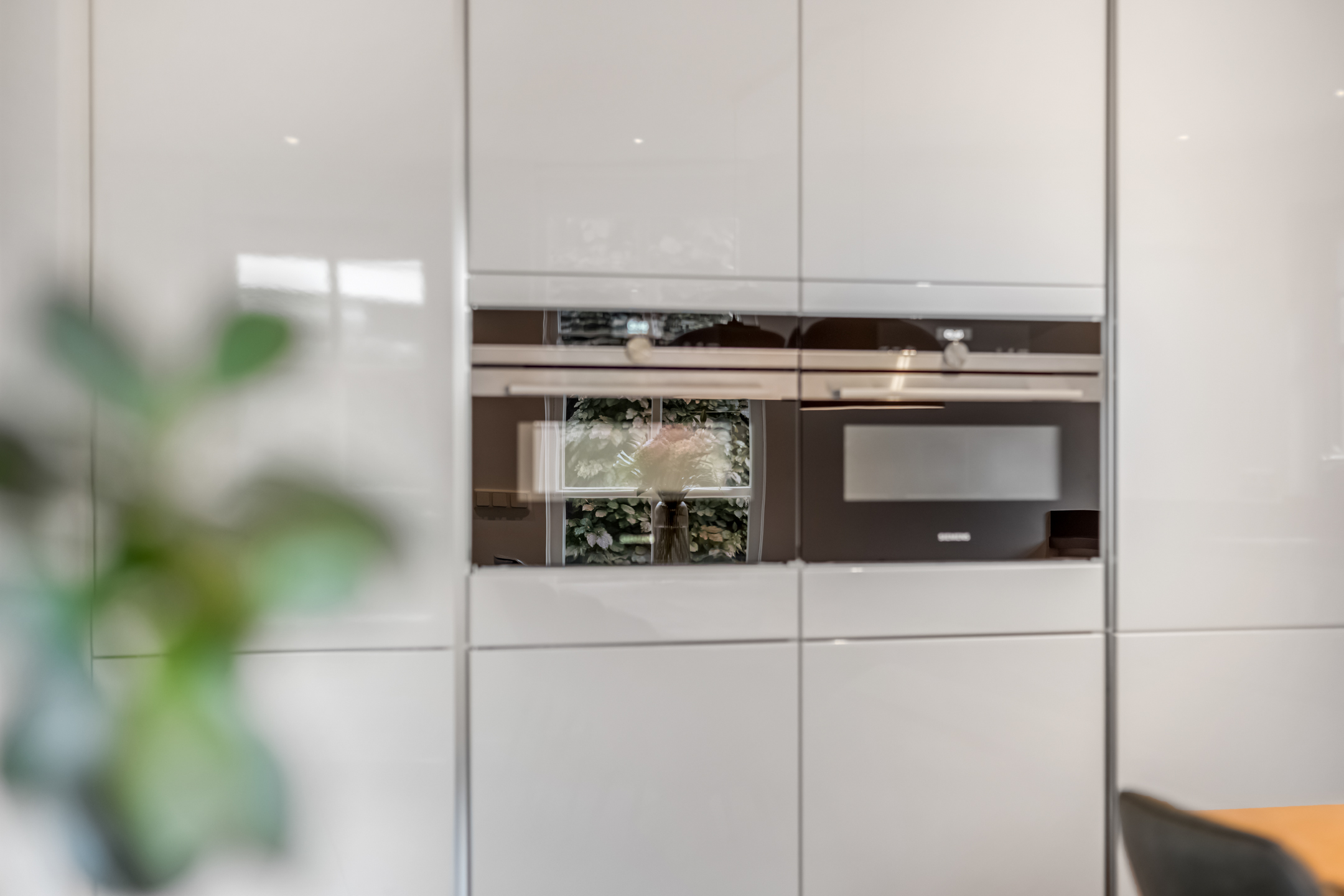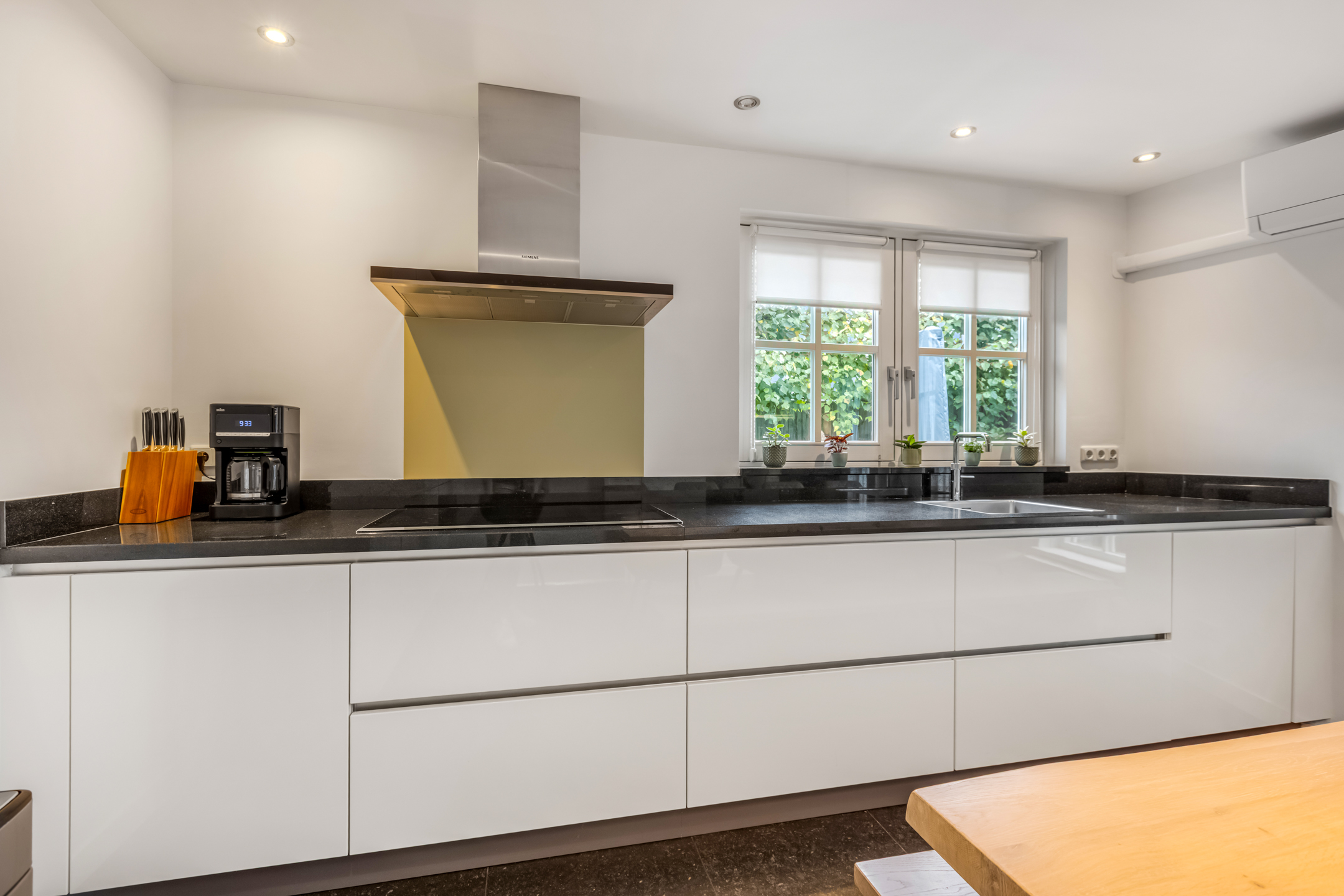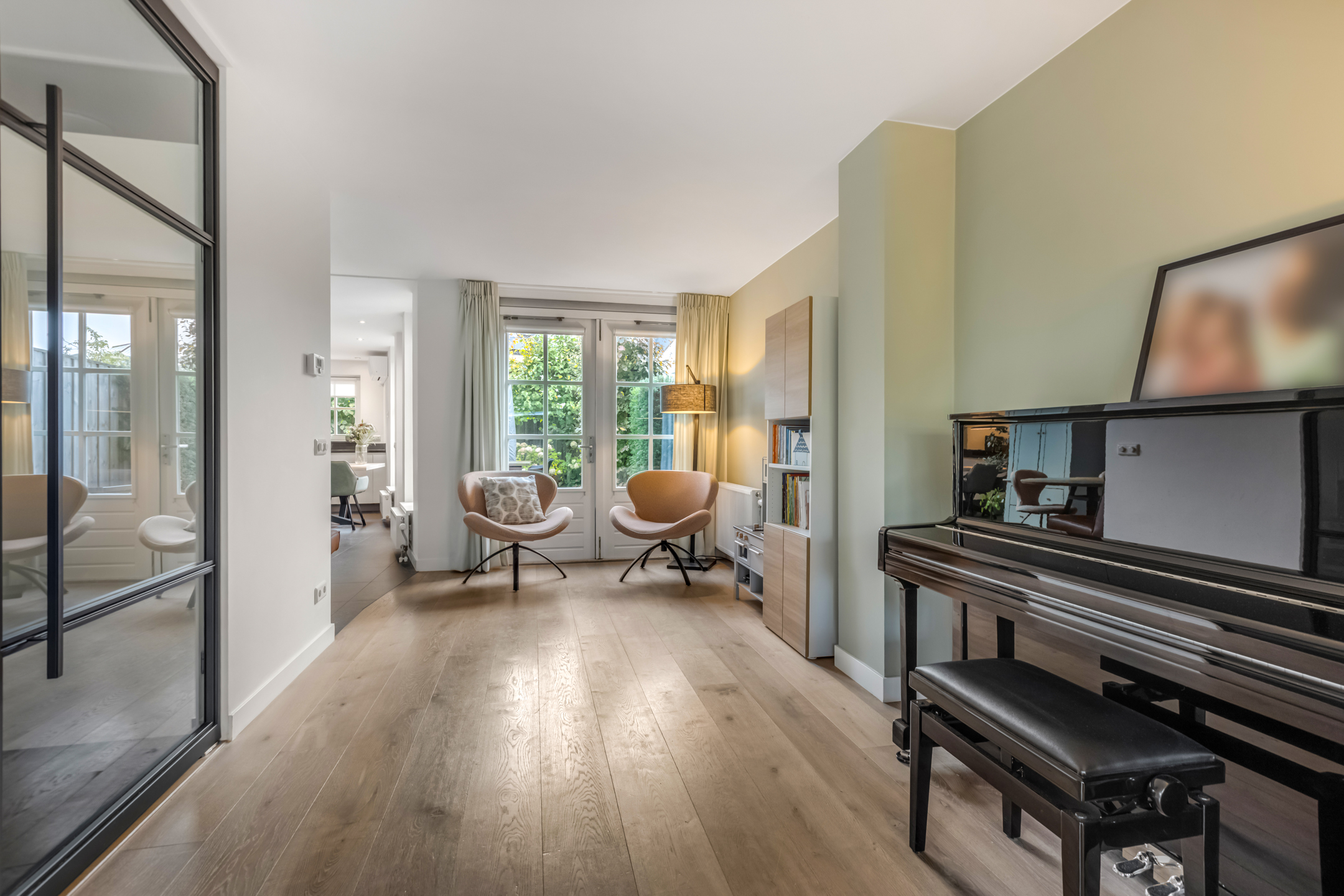 De royale woonkamer is sfeervol afgewerkt met een eikenhouten vloer en beschikt over een lichte serre, waardoor het natuurlijke daglicht rijkelijk binnenvalt. De woonkamer staat in open verbinding met de ruime woonkeuken, wat zorgt voor een harmonieuze en open indeling. Via openslaande deuren is de fraai aangelegde achtertuin direct toegankelijk, waardoor binnen en buiten op aangename wijze in elkaar overlopen. De woonkeuken biedt ruimschoots plaats voor een grote eethoek, is voorzien van vloerverwarming, airconditioning en verleent directe toegang tot de achtertuin. De keuken is luxueus uitgevoerd met veel bergruimte in een royale kastenwand, een natuurstenen aanrechtblad en hoogwaardige inbouwapparatuur, waaronder een Quooker, inductiekookplaat, combi-magnetron, oven, vaatwasser en afzuigkap. De voormalige garage is zowel vanuit de keuken als vanaf de oprit toegankelijk en is op smaakvolle wijze ingericht als was- en bergruimte, voorzien van een grote vaste kast. Dit zorgt voor extra functionele leefruimte en wooncomfort.