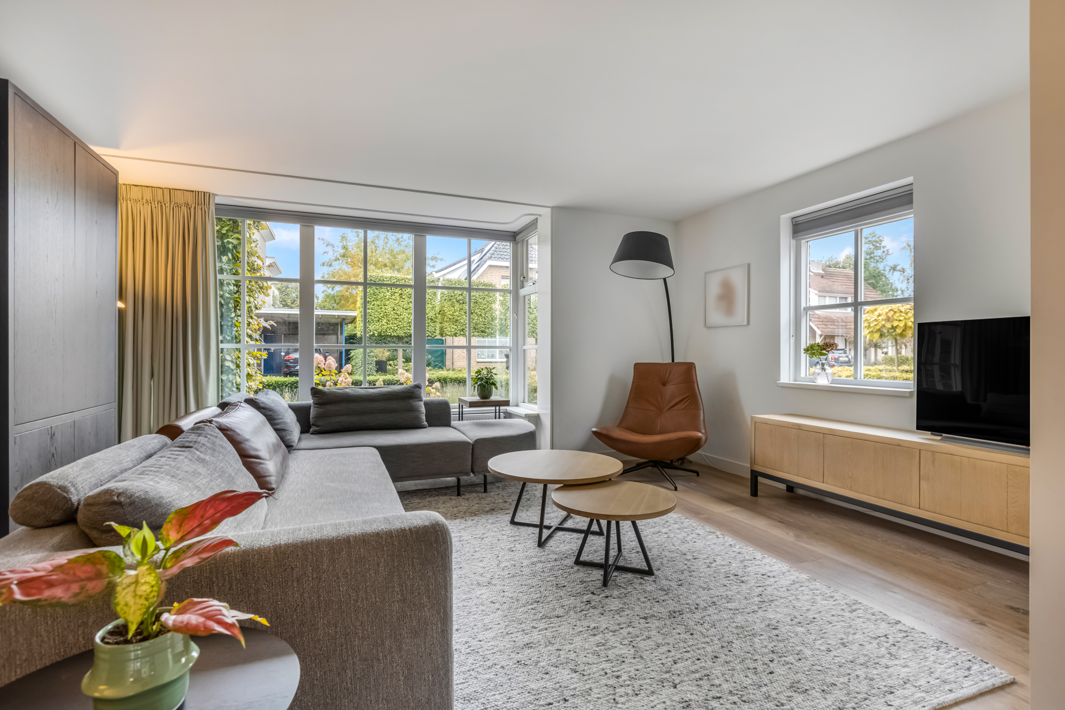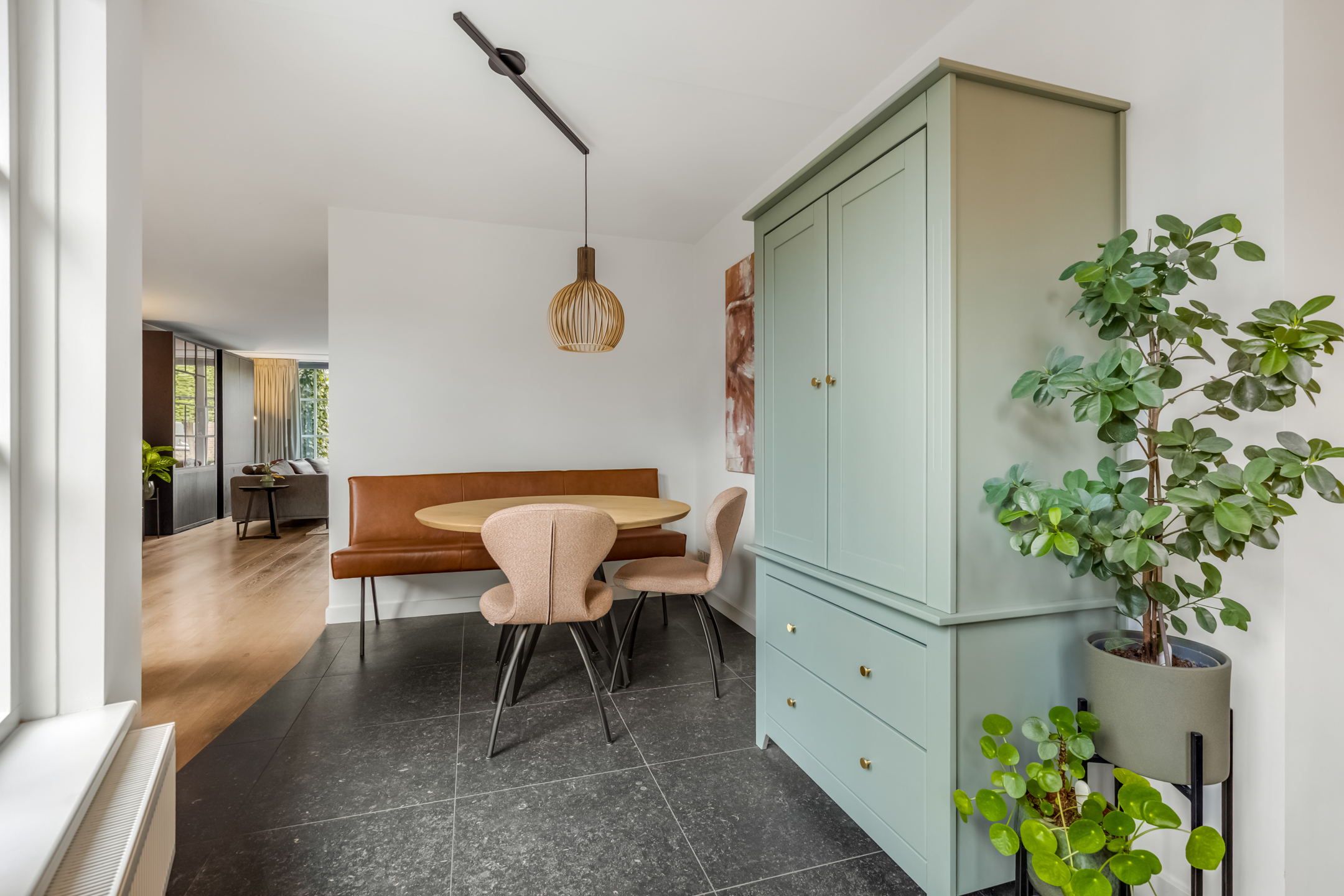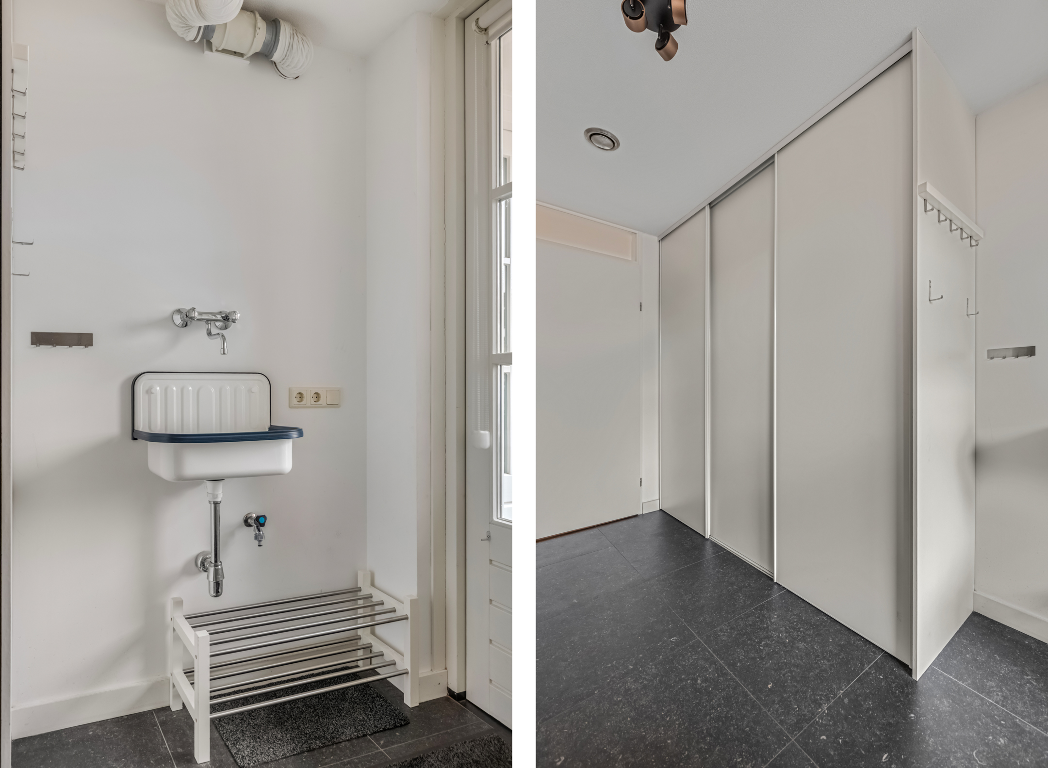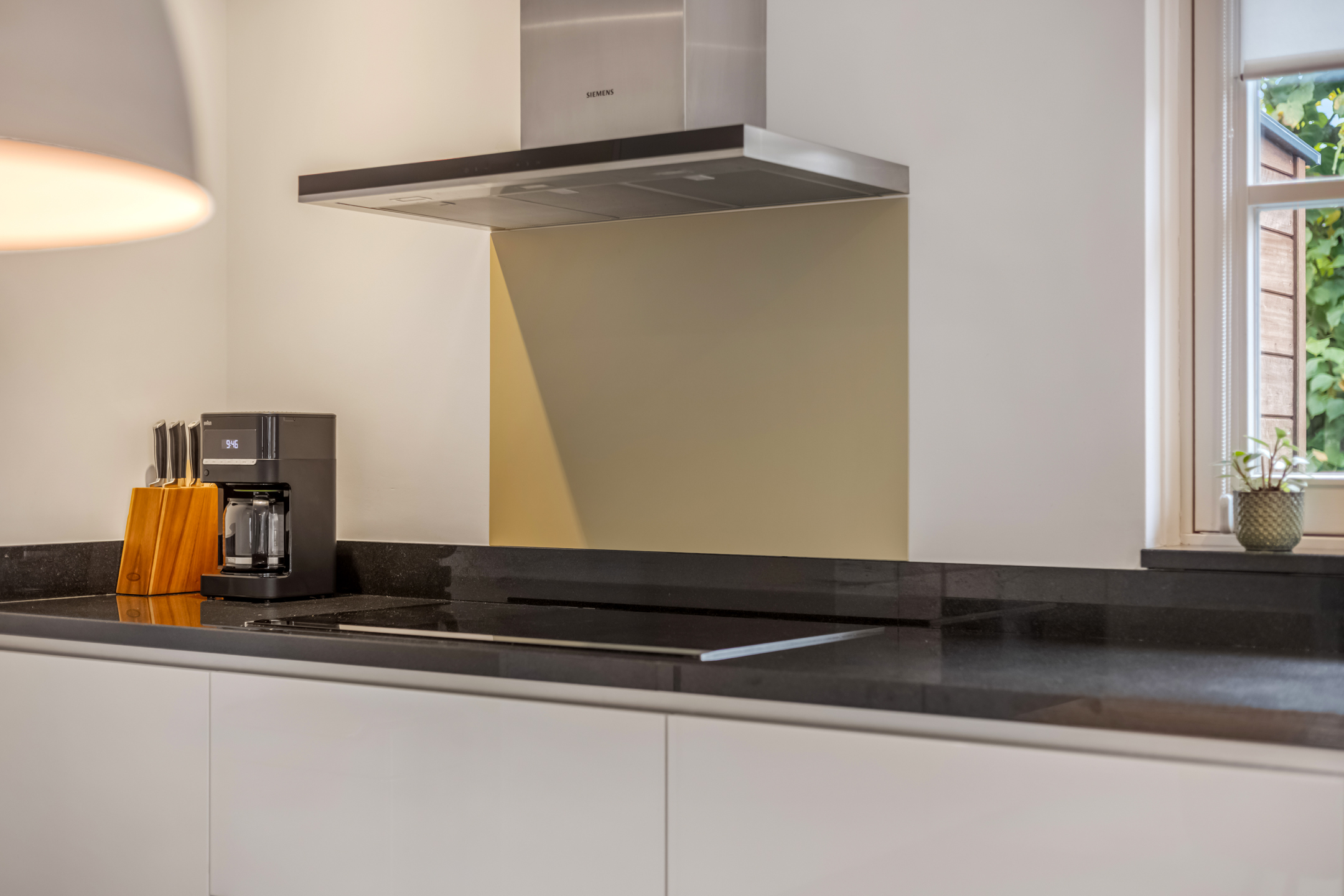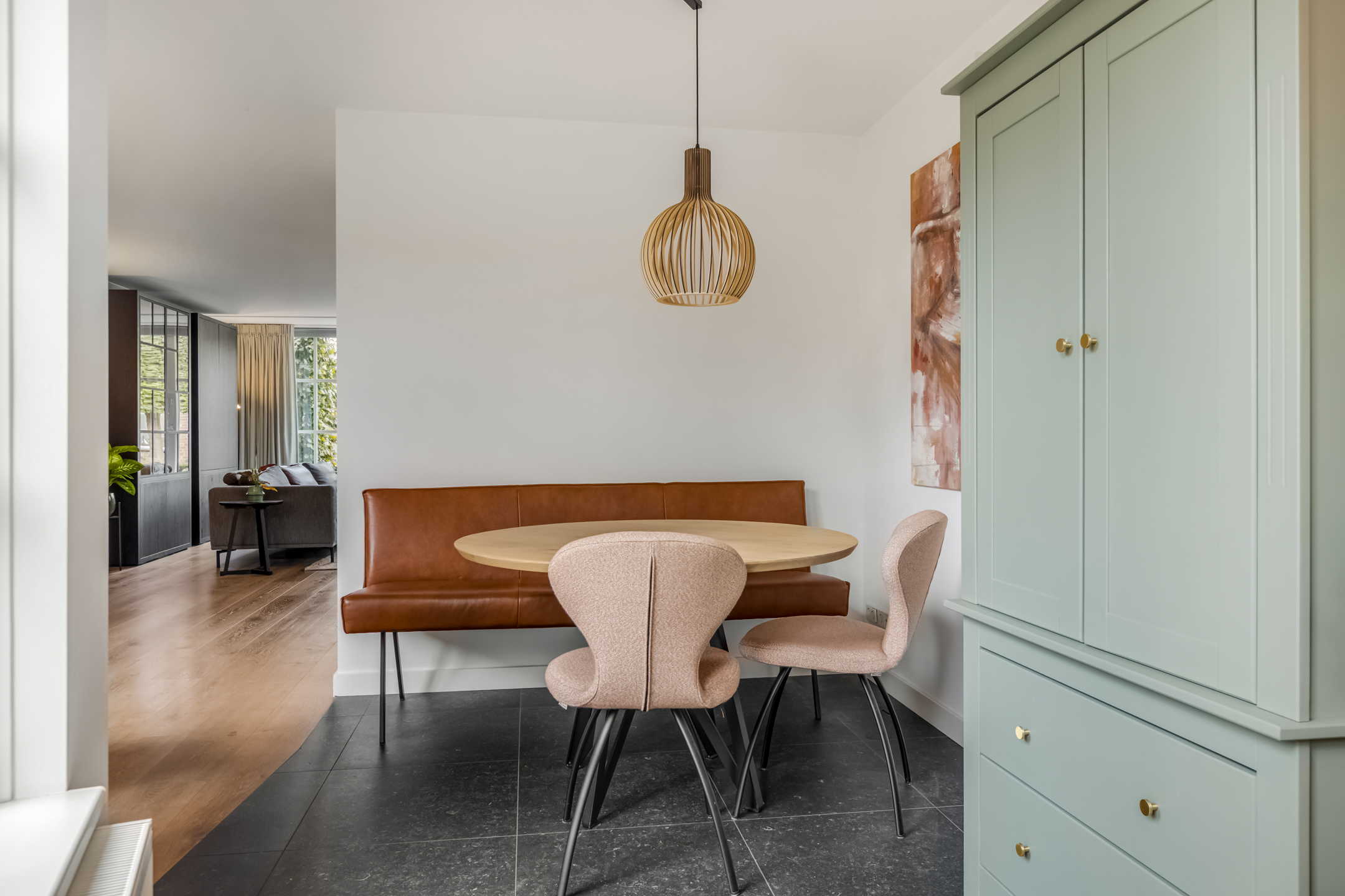 De royale woonkamer is sfeervol afgewerkt met een eikenhouten vloer en beschikt over een lichte serre, waardoor het natuurlijke daglicht rijkelijk binnenvalt. De woonkamer staat in open verbinding met de ruime woonkeuken, wat zorgt voor een harmonieuze en open indeling. Via openslaande deuren is de fraai aangelegde achtertuin direct toegankelijk, waardoor binnen en buiten op aangename wijze in elkaar overlopen. De woonkeuken biedt ruimschoots plaats voor een grote eethoek, is voorzien van vloerverwarming, airconditioning en verleent directe toegang tot de achtertuin. De keuken is luxueus uitgevoerd met veel bergruimte in een royale kastenwand, een natuurstenen aanrechtblad en hoogwaardige inbouwapparatuur, waaronder een Quooker, inductiekookplaat, combi-magnetron, oven, vaatwasser en afzuigkap. De voormalige garage is zowel vanuit de keuken als vanaf de oprit toegankelijk en is op smaakvolle wijze ingericht als was- en bergruimte, voorzien van een grote vaste kast. Dit zorgt voor extra functionele leefruimte en wooncomfort.