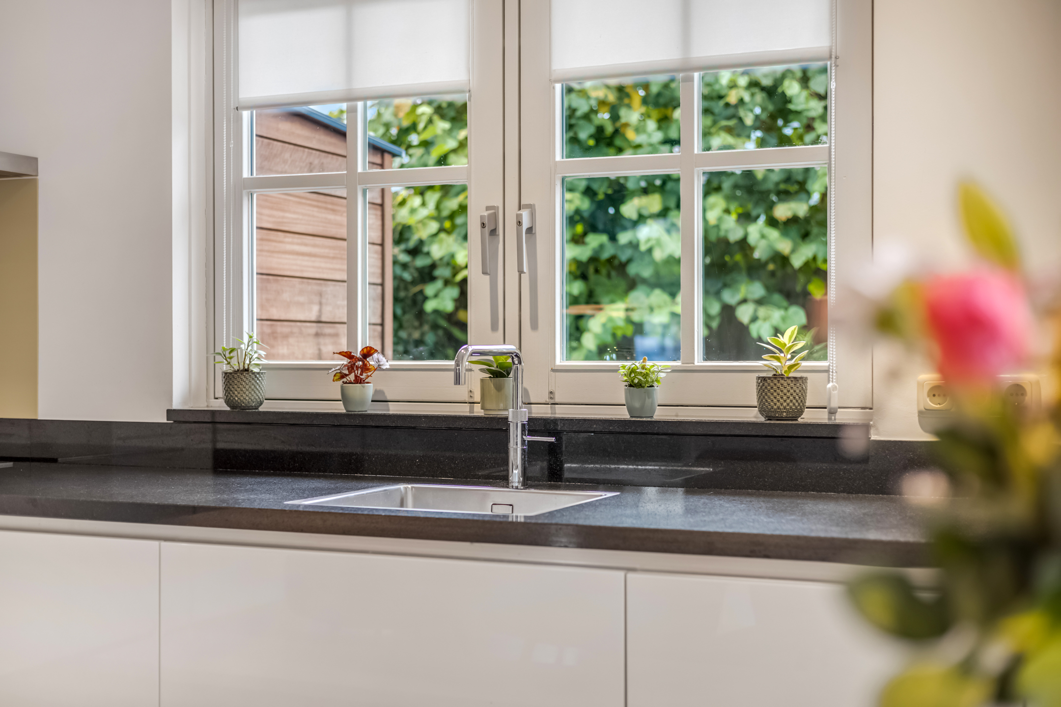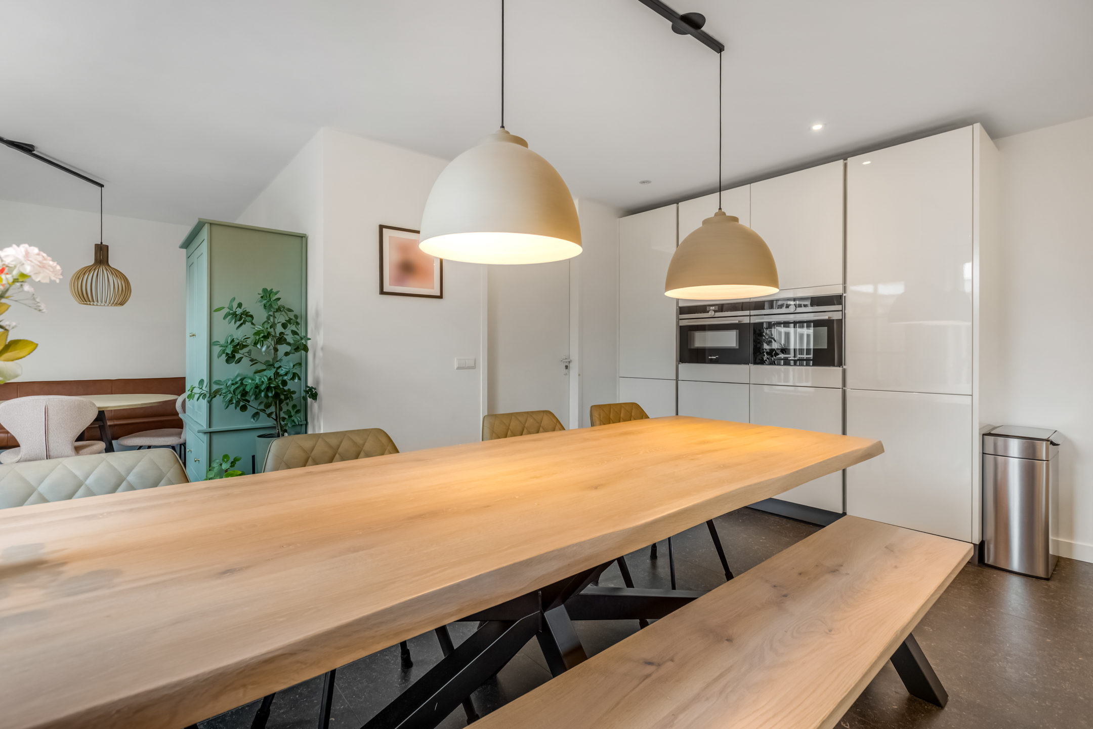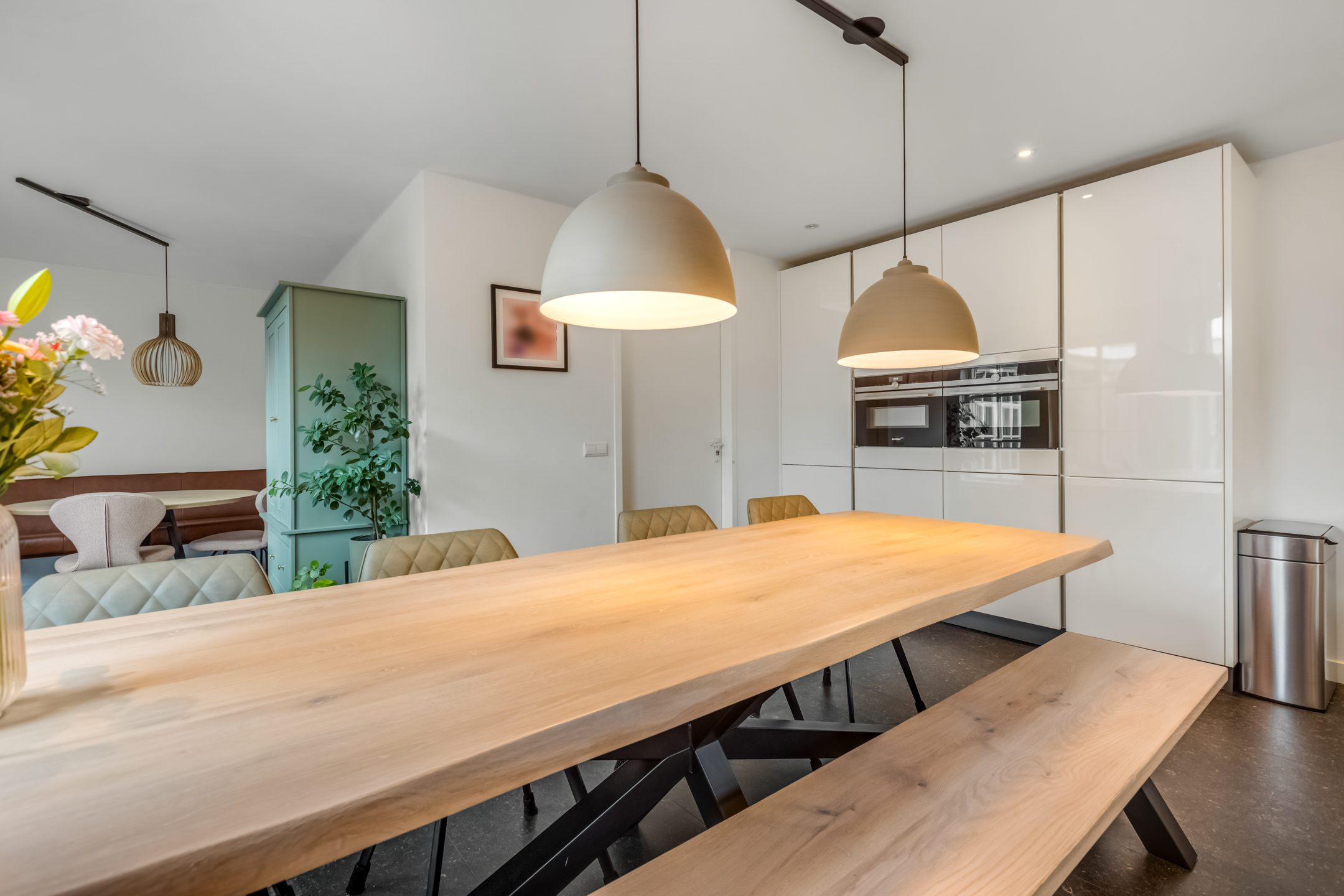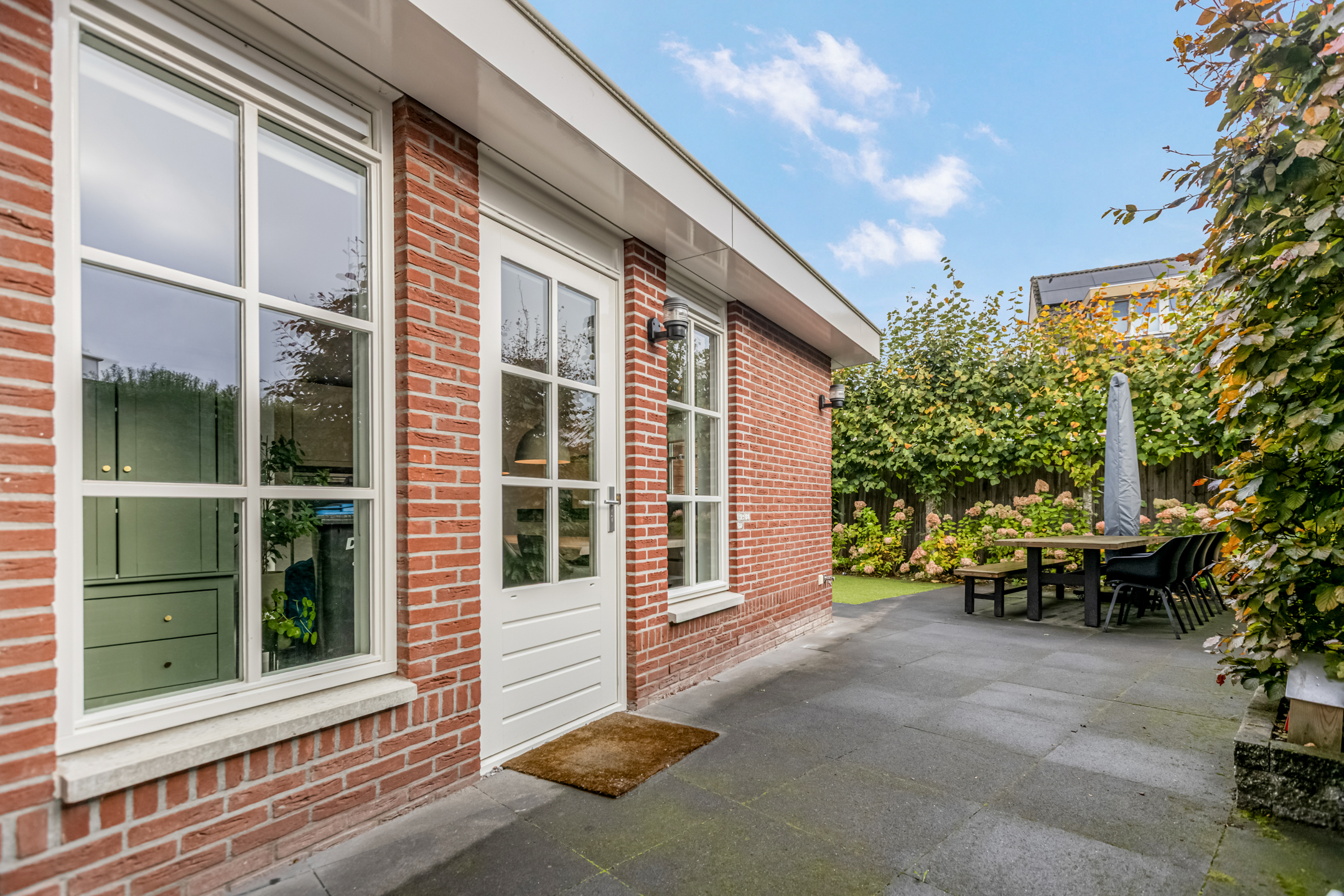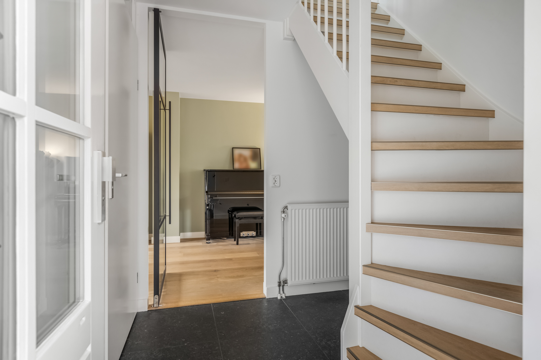 De royale woonkamer is sfeervol afgewerkt met een eikenhouten vloer en beschikt over een lichte serre, waardoor het natuurlijke daglicht rijkelijk binnenvalt. De woonkamer staat in open verbinding met de ruime woonkeuken, wat zorgt voor een harmonieuze en open indeling. Via openslaande deuren is de fraai aangelegde achtertuin direct toegankelijk, waardoor binnen en buiten op aangename wijze in elkaar overlopen. De woonkeuken biedt ruimschoots plaats voor een grote eethoek, is voorzien van vloerverwarming, airconditioning en verleent directe toegang tot de achtertuin. De keuken is luxueus uitgevoerd met veel bergruimte in een royale kastenwand, een natuurstenen aanrechtblad en hoogwaardige inbouwapparatuur, waaronder een Quooker, inductiekookplaat, combi-magnetron, oven, vaatwasser en afzuigkap. De voormalige garage is zowel vanuit de keuken als vanaf de oprit toegankelijk en is op smaakvolle wijze ingericht als was- en bergruimte, voorzien van een grote vaste kast. Dit zorgt voor extra functionele leefruimte en wooncomfort.