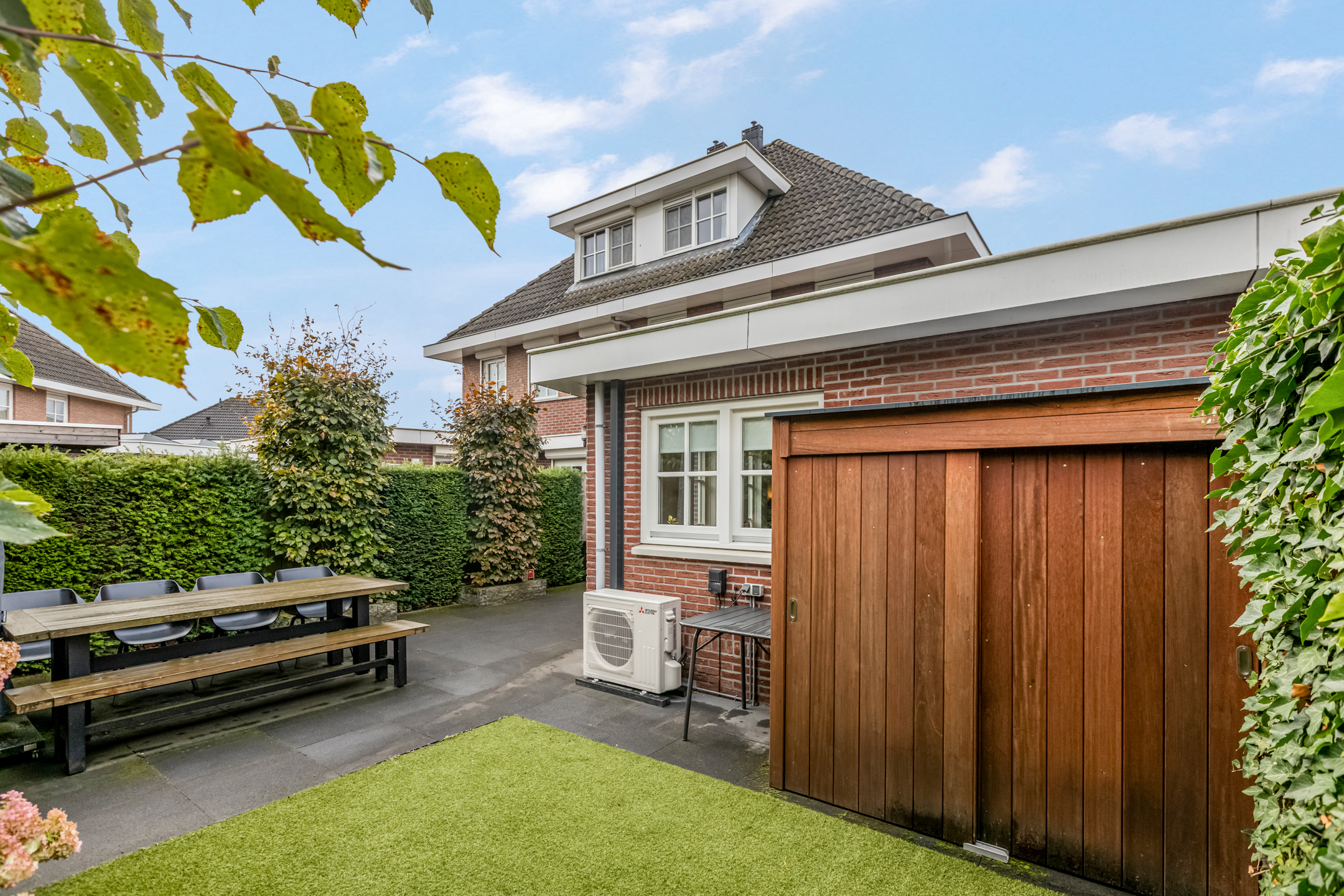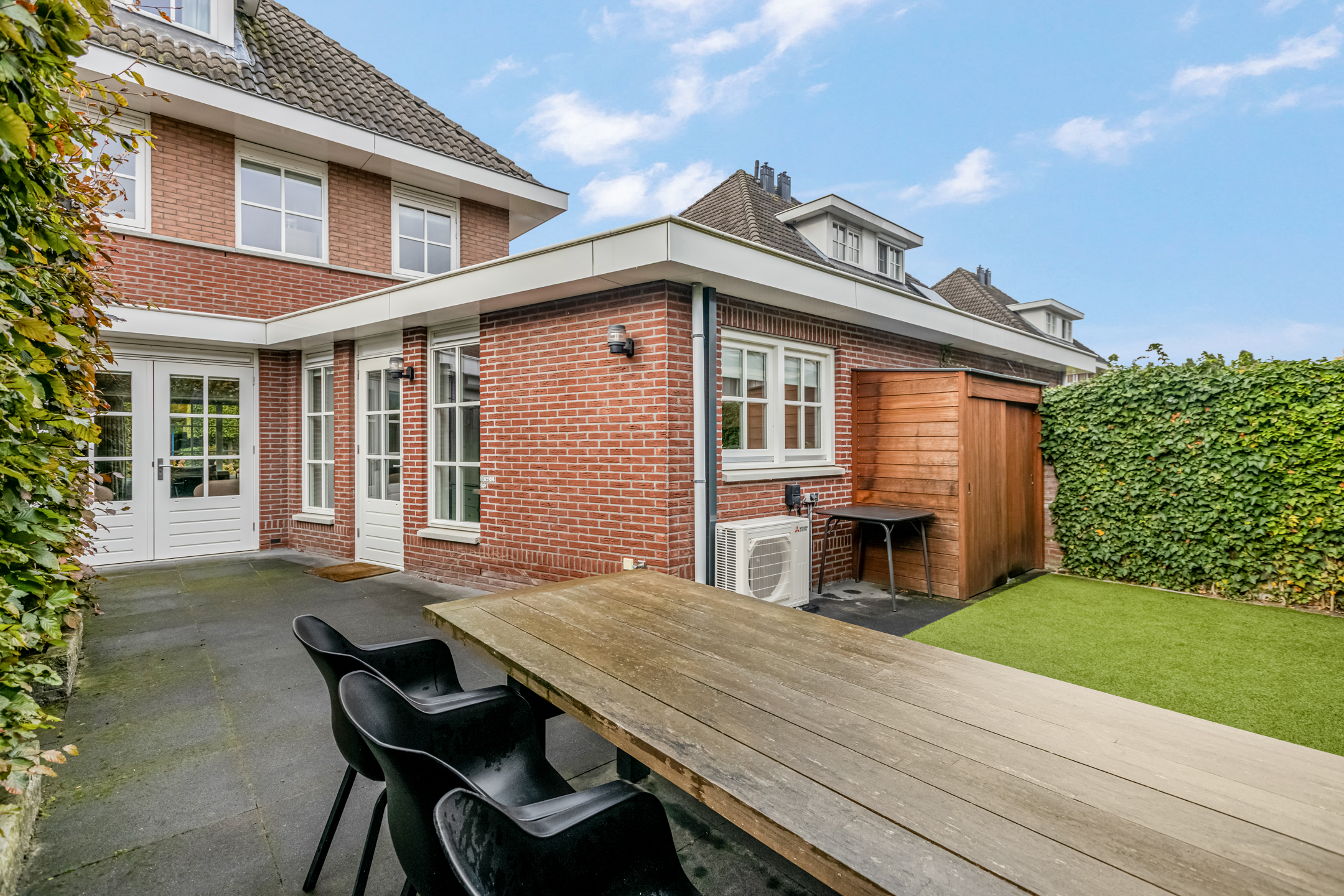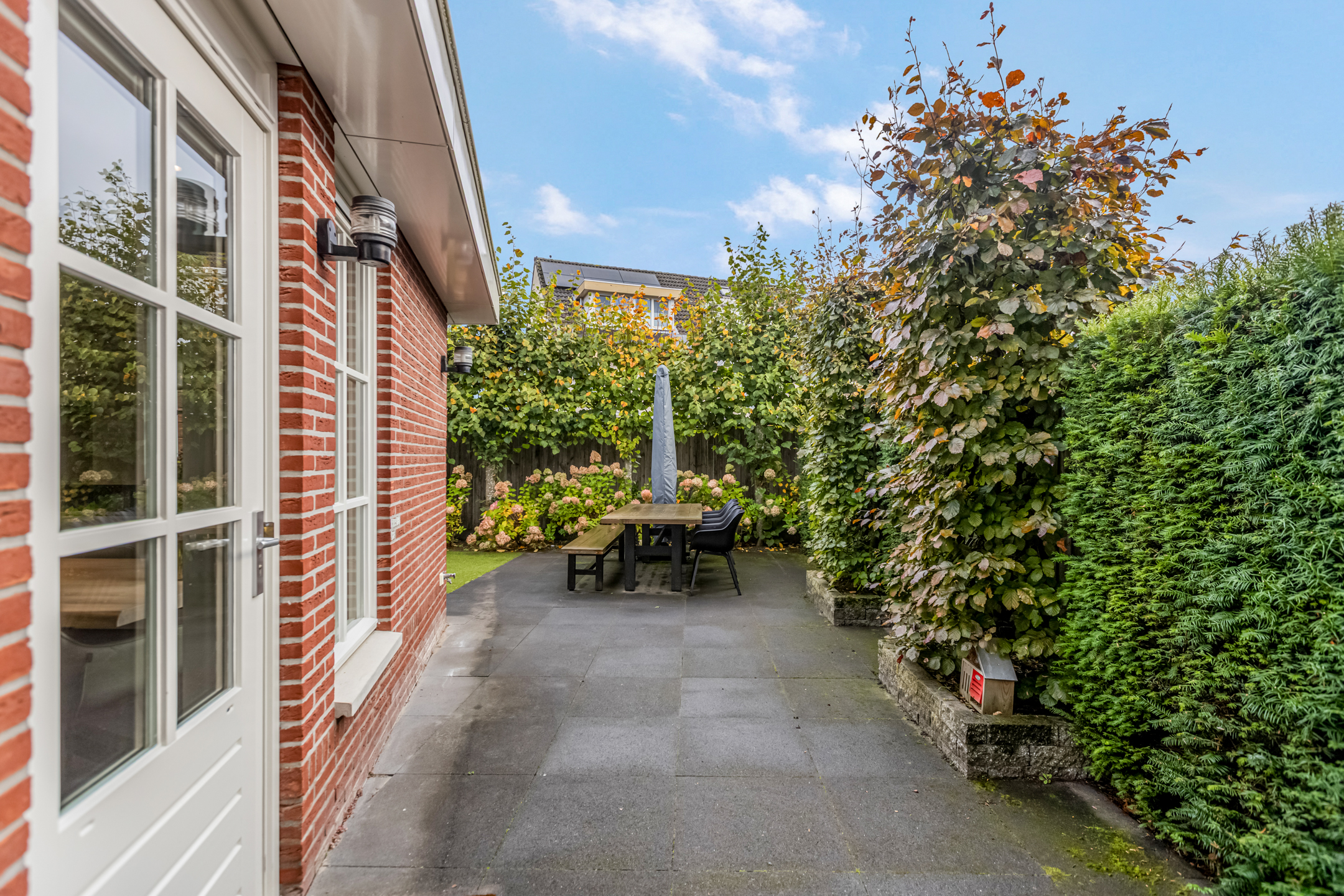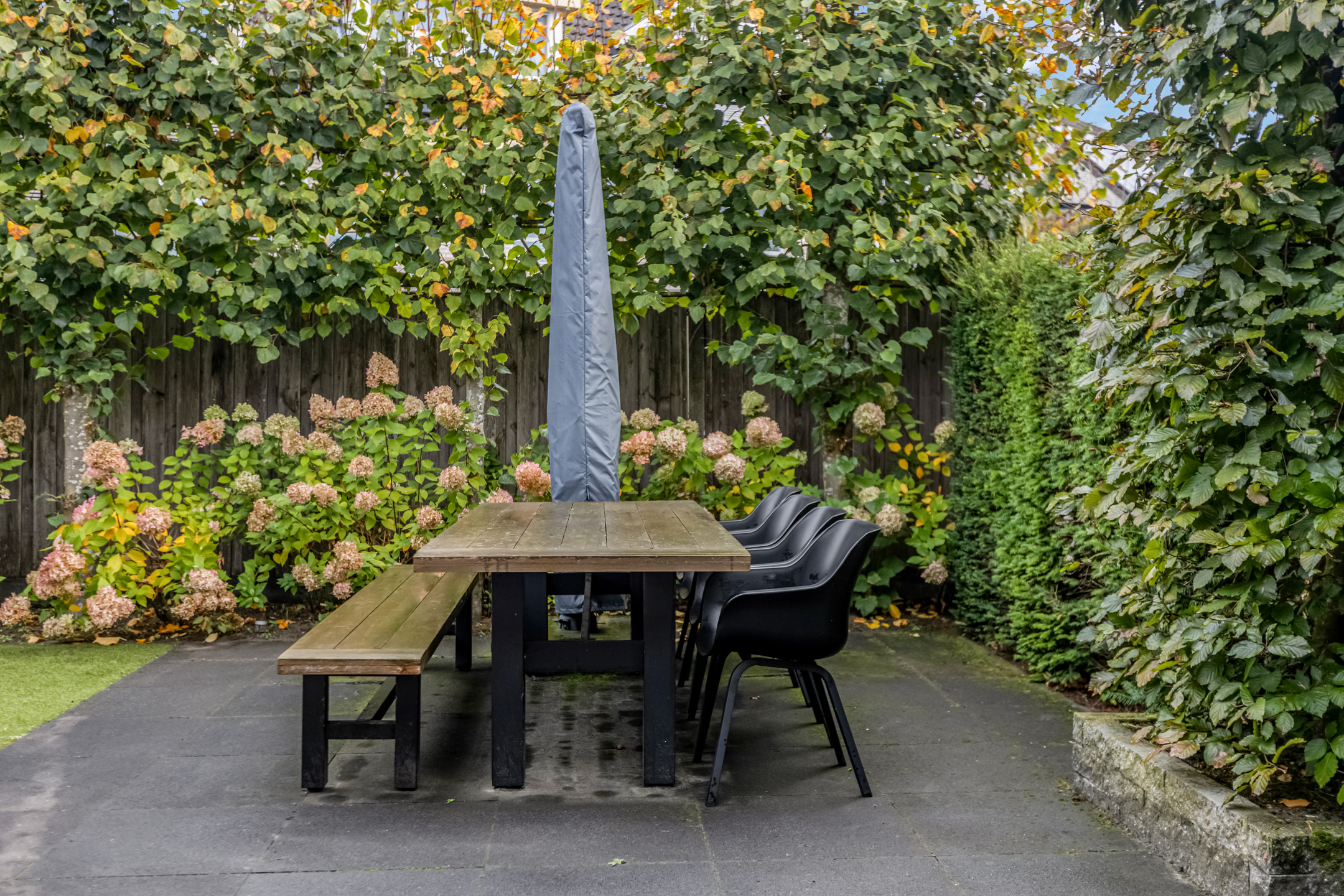 De op het noordoosten gelegen achtertuin is fraai aangelegd, keurig onderhouden en biedt veel privacy. Dankzij de verzorgde beplanting en het nette terras is het hier heerlijk vertoeven. Een praktische bergkast biedt extra opbergruimte voor tuingereedschap en overige benodigdheden.