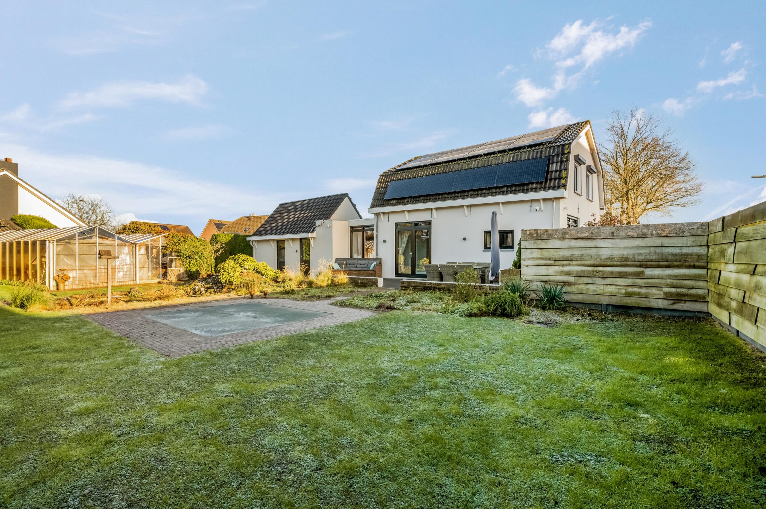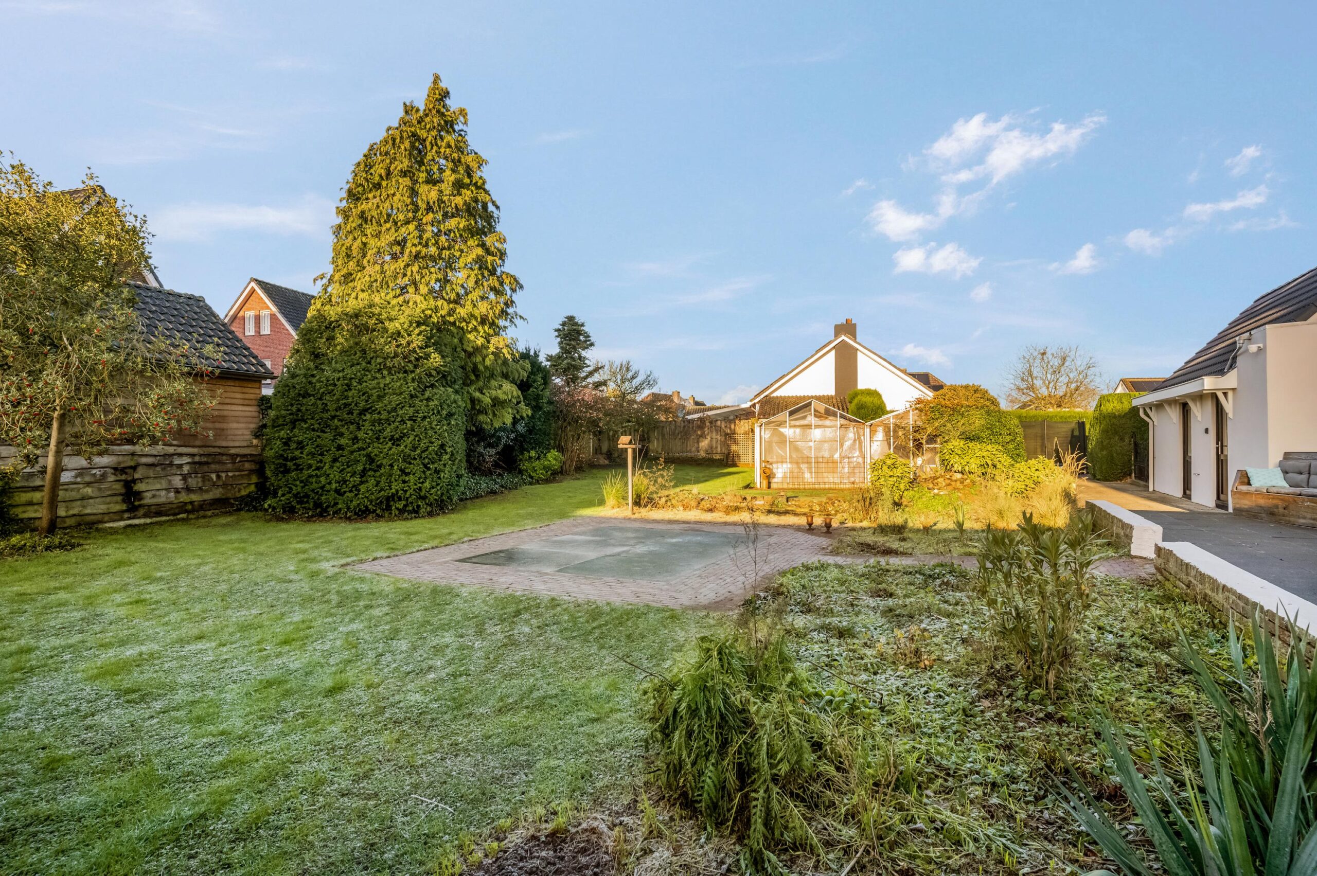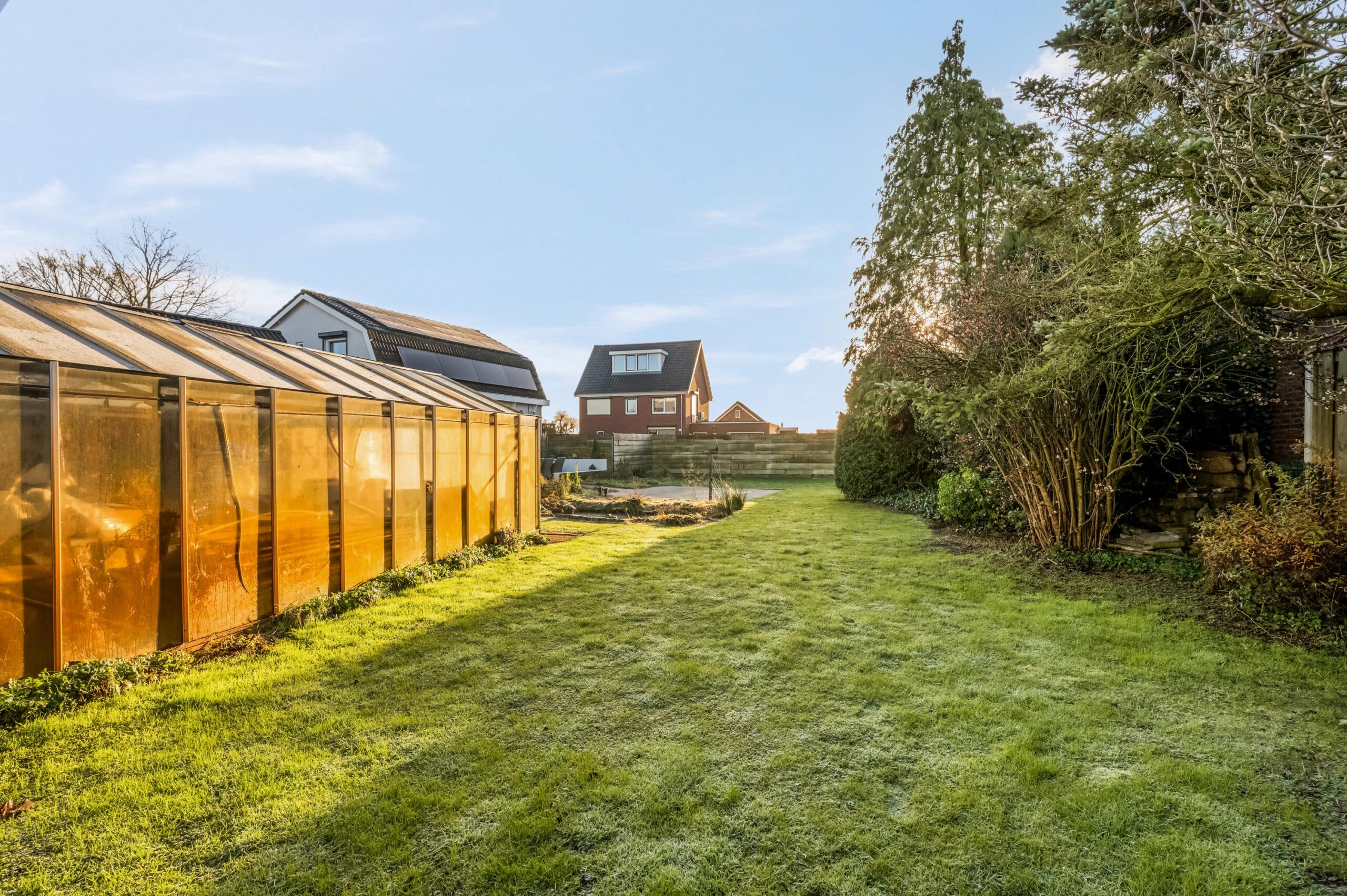 De woning beschikt over een royale tuin rondom, met een aangebouwde berging voorzien van authentieke stalramen, een grote kas en een houthok, hetgeen deze locatie uitermate geschikt maakt voor de tuinliefhebber. Aan de zijkant van de woning is voldoende ruimte om meerdere auto’s op eigen terrein te parkeren. De tuin is verzorgd en doordacht aangelegd met diverse borders, een tuinhuisje en een speelgedeelte voor kinderen, waardoor ontspanning en praktisch gebruik op harmonieuze wijze samenkomen. Ten aanzien van een aangrenzende strook grond langs de rand van de weg is een bruikleenovereenkomst met de gemeente van toepassing.