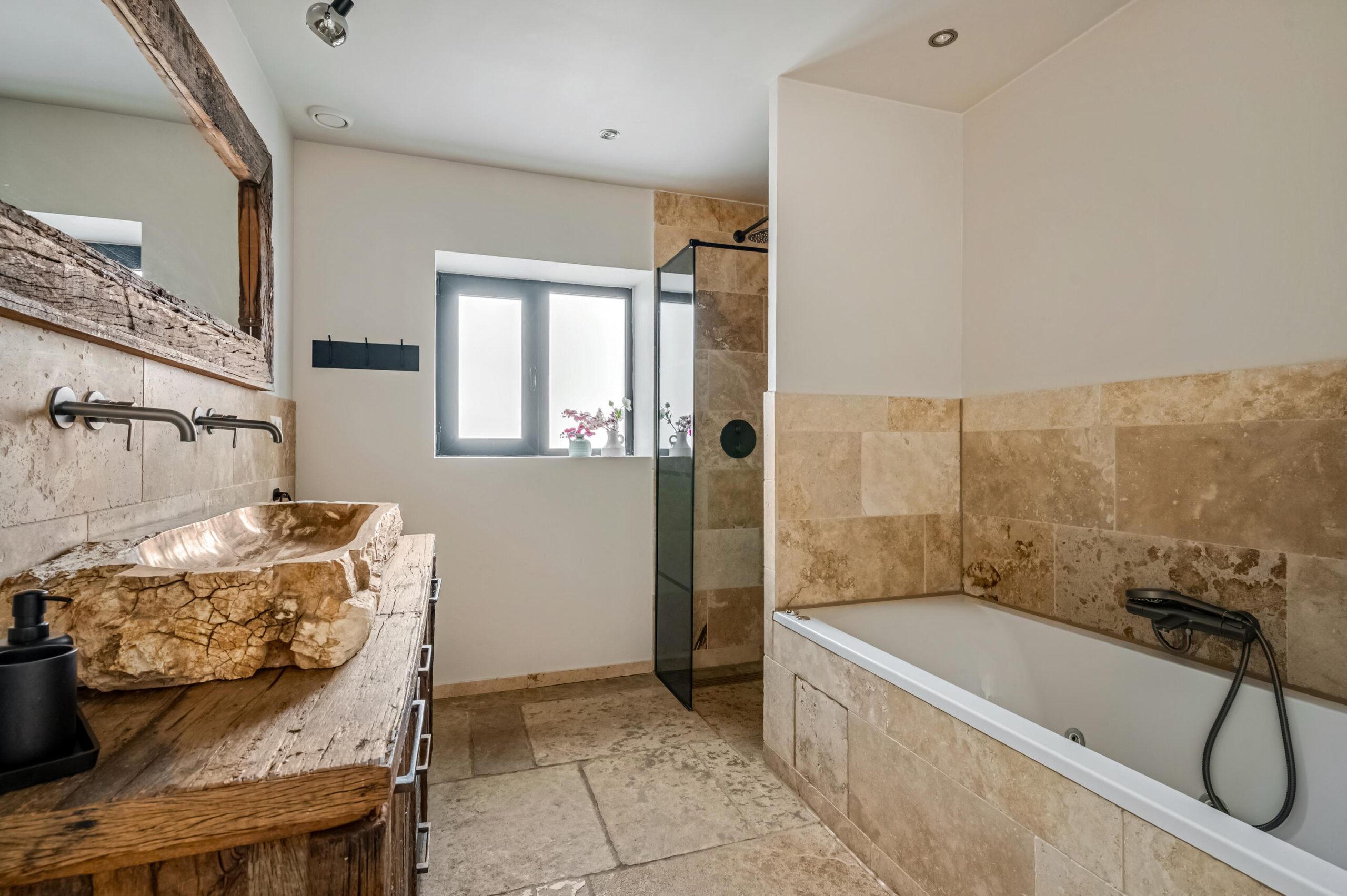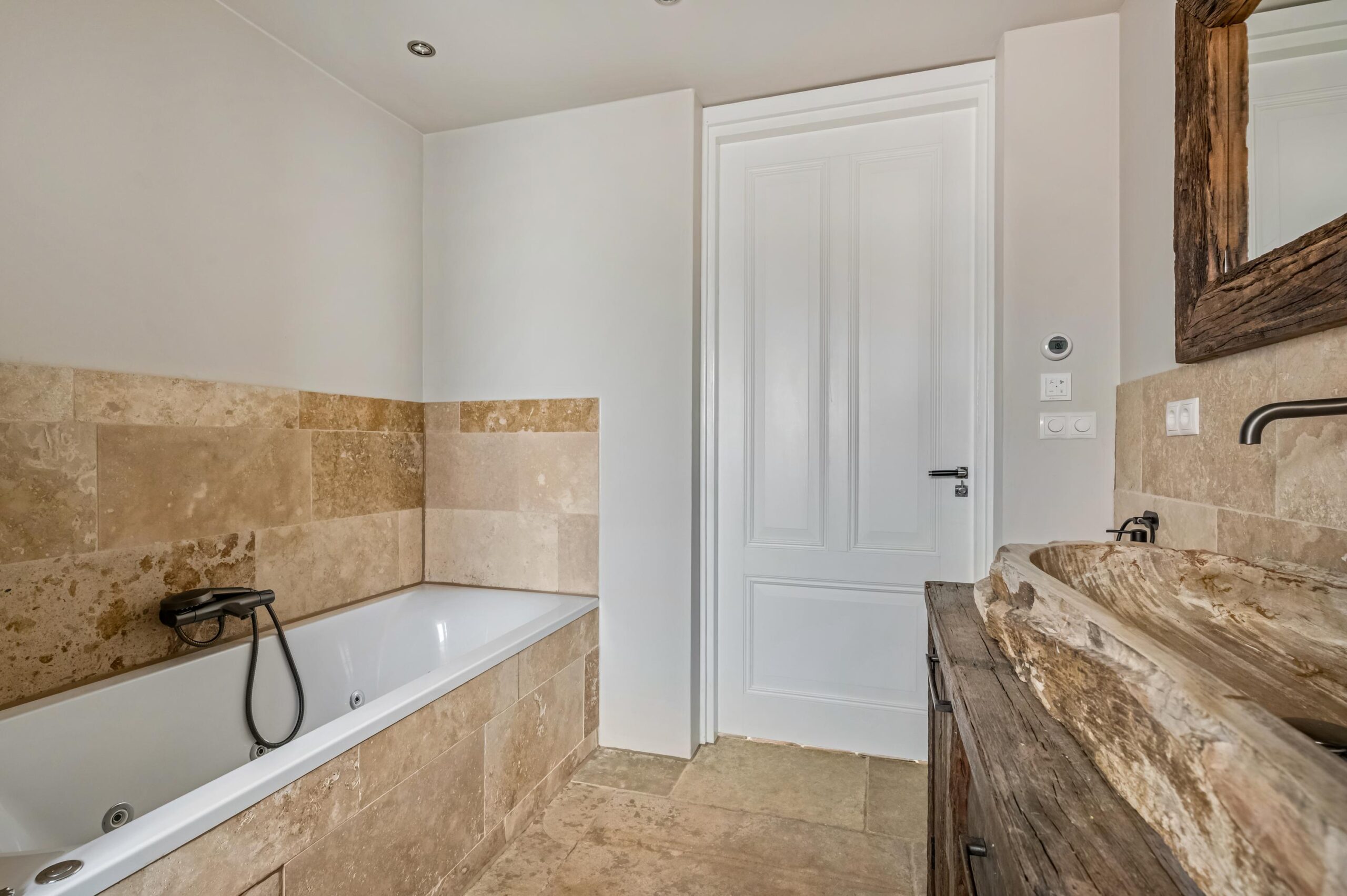 - Ligbad, dubbele wastafel, wastafelmeubel, inloopdouche, vloerverwarming, whirlpool