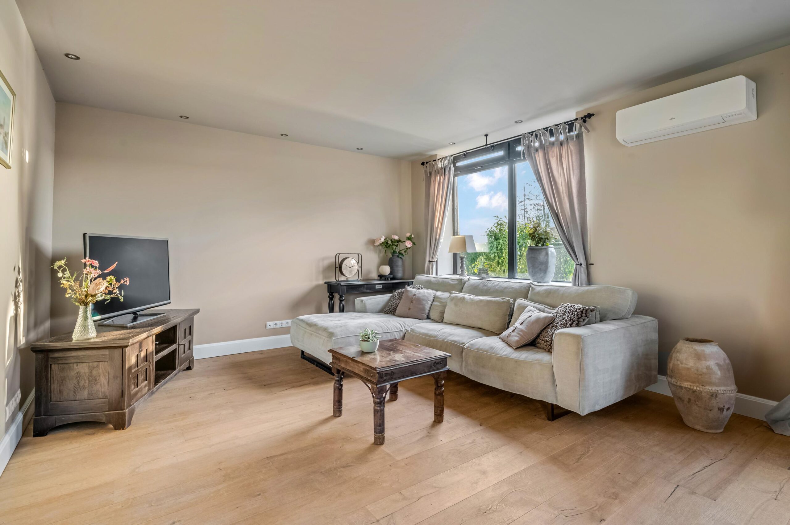 Entree, royale hal met meterkast, trapopgang naar de verdieping en toegang tot de toiletruimte, voorzien van een modern hangcloset en een fonteintje, alsmede tot de badkamer en de woonkamer. De badkamer is voorzien van een ligbad met whirlpoolfunctie, een royale inloopdouche met regendouche en een dubbel wastafelmeubel. De sfeervolle, L-vormige woonkamer is gesitueerd aan de achterzijde van de woning en geniet van een aangename lichtinval dankzij de grote raampartijen. De ruimte is afgewerkt met een airco, eikenhouten lamelparketvloer en beschikt over openslaande deuren naar de tuin. Vanuit de woonkamer is er toegang tot zowel de kelder als de keuken. De moderne keuken beschikt over een zitvensterbank en is voorzien van diverse inbouwapparatuur, waaronder een 5-pits inductiekookplaat, oven, vaatwasser en koelkast. Aangrenzend bevindt zich de praktische bijkeuken met directe toegang tot de tuin, een stortbak, witgoedaansluitingen en een vaste kast waarin de cv-installatie en warmtepomp zijn opgesteld. De gehele begane grond, inclusief de bijkeuken, is voorzien van vloerverwarming.