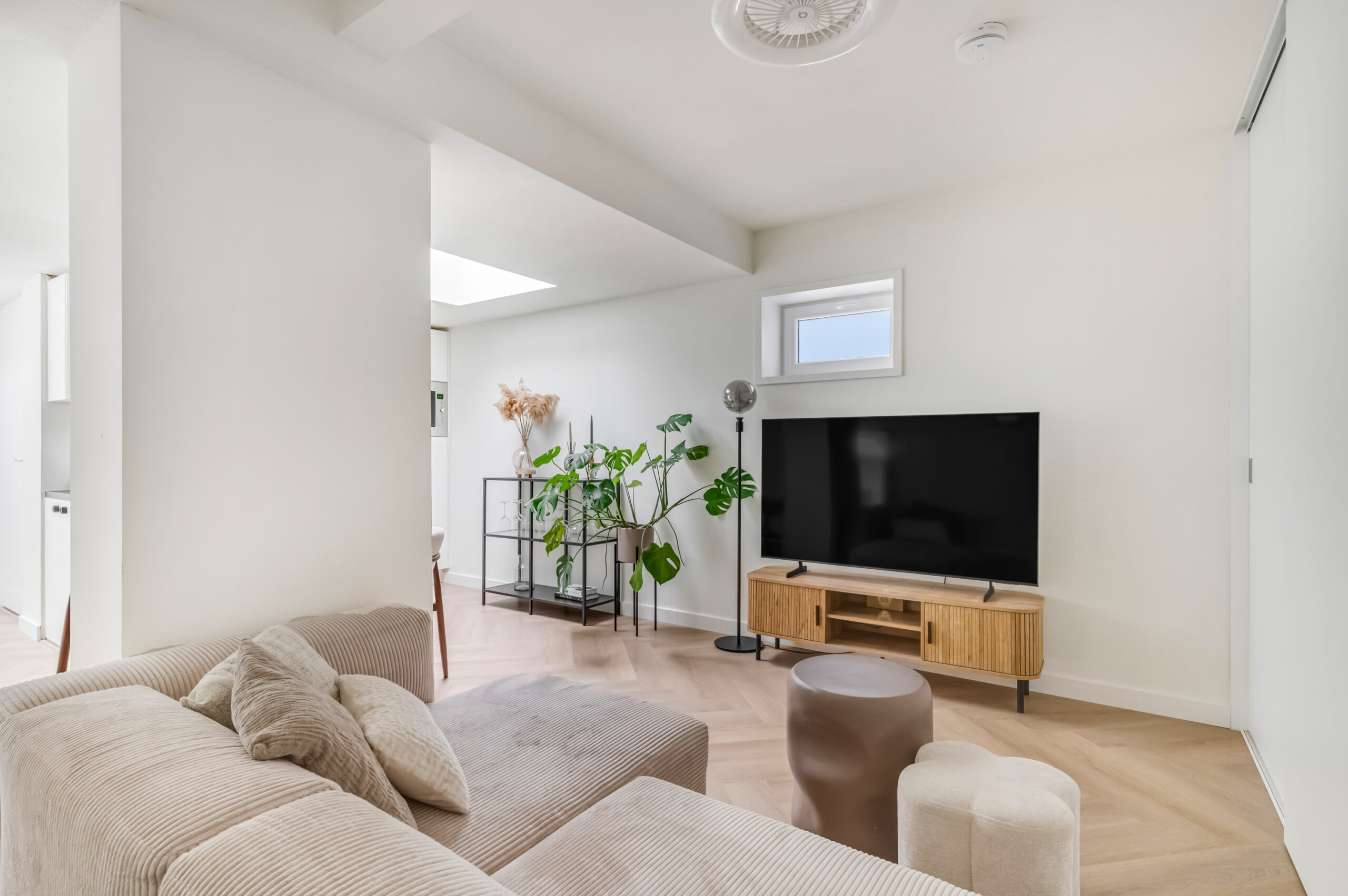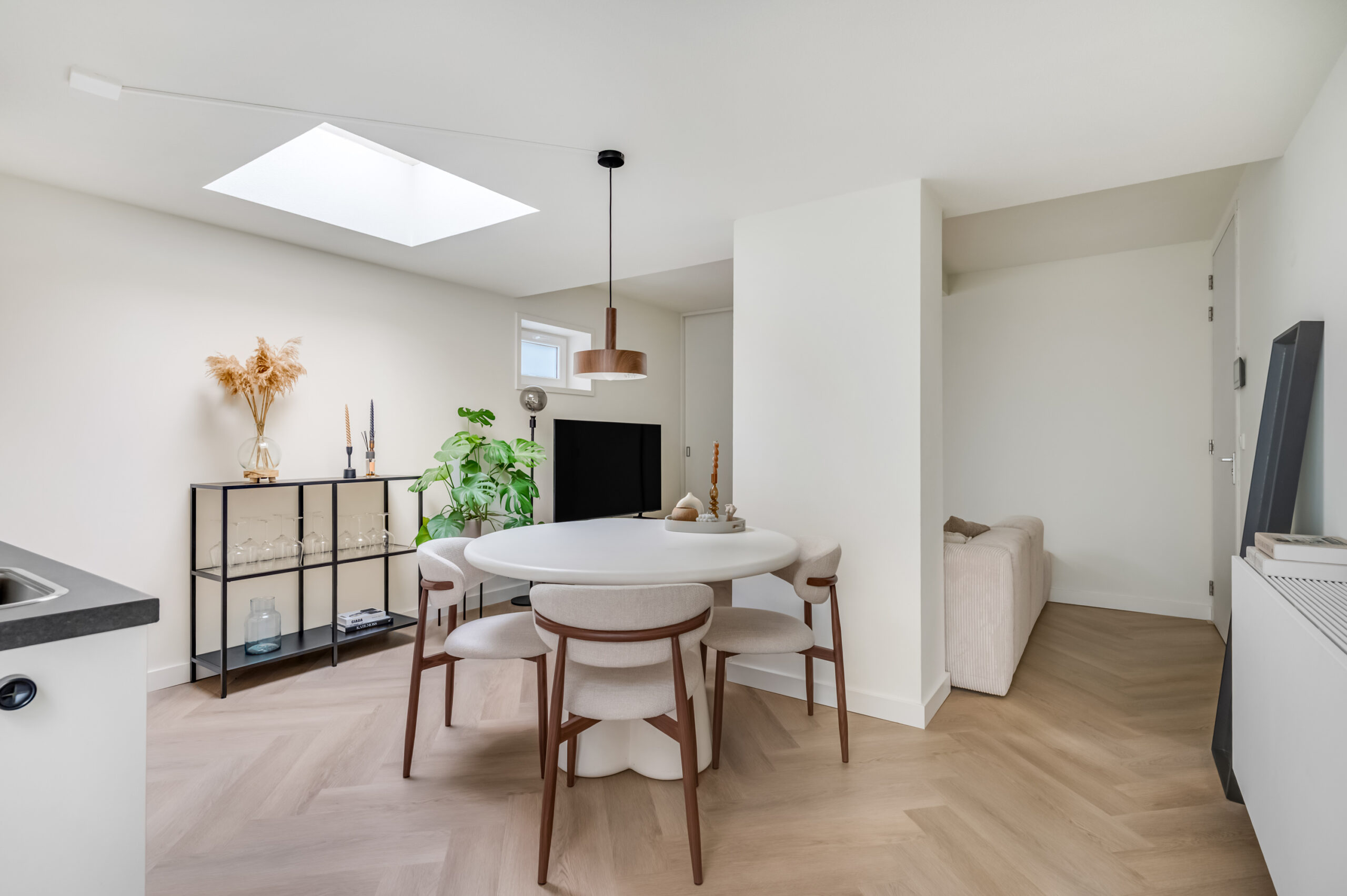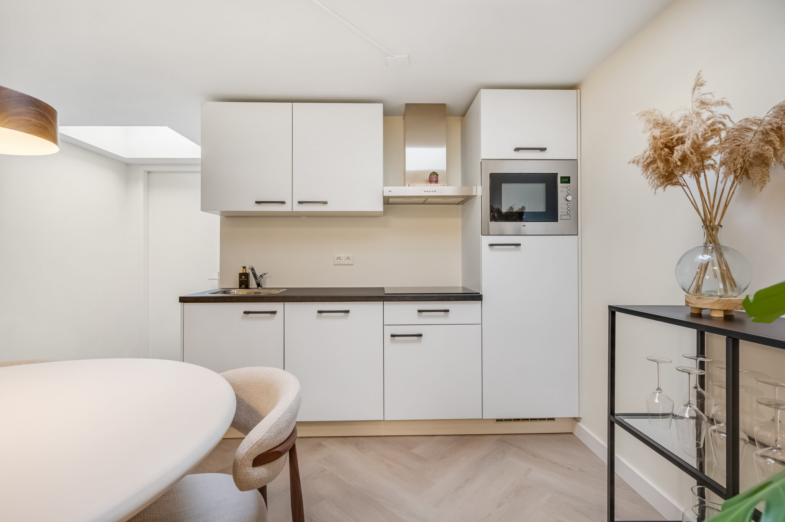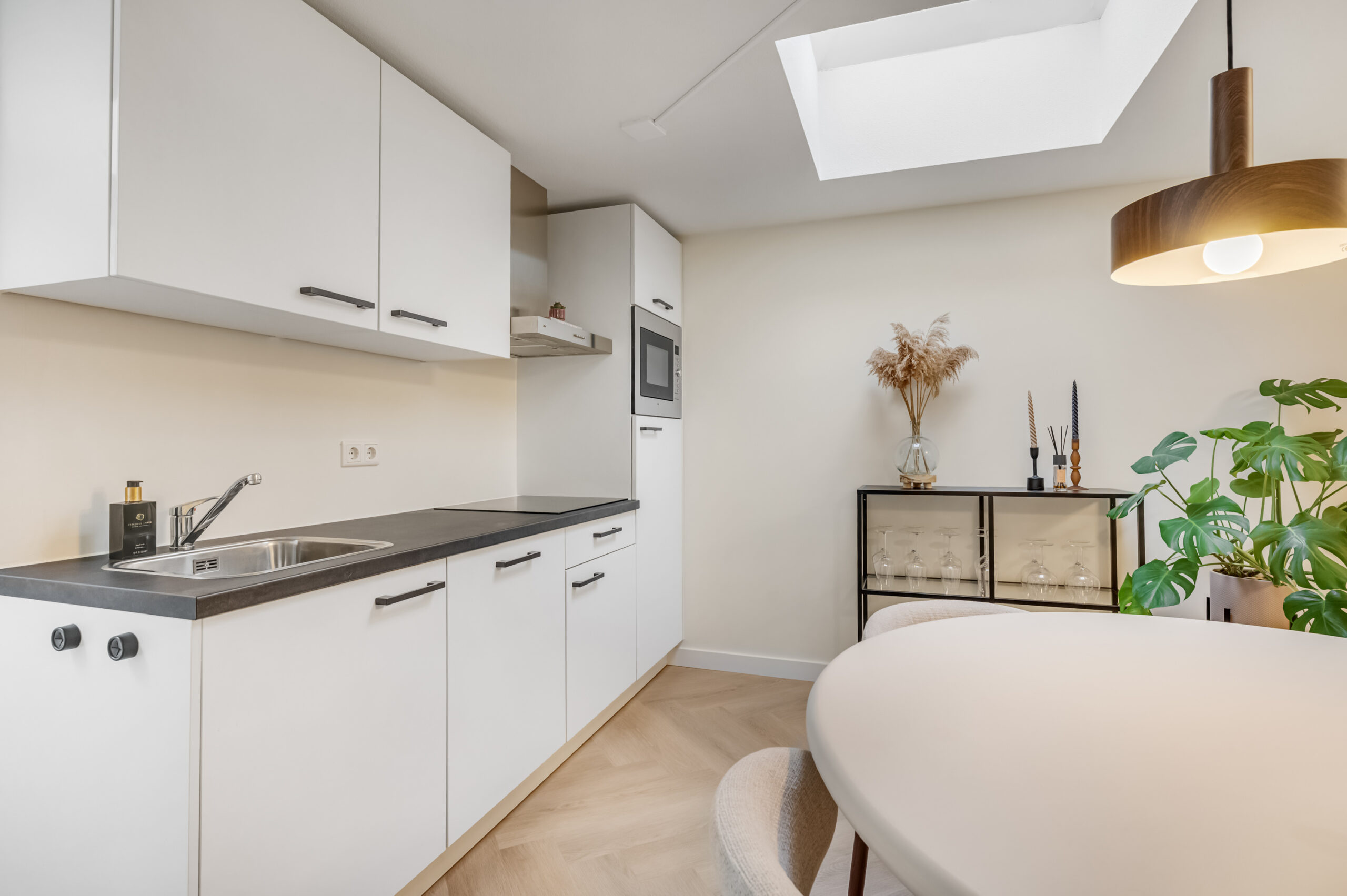 Bij binnenkomst betreed je direct de uitnodigende woonkamer met open keuken. De woonkamer geniet van een prettige natuurlijke lichtinval dankzij de lichtkoepel en is praktisch ingedeeld met een ingebouwde kast waarin de witgoedopstelling is ondergebracht, aangevuld met bergruimte. De open keuken vormt een stijlvol geheel met de woonruimte en is uitgerust met moderne inbouwapparatuur, waaronder een close-in boiler, inductiekookplaat, afzuigkap, combimagnetron, vaatwasser en een koelkast. Een compacte tussenhal leidt naar de badkamer en de slaapkamer en is eveneens voorzien van een lichtkoepel, wat zorgt voor mooi lichtinval. De badkamer is hoogwaardig afgewerkt en beschikt over een inloopdouche, wastafelmeubel, hangcloset, designradiator en mechanische ventilatie met sensor. De slaapkamer is gelegen aan de achterzijde van het appartement en profiteert eveneens van natuurlijke lichtinval via een lichtkoepel. Het gehele appartement is afgewerkt met een fraaie PVC-vloer, met uitzondering van de badkamer, wat bijdraagt aan een verzorgde en eigentijdse uitstraling.