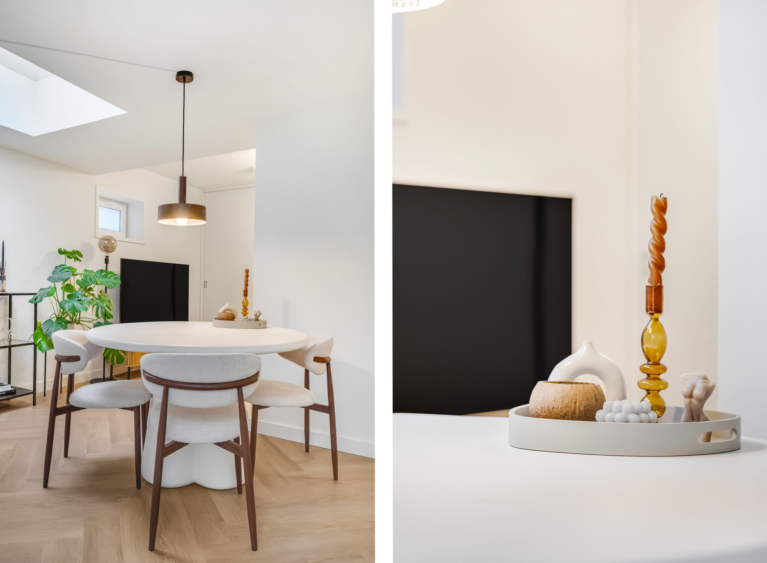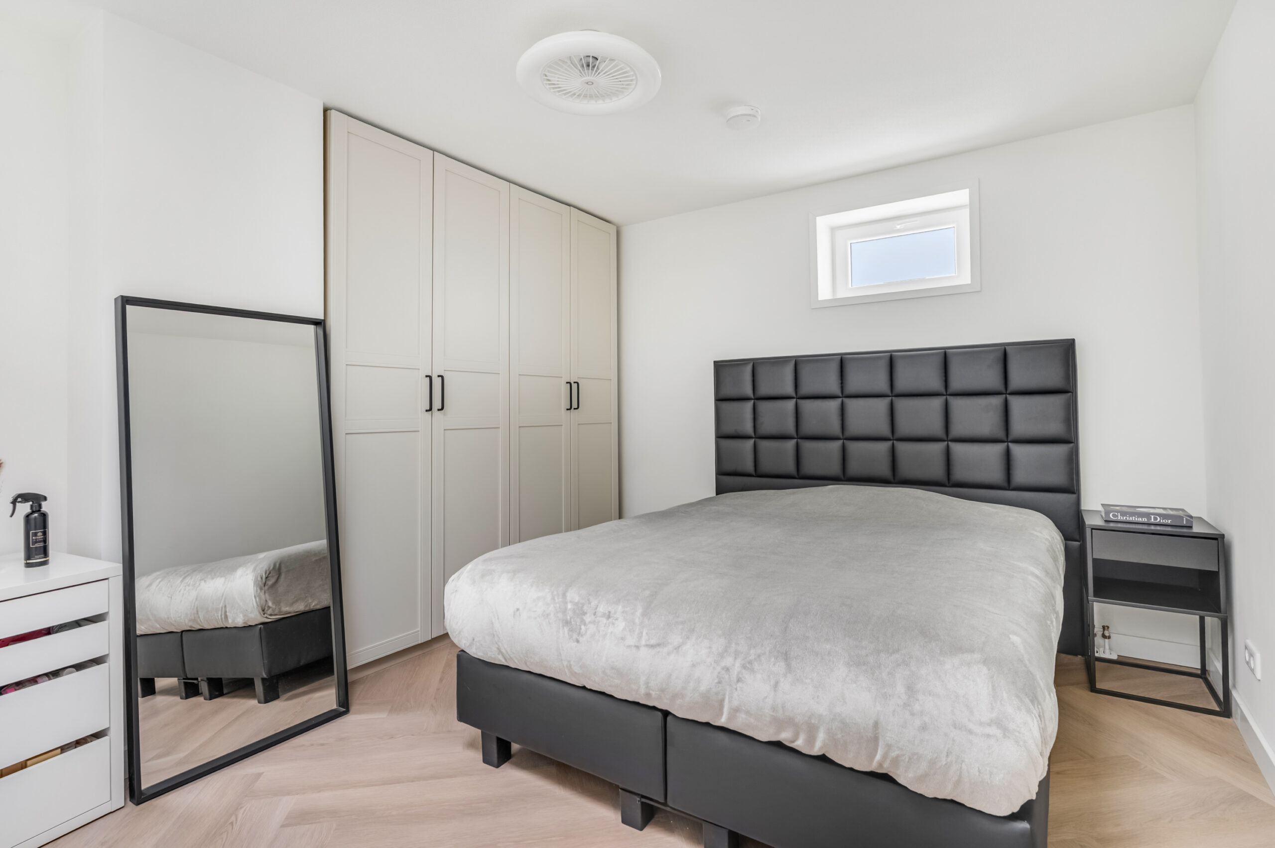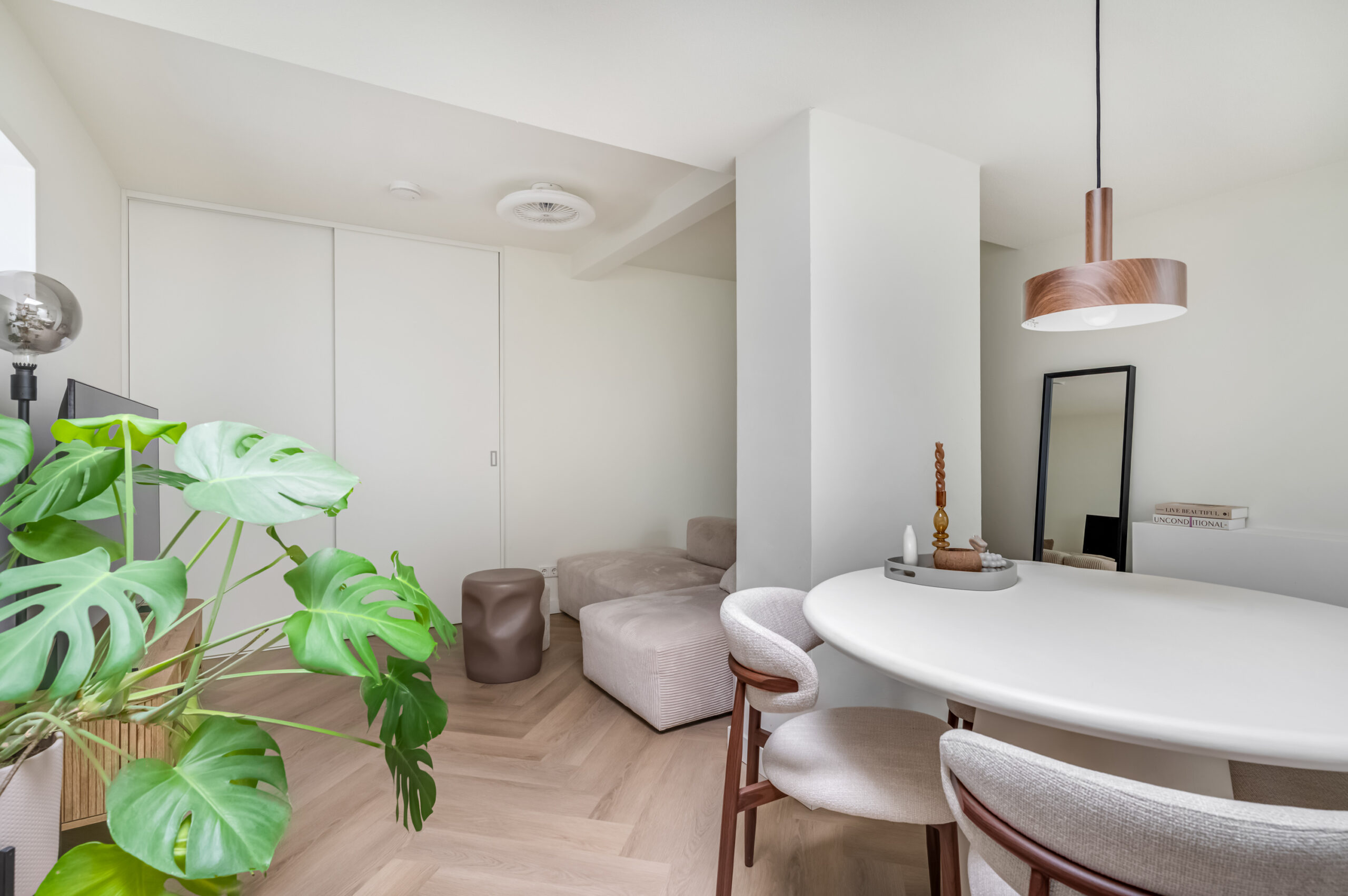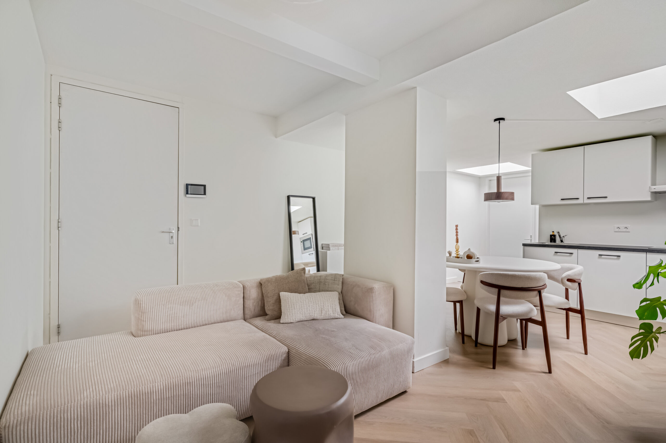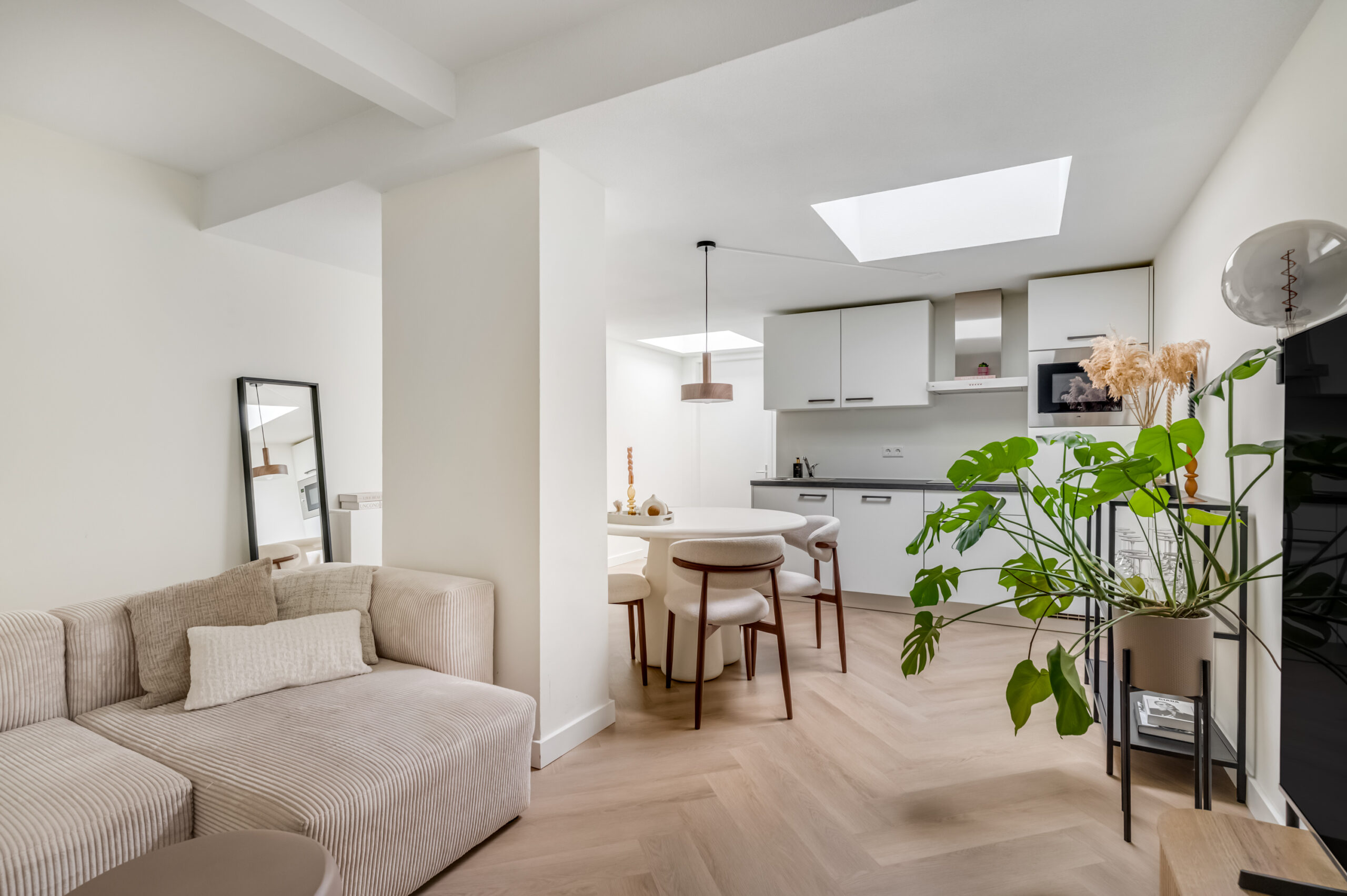 Bij binnenkomst betreed je direct de uitnodigende woonkamer met open keuken. De woonkamer geniet van een prettige natuurlijke lichtinval dankzij de lichtkoepel en is praktisch ingedeeld met een ingebouwde kast waarin de witgoedopstelling is ondergebracht, aangevuld met bergruimte. De open keuken vormt een stijlvol geheel met de woonruimte en is uitgerust met moderne inbouwapparatuur, waaronder een close-in boiler, inductiekookplaat, afzuigkap, combimagnetron, vaatwasser en een koelkast. Een compacte tussenhal leidt naar de badkamer en de slaapkamer en is eveneens voorzien van een lichtkoepel, wat zorgt voor mooi lichtinval. De badkamer is hoogwaardig afgewerkt en beschikt over een inloopdouche, wastafelmeubel, hangcloset, designradiator en mechanische ventilatie met sensor. De slaapkamer is gelegen aan de achterzijde van het appartement en profiteert eveneens van natuurlijke lichtinval via een lichtkoepel. Het gehele appartement is afgewerkt met een fraaie PVC-vloer, met uitzondering van de badkamer, wat bijdraagt aan een verzorgde en eigentijdse uitstraling.