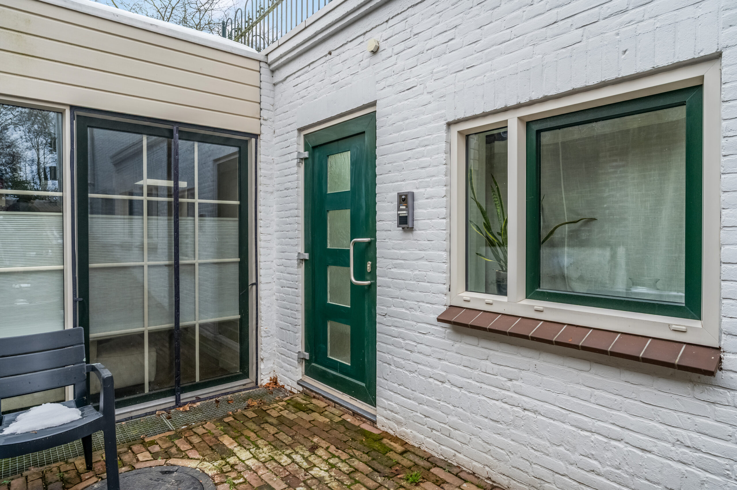 De aan de zijkant gelegen trap wordt in overleg door de leden van de VvE gebruikt als buitenruimte.