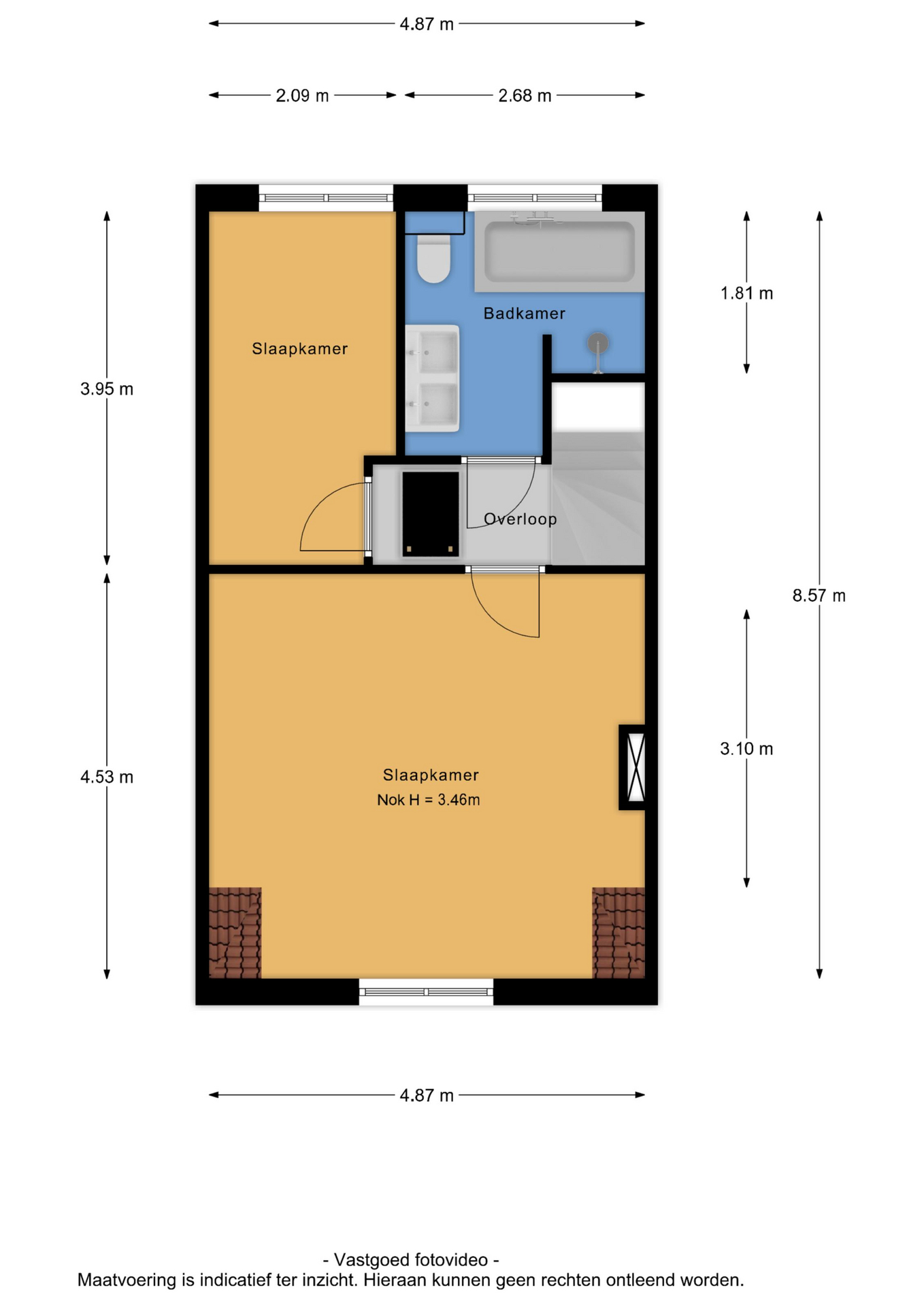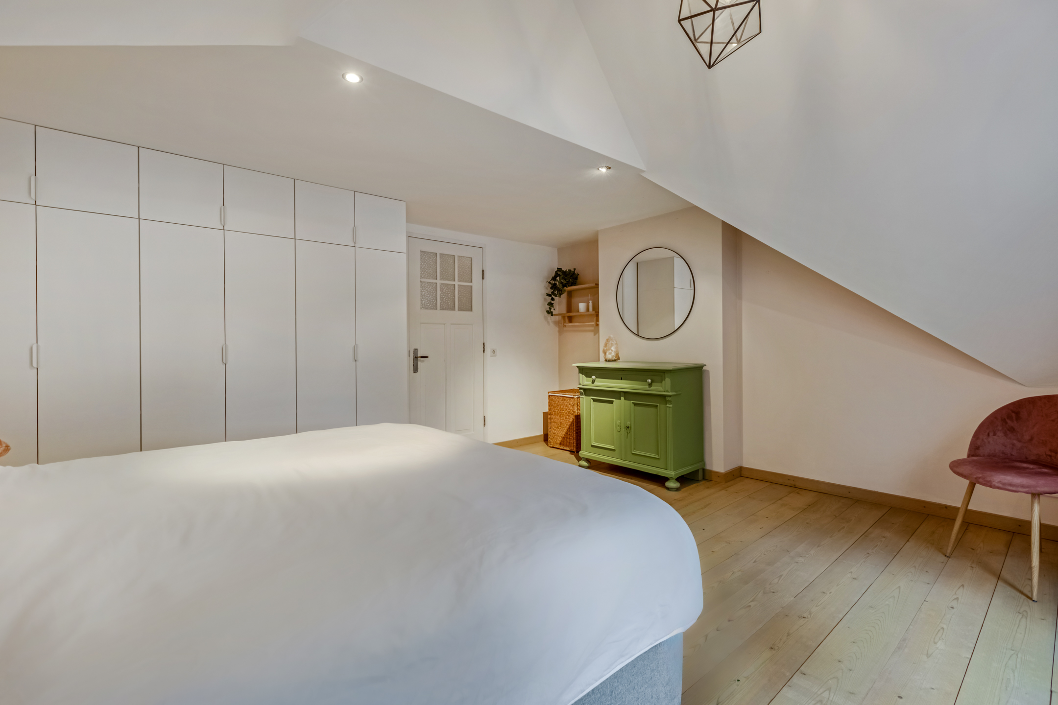 De overloop biedt toegang tot twee slaapkamers, de badkamer en de vliering. De slaapkamer aan de voorzijde is voorzien van fraaie gevelvensters, die zorgen voor een prettige en natuurlijke lichtinval. De slaapkamer aan de achterzijde biedt een mooi uitzicht op de diepe achtertuin. De moderne badkamer is compleet uitgevoerd en voorzien van een ligbad, inloopdouche, hangcloset en een dubbel wastafelmeubel. Zowel de slaapkamers als de overloop zijn afgewerkt met een eikenhouten lamelparketvloer, wat bijdraagt aan een warme en verzorgde uitstraling.