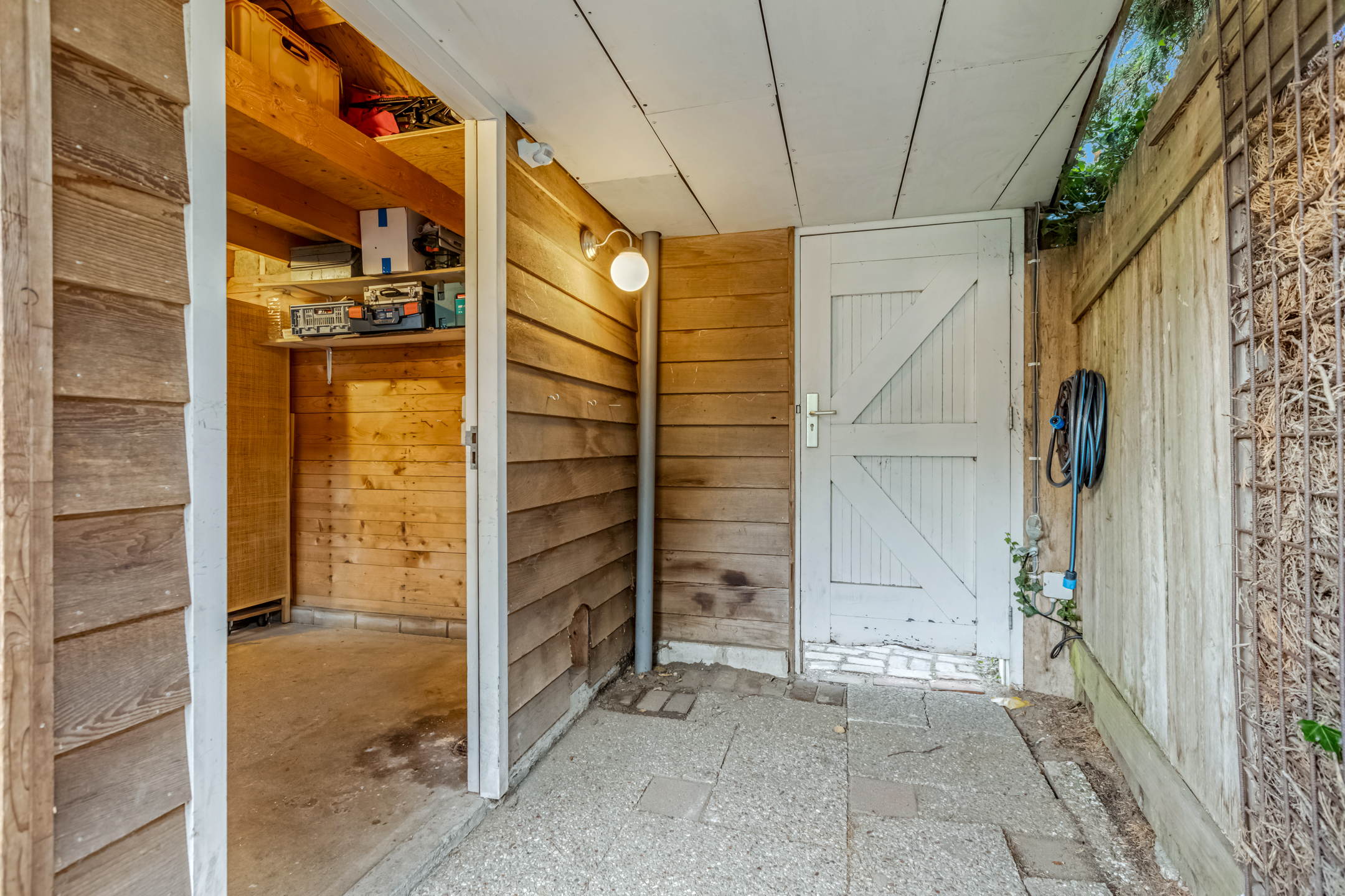 De achtertuin, gelegen op het noordwesten, combineert privacy met royale afmetingen, waardoor je hier op ieder moment van een zonnige dag kunt genieten van een aangename plek in de zon. Daarmee is de tuin niet slechts een buitenruimte, maar een volwaardig verlengstuk van het wooncomfort. De tuin is voorzien van een knusse pergola en een royale berging met overkapping, geschikt voor uiteenlopende doeleinden zoals hobby’s, extra opslag of ontspannen buiten zitten. Via de achterom bereik je bovendien moeiteloos de eigen garagebox, discreet om de hoek gesitueerd—een praktisch en comfortabel extra. De achterom biedt directe toegang tot de Antiloopstraat, gelegen in de zeer geliefde wijk Hazenkamp.
