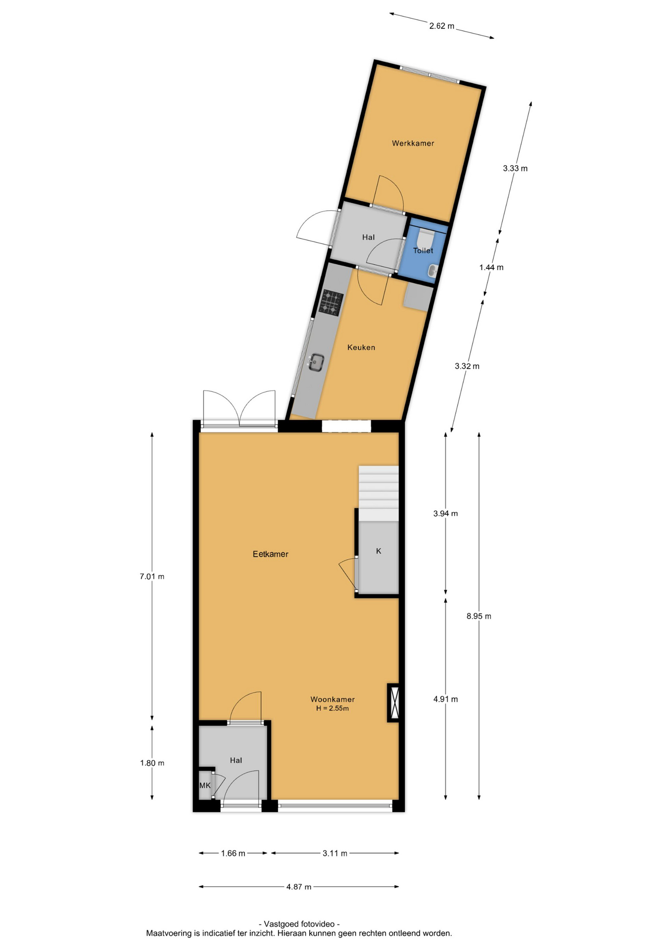 Entree, hal met meterkast en een garderobenis, toegang tot de woonkamer. De royale woonkamer onderscheidt zich door een fraaie eikenhouten vloer, veel daglicht en een prettige indeling. Openslaande deuren verbinden de woonkamer met de tuin, terwijl de houtkachel zorgt voor extra sfeer en comfort. Daarnaast is er een praktische trapkast voor extra bergruimte. De halfopen keuken, gelegen aan de achterzijde van de woning, is functioneel ingericht en voorzien van een royaal aanrechtblad en diverse apparatuur, waaronder een 4-pits gaskookplaat, oven, afzuigschouw, vaatwasser en koel-/vriescombinatie. Aansluitend bevindt zich een tweede hal, die toegang geeft tot de toiletruimte met dakkoepel, hangcloset en fonteintje, evenals tot een slaap-/werkkamer. Deze kamer beschikt over een witgoedopstelplaats. Vanuit de hal heb je bovendien directe toegang tot de achtertuin.