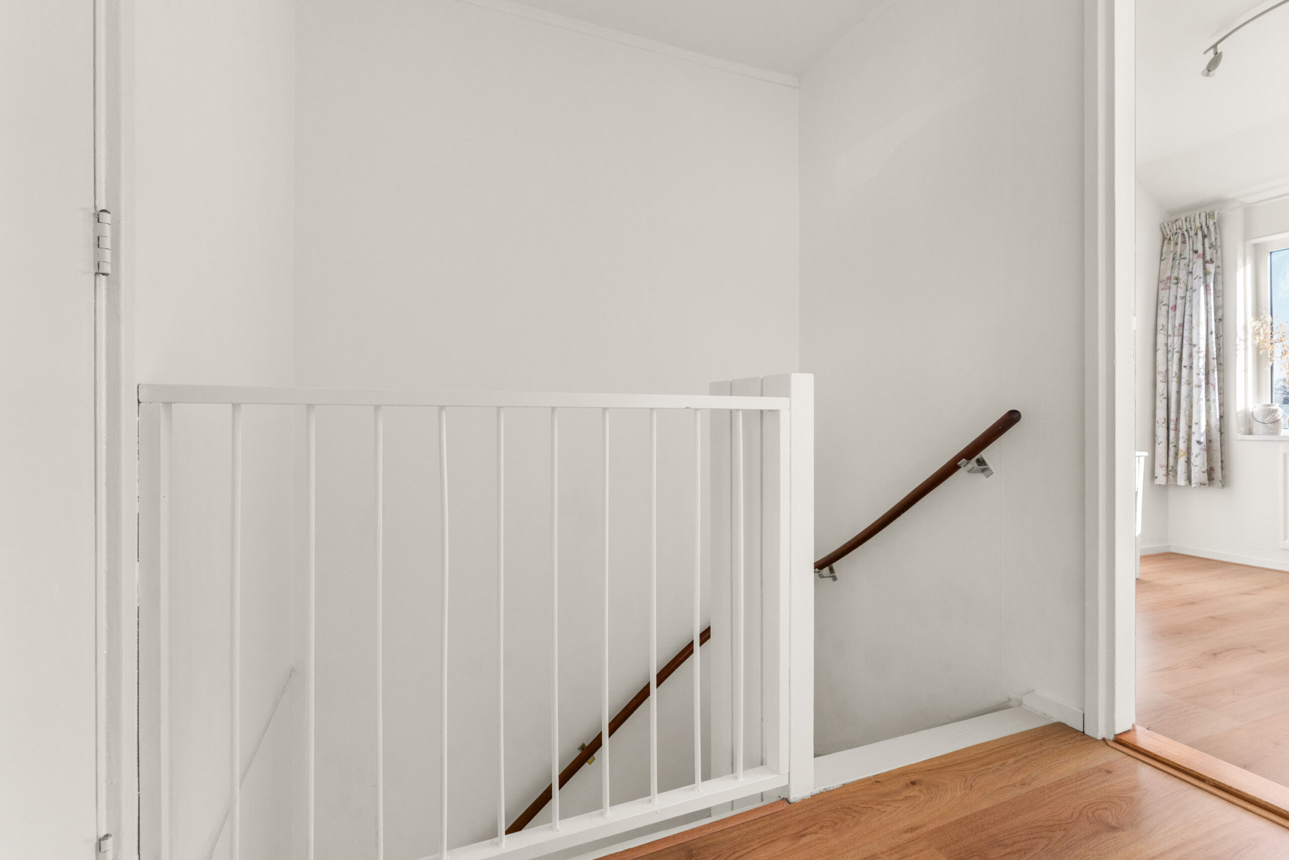 Overloop, toegang tot drie slaapkamers, de badkamer en de vliering.