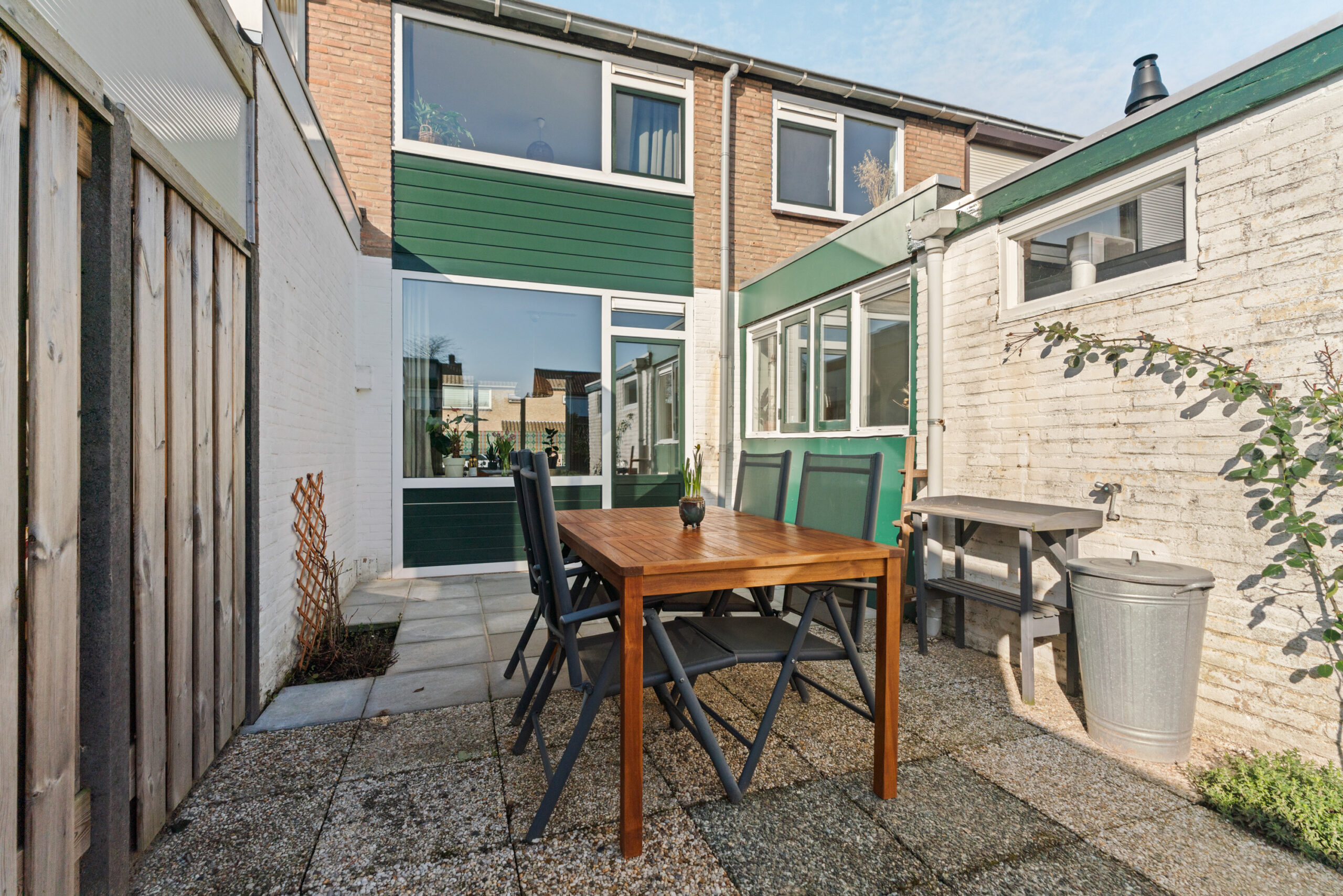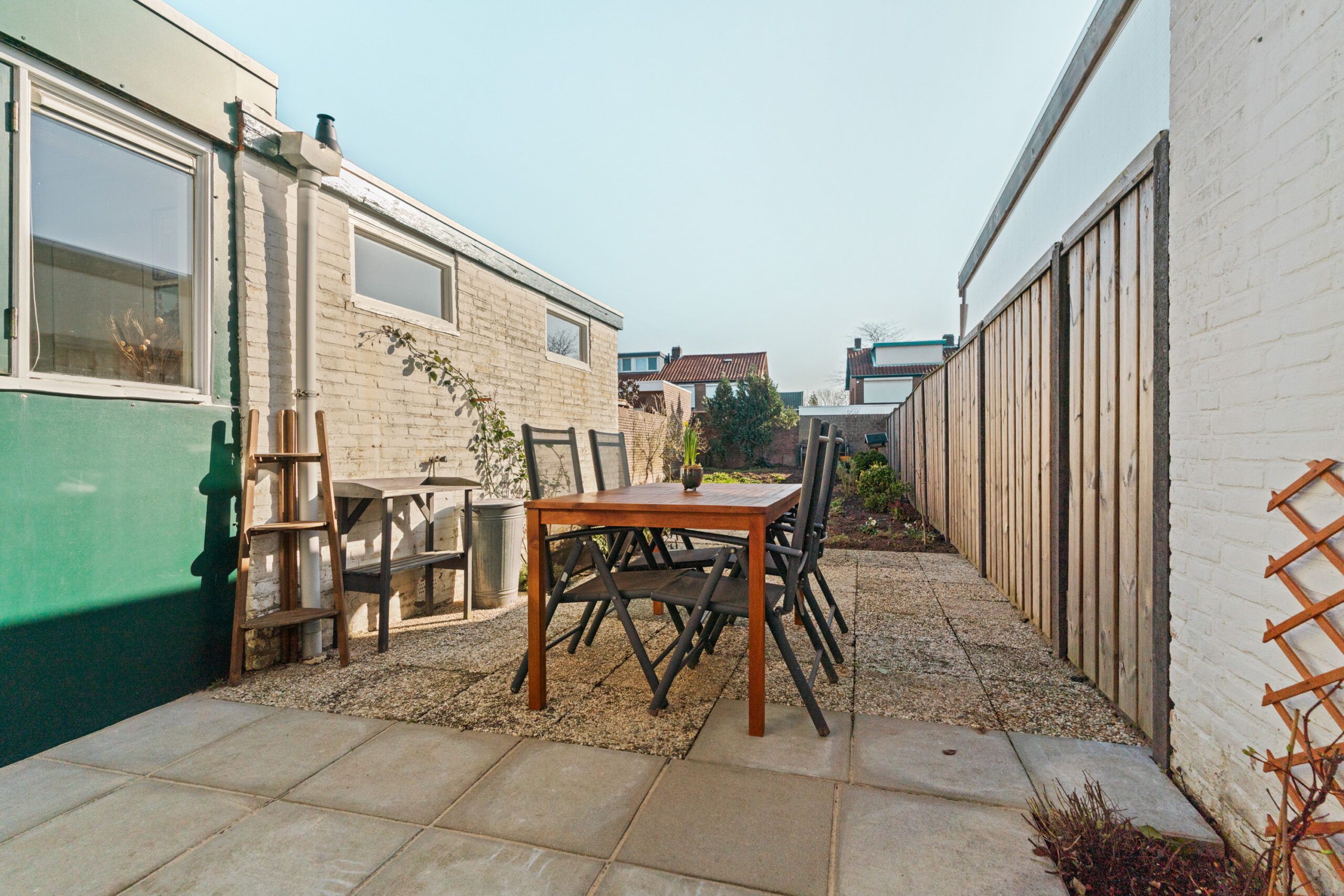 De woning beschikt over een ruime en verzorgde voortuin. De diepe achtertuin is gelegen op het oosten, biedt volop mogelijkheden om deze naar eigen smaak in te richten en beschikt daarnaast over een praktische achterom.