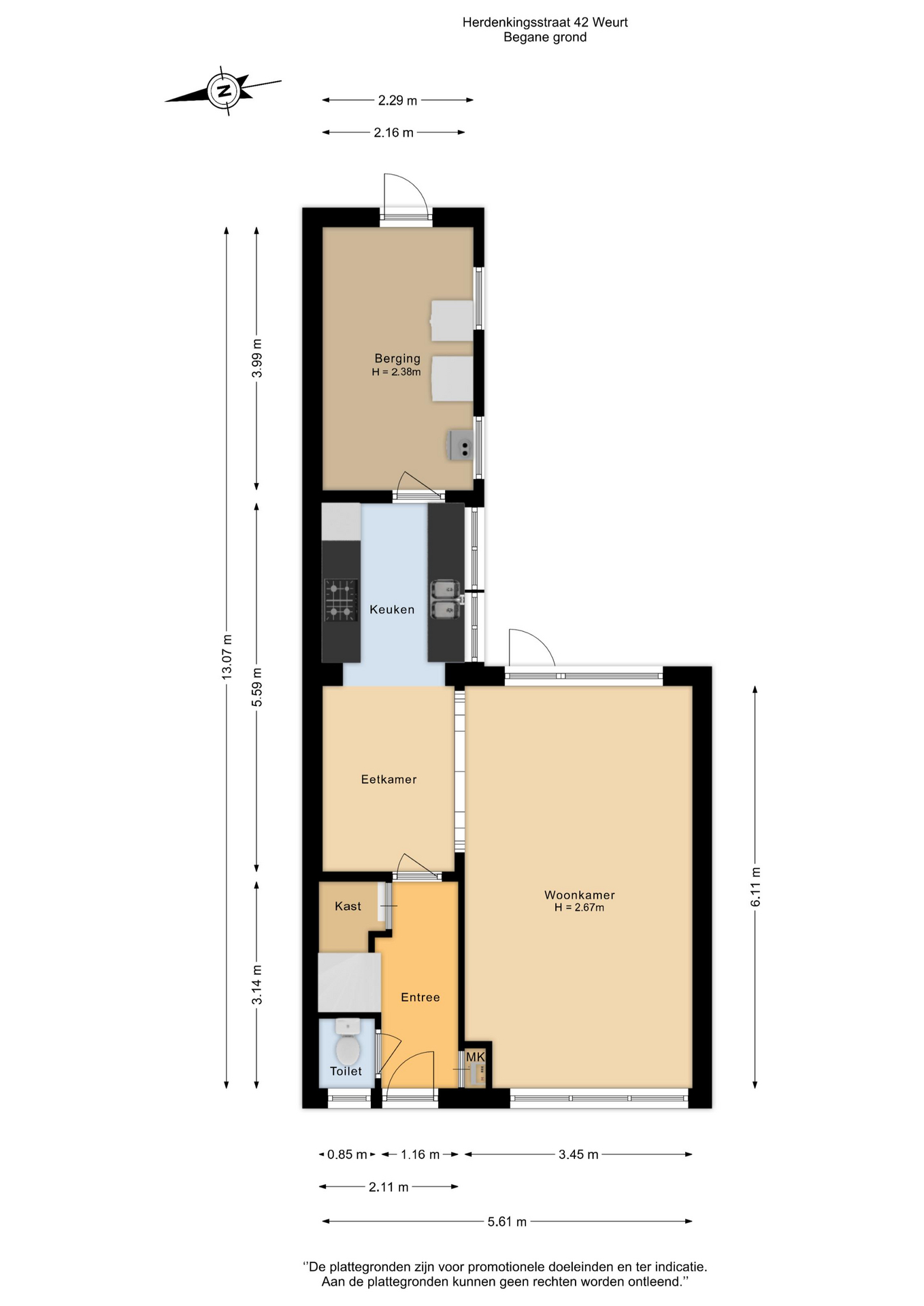 Entree, hal met trapkast, toiletruimte, de trapopgang naar de verdieping en toegang tot de woonkamer. De L-vormige doorzonwoonkamer beschikt over grote raampartijen, waardoor er veel natuurlijk licht binnenvalt, en een deur die directe toegang biedt tot de achtertuin. De halfopen keuken is voorzien van een gaskookplaat en een afzuigkap en biedt uitzicht op de achtertuin. Aansluitend bevindt zich de praktische berging met de opstelling voor het witgoed en de cv-ketel. Deze berging is zowel van binnenuit als via buiten bereikbaar. De hal en de woonkamer zijn afgewerkt met een fraaie PVC-vloer, wat zorgt voor een verzorgde en eigentijdse uitstraling.