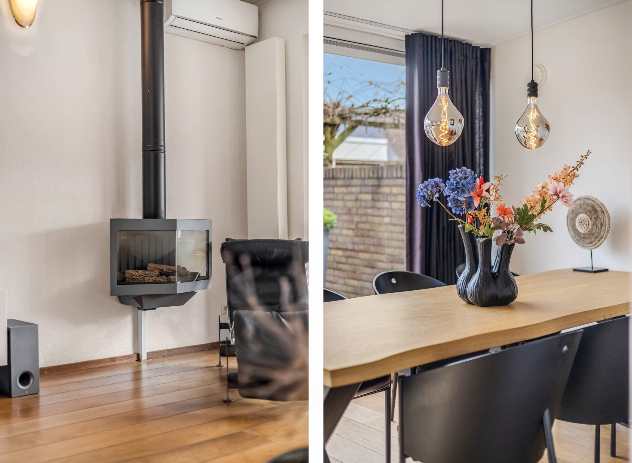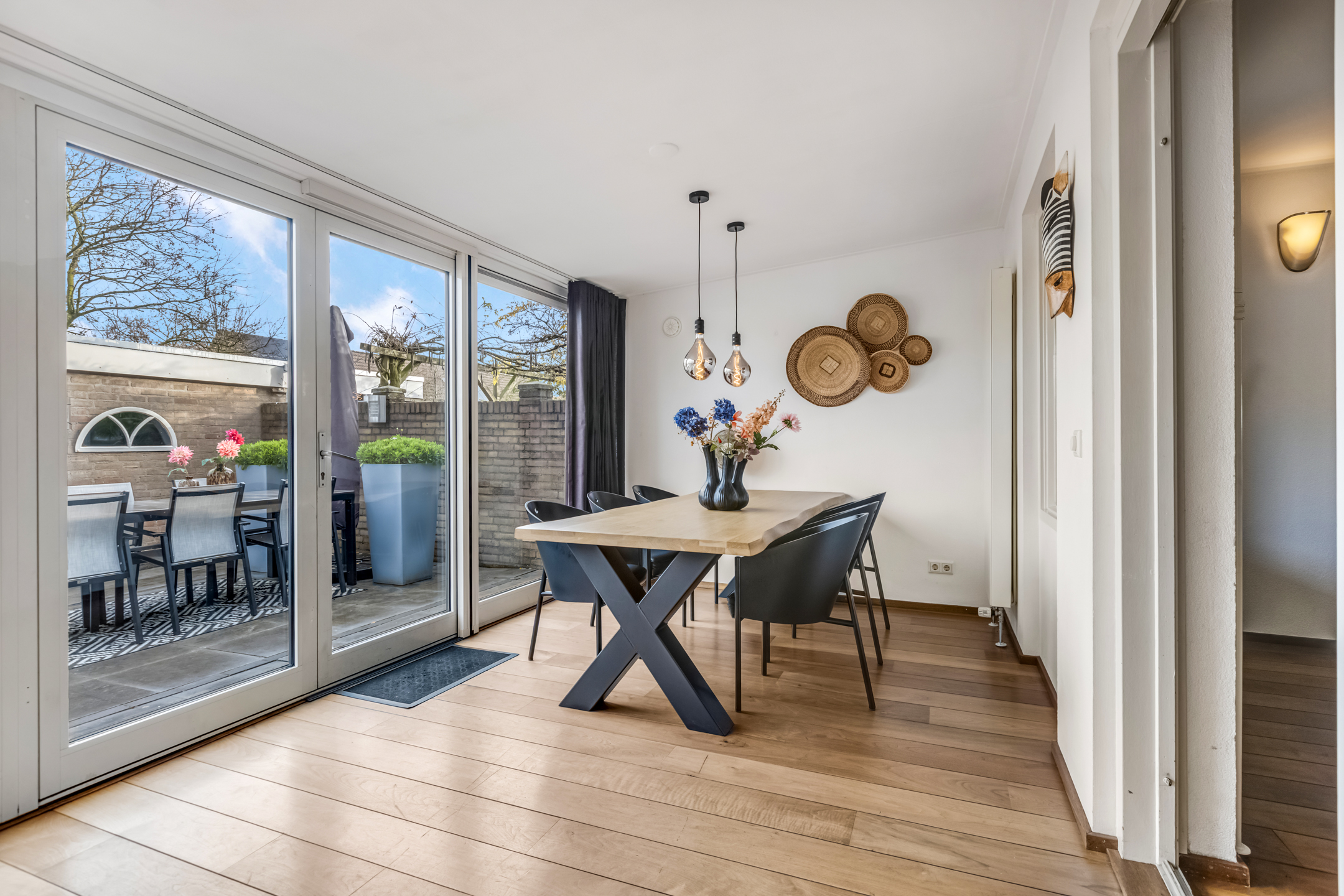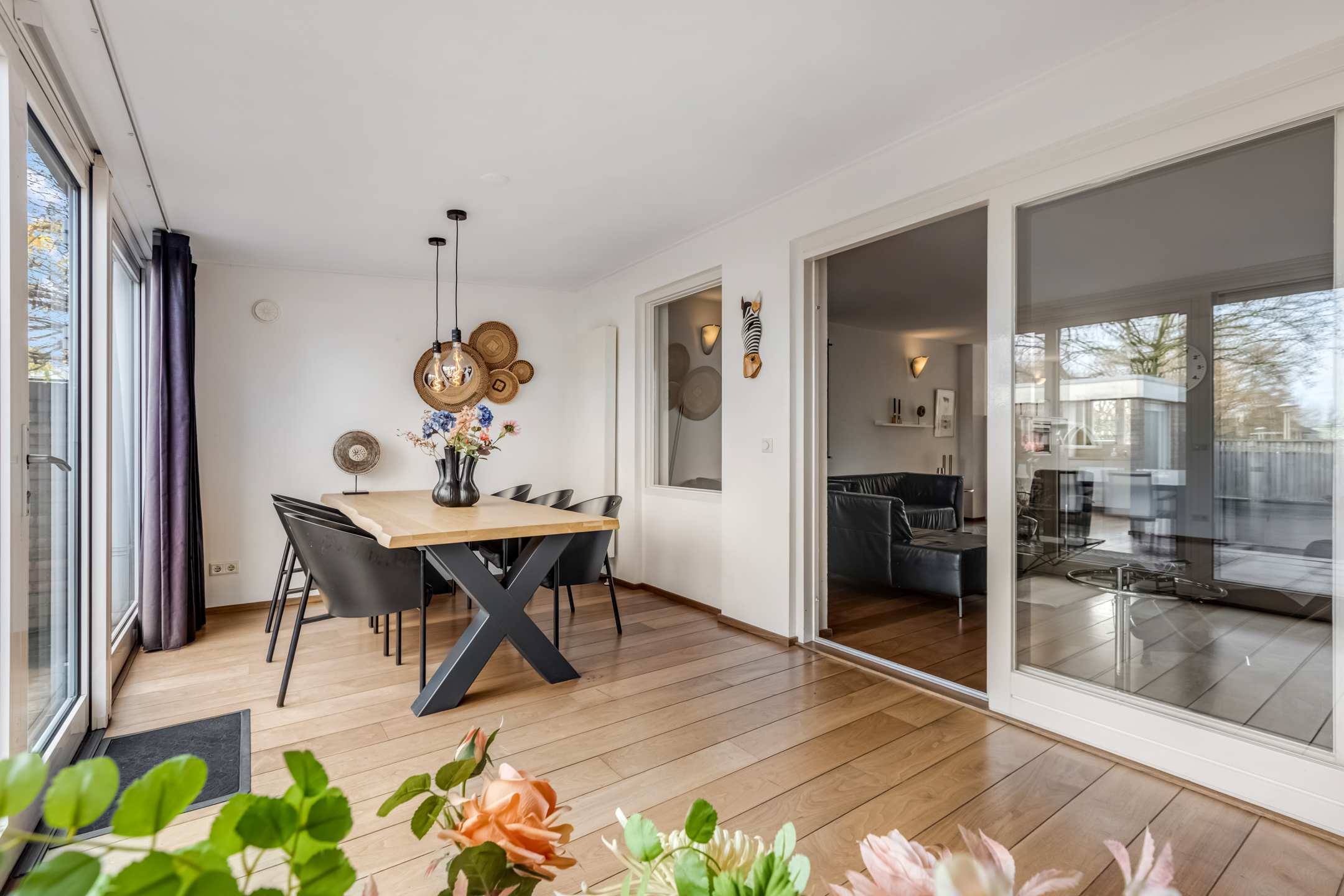 Entree met hal, toiletruimte met zwevend toilet en fonteintje, garderobenis, meterkast, trapopgang naar de verdiepingen en toegang tot de woonkamer. De tuingerichte woonkamer is voorzien van een airco en een gashaard. Aansluitend bevindt zich de royale serre, die veel ruimte biedt voor ontspanning en gezellig samenzijn. De woonkamer en serre zijn via een schuifpui van elkaar te scheiden. Via de openslaande deuren in de serre betreed je de tuin. Aan de voorzijde ligt de moderne open keuken, uitgerust met diverse inbouwapparatuur, waaronder een 4-pits inductiekookplaat, afzuigkap, Quooker, vaatwasser, combi-oven, koelkast en vriezer. De begane grond is afgewerkt met een fraaie eikenhouten vloer, wat de ruimtes een warme en luxe uitstraling geeft.