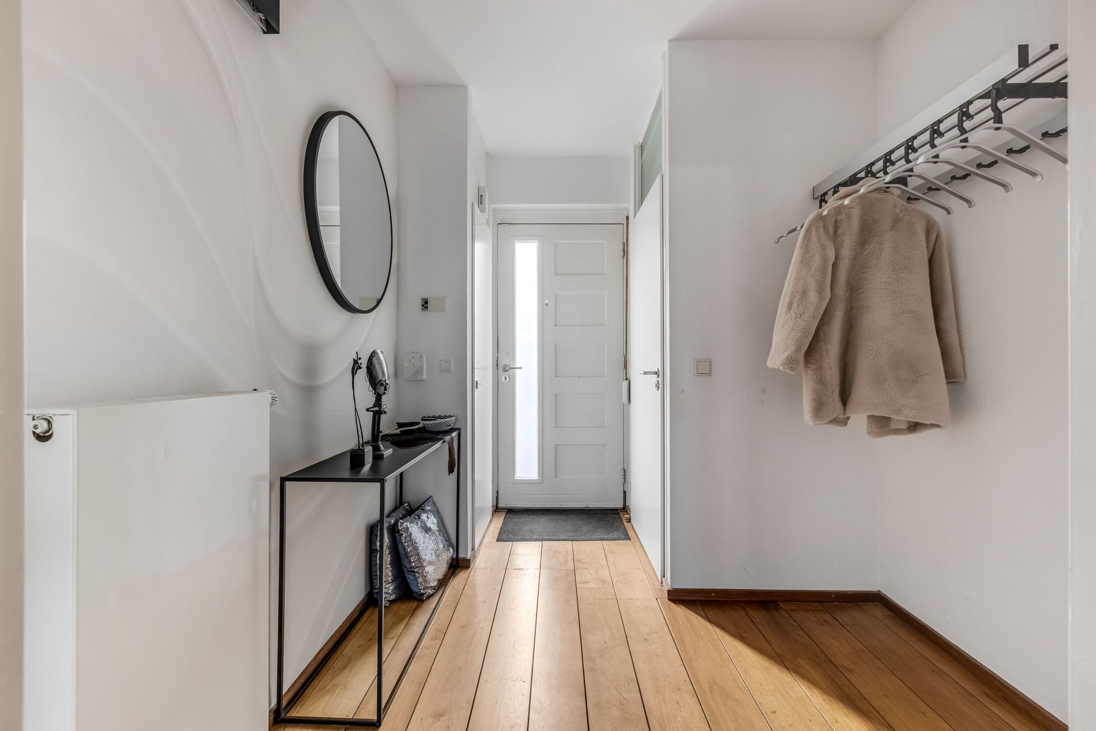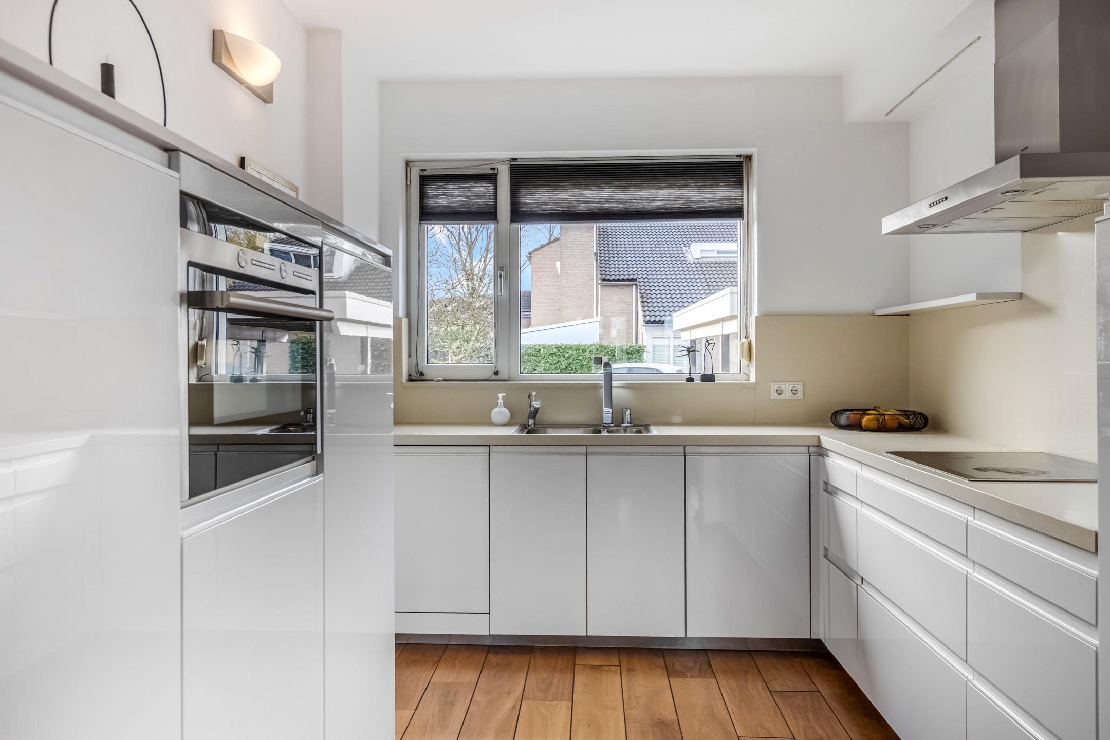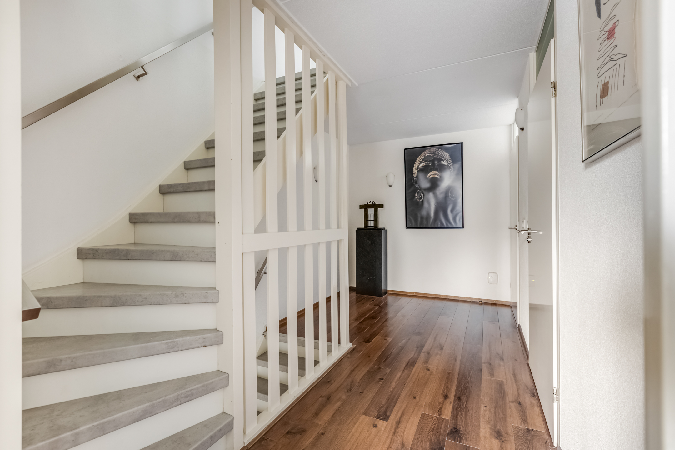 Entree met hal, toiletruimte met zwevend toilet en fonteintje, garderobenis, meterkast, trapopgang naar de verdiepingen en toegang tot de woonkamer. De tuingerichte woonkamer is voorzien van een airco en een gashaard. Aansluitend bevindt zich de royale serre, die veel ruimte biedt voor ontspanning en gezellig samenzijn. De woonkamer en serre zijn via een schuifpui van elkaar te scheiden. Via de openslaande deuren in de serre betreed je de tuin. Aan de voorzijde ligt de moderne open keuken, uitgerust met diverse inbouwapparatuur, waaronder een 4-pits inductiekookplaat, afzuigkap, Quooker, vaatwasser, combi-oven, koelkast en vriezer. De begane grond is afgewerkt met een fraaie eikenhouten vloer, wat de ruimtes een warme en luxe uitstraling geeft.