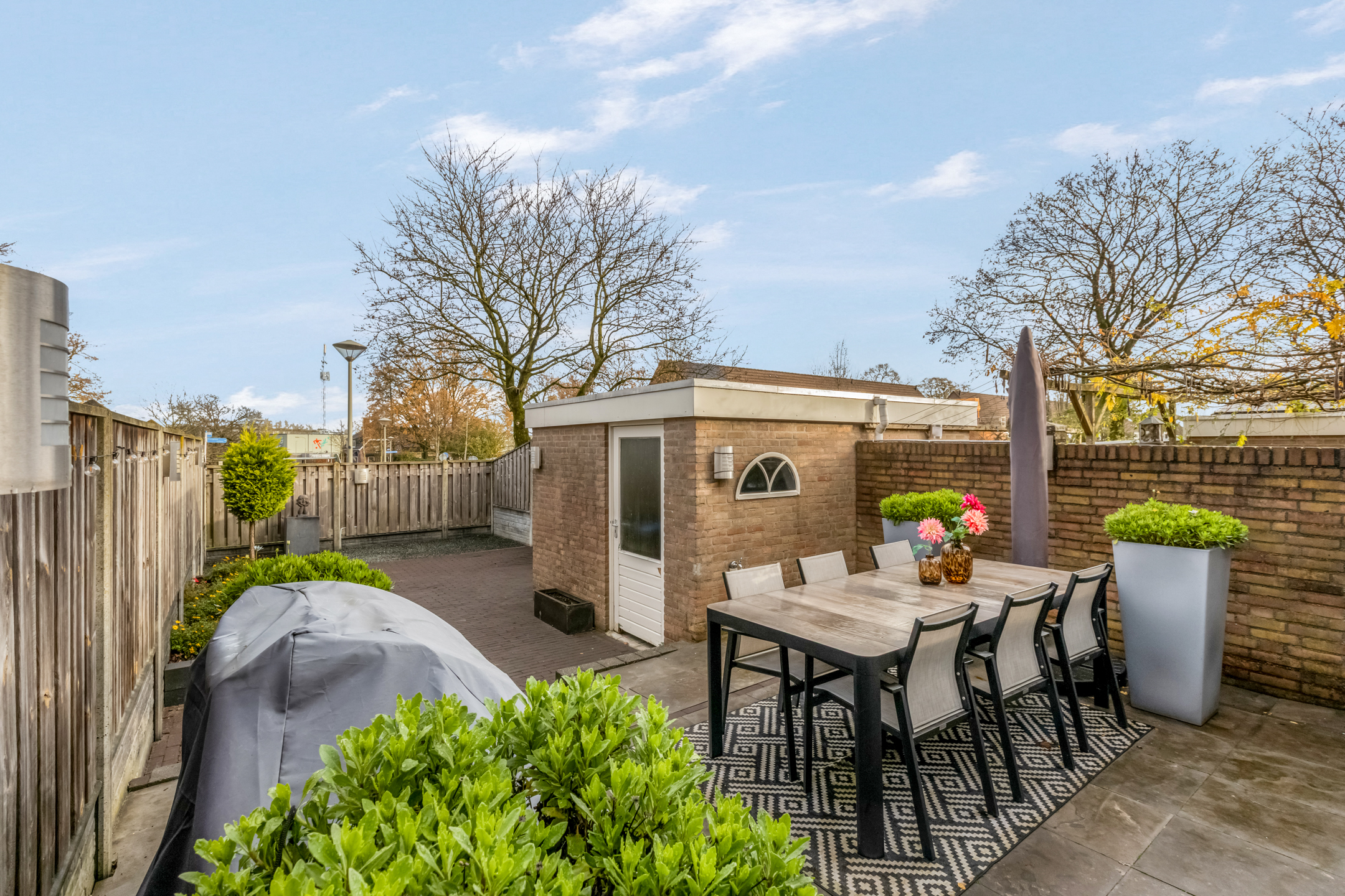 De achtertuin is gesitueerd op het noordoosten, volledig bestraat en ingericht met een fraai terras waar je kunt genieten van optimale privacy. Een vrijstaande stenen berging completeert het geheel. De voortuin is voorzien van een carport, met parkeerruimte voor twee auto's: één onder de carport en één ernaast.