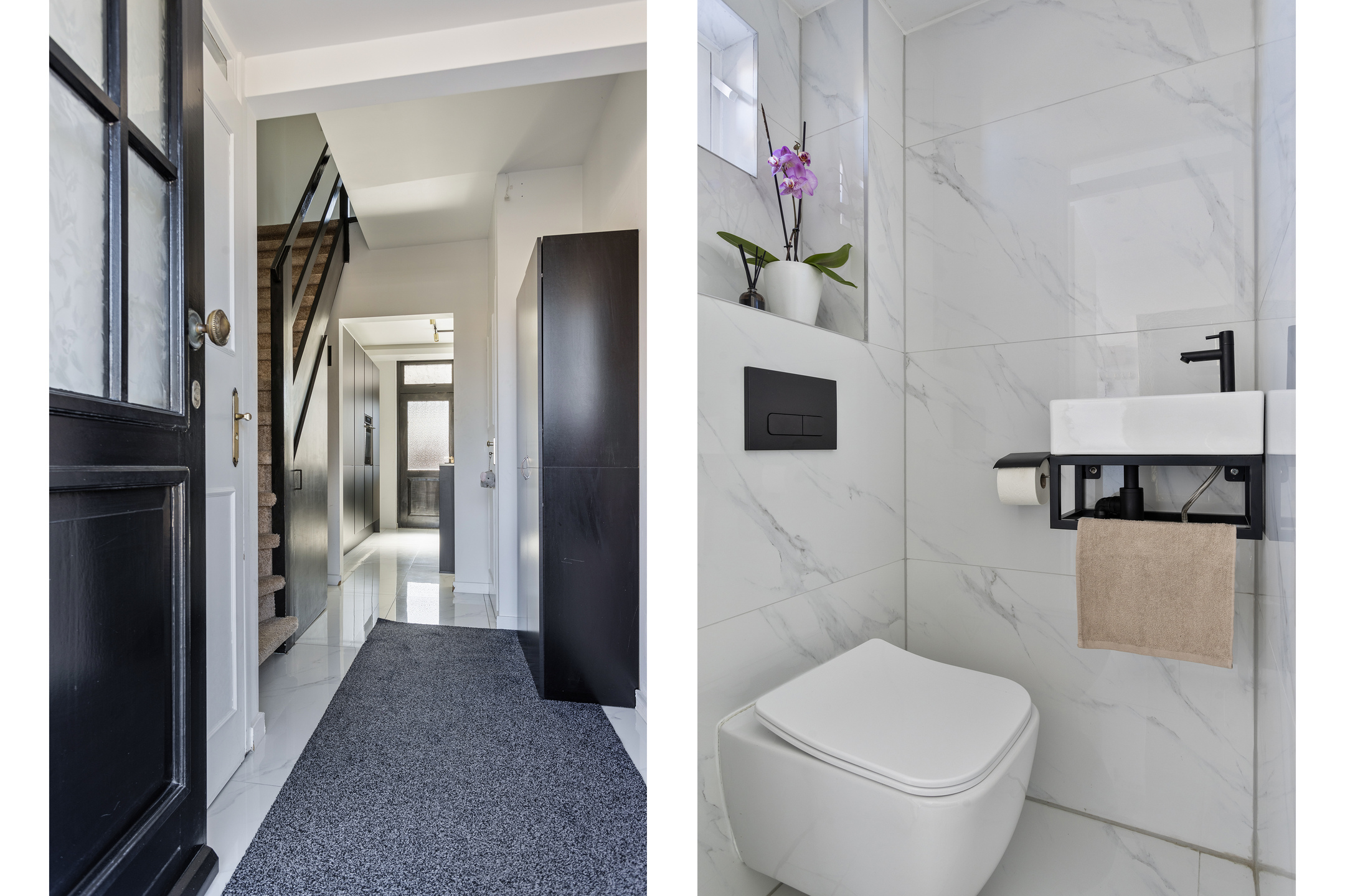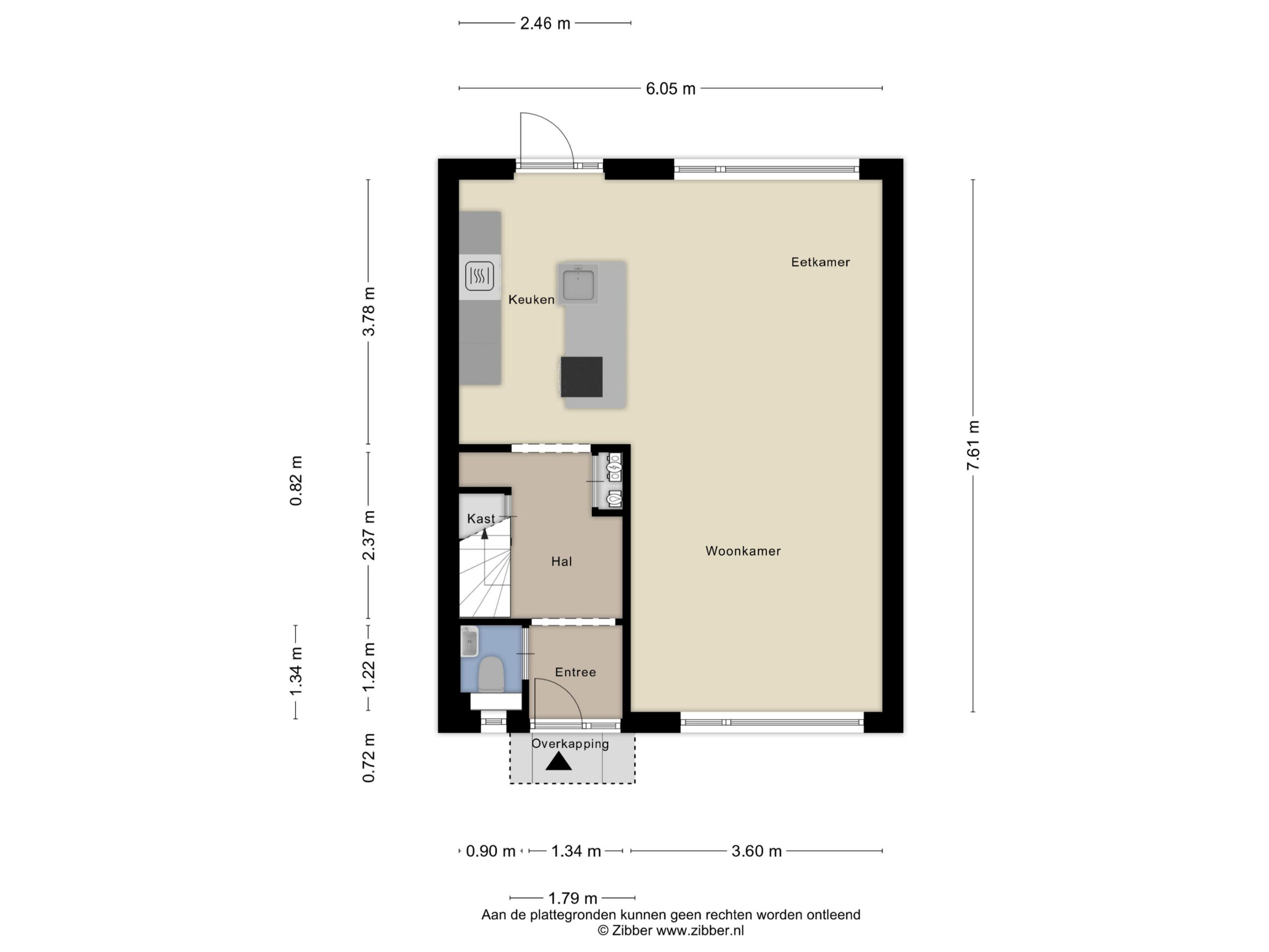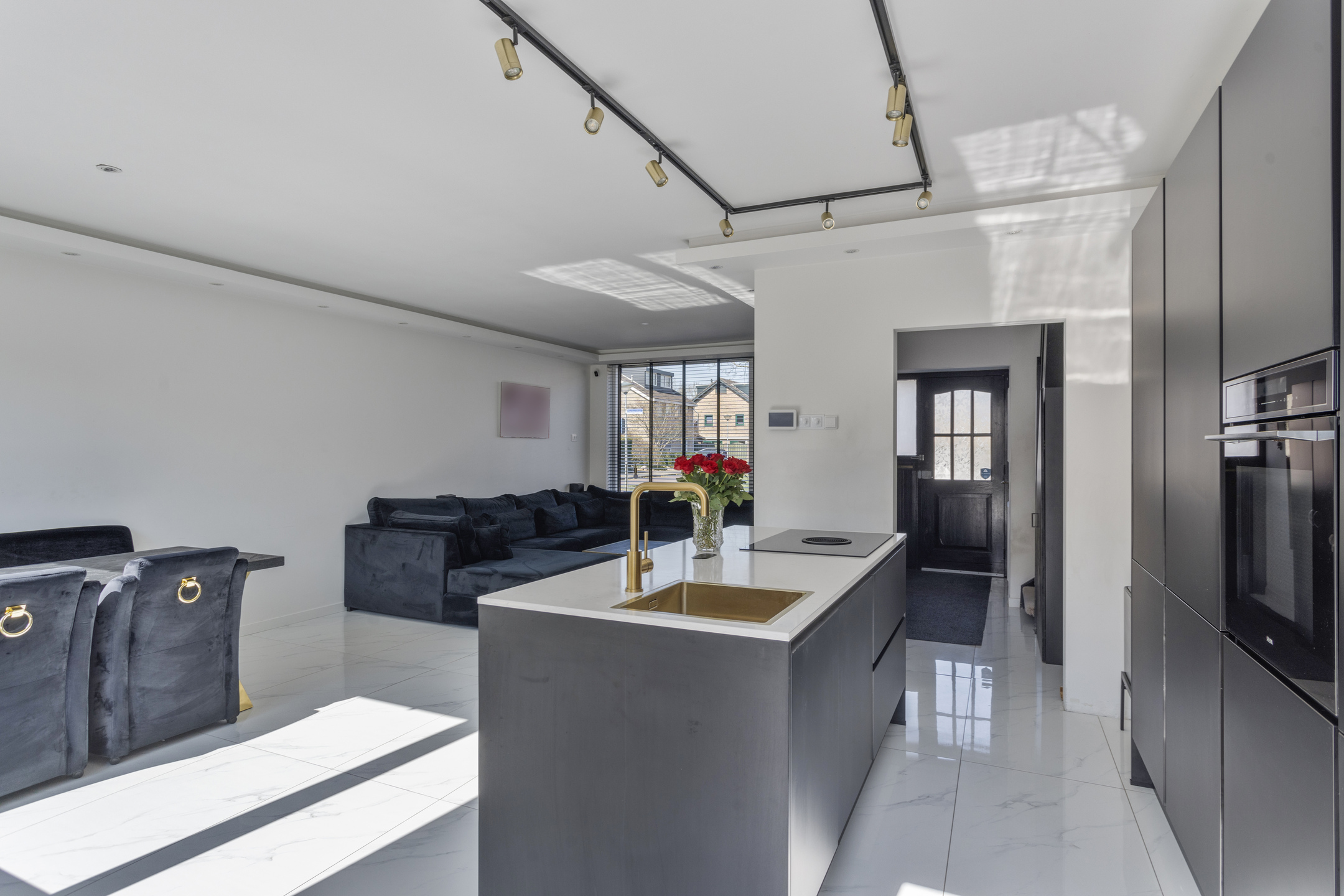 Entree, hal met meterkast, een toiletruimte met hangcloset en fonteintje, een praktische trapkast en de trapopgang naar de eerste verdieping. Vanuit de hal bereik je de woonkamer met open keuken, die samen het centrale leefgedeelte van de woning vormen. De woonkamer kenmerkt zich door een prettige lichtinval, mede dankzij de grote raampartijen. De moderne open keuken (2021) met kookeiland is voorzien van diverse inbouwapparatuur, waaronder een Bora inductiekookplaat met geĂŻntegreerde afzuiging, een combioven, een koelkast en een vaatwasser. Vanuit de keuken heb je directe toegang tot de achtertuin. De begane grond is afgewerkt met een tegelvloer en voorzien van vloerverwarming, wat bijdraagt aan een comfortabel woonklimaat.