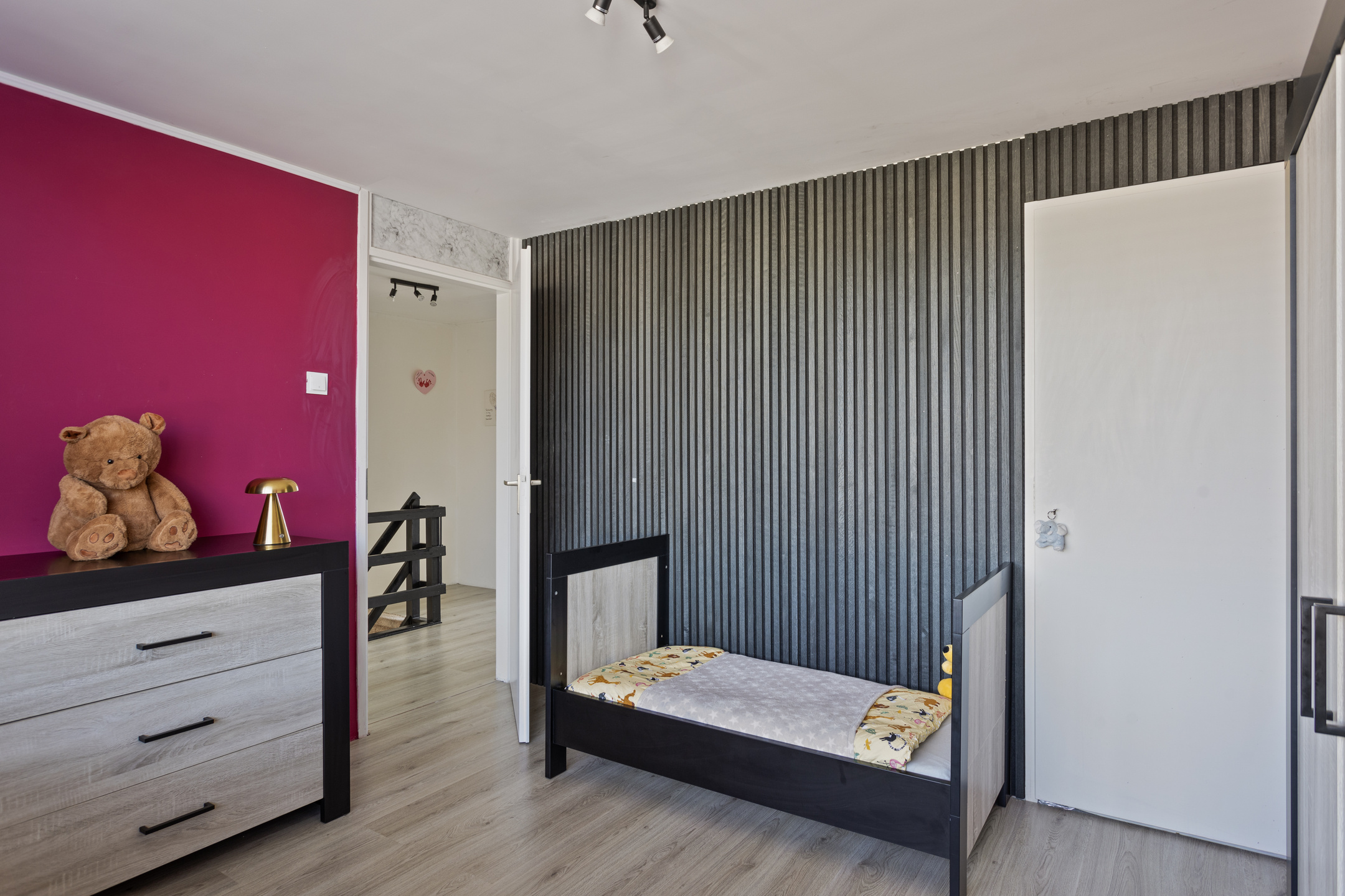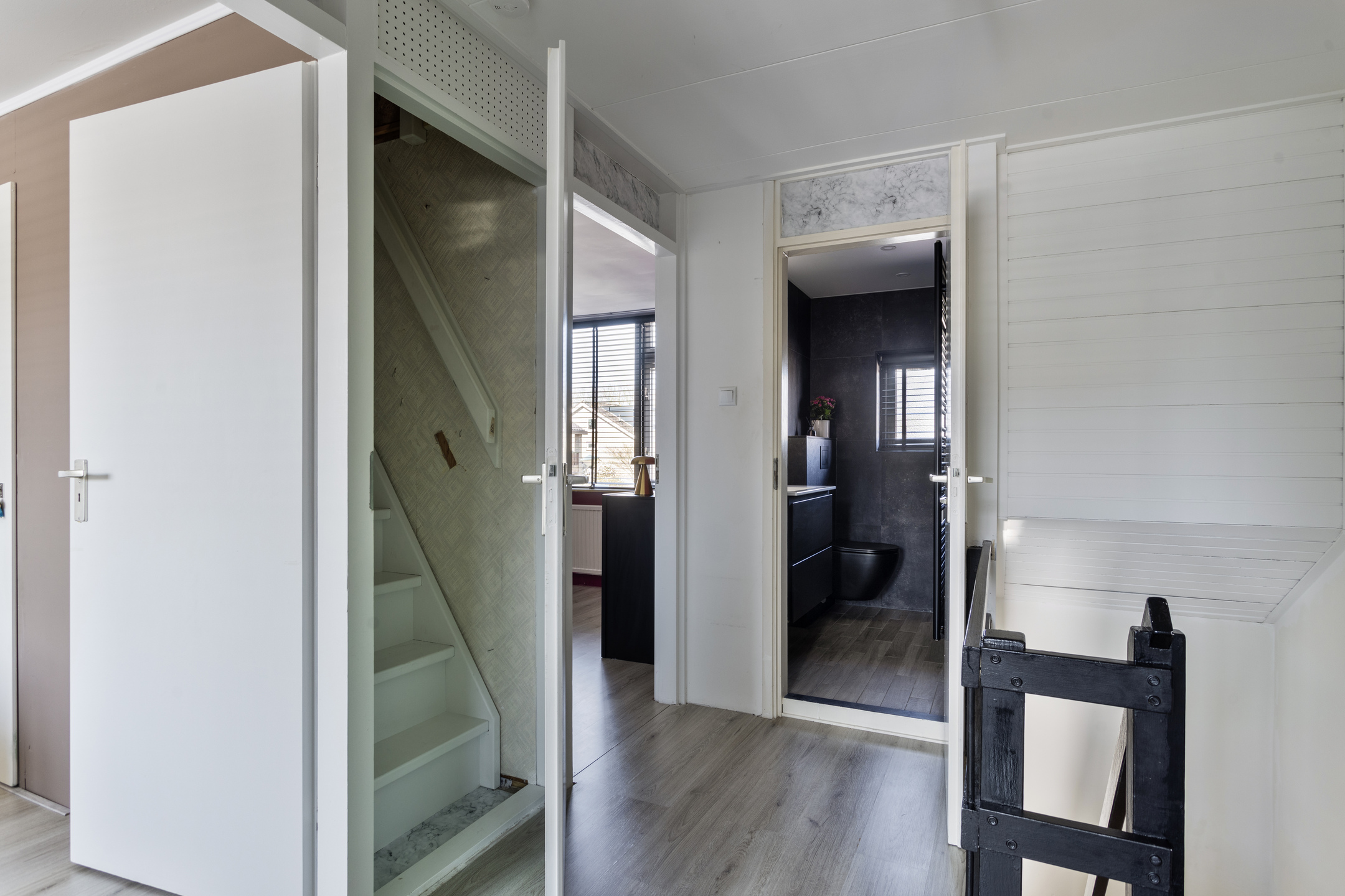 De overloop biedt je toegang tot 3 slaapkamers en de badkamer. De twee ruime slaapkamers zijn voorzien van een vaste kast. De derde slaapkamer is momenteel ingericht als inloopkast. De moderne badkamer beschikt over een inloopdouche met regendouchefunctie, een hangcloset en een wastafelmeubel, en is functioneel en verzorgd uitgevoerd.