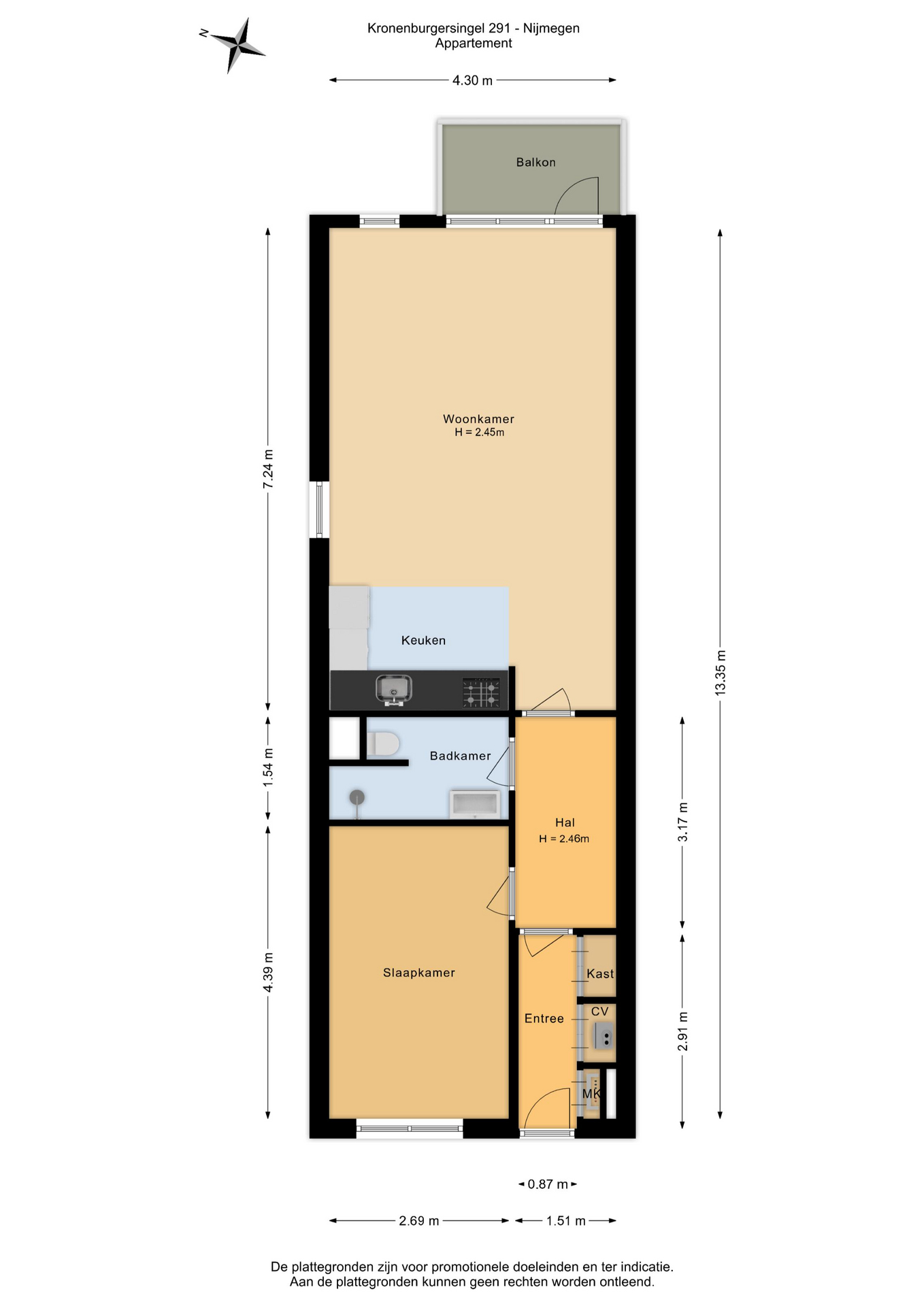 Entree, hal met meterkast, cv-kast en provisiekast. Gang met toegang tot de slaapkamer, de badkamer en de woonkamer. De badkamer is uitgerust met een inloopdouche met regendouchefunctie, hangcloset, en wastafel. De woonkamer beschikt over een open keuken en biedt toegang tot het balkon gelegen op het westen. De keuken is voorzien van diverse inbouwapparatuur, zoals een 4-pits gaskookplaat, afzuigkap, combi-oven, koelkast, vaatwasser en is er een witgoedaansluiting. Het gehele appartement, met uitzondering van de natte ruimtes, is voorzien van een mooie laminaatvloer.