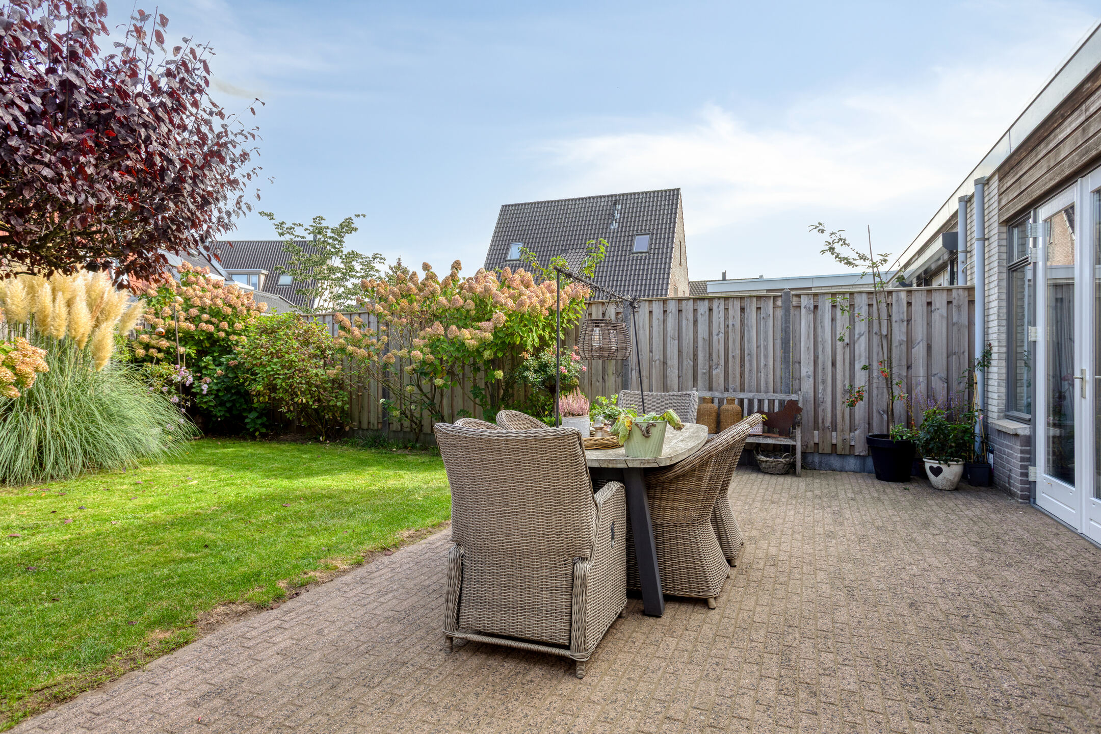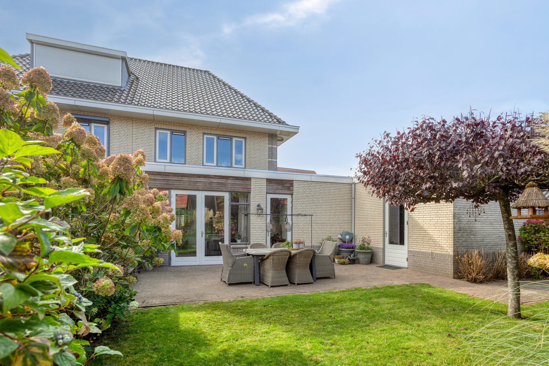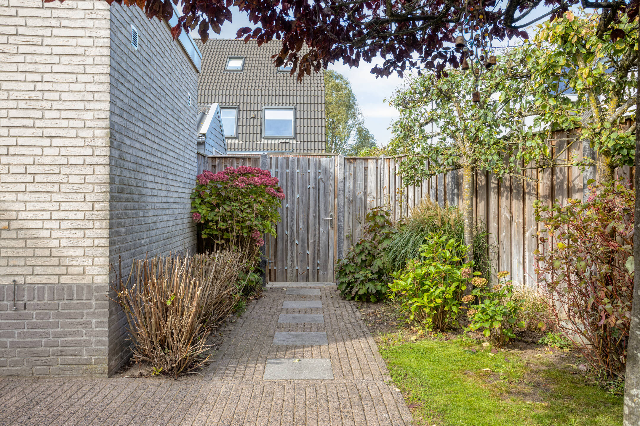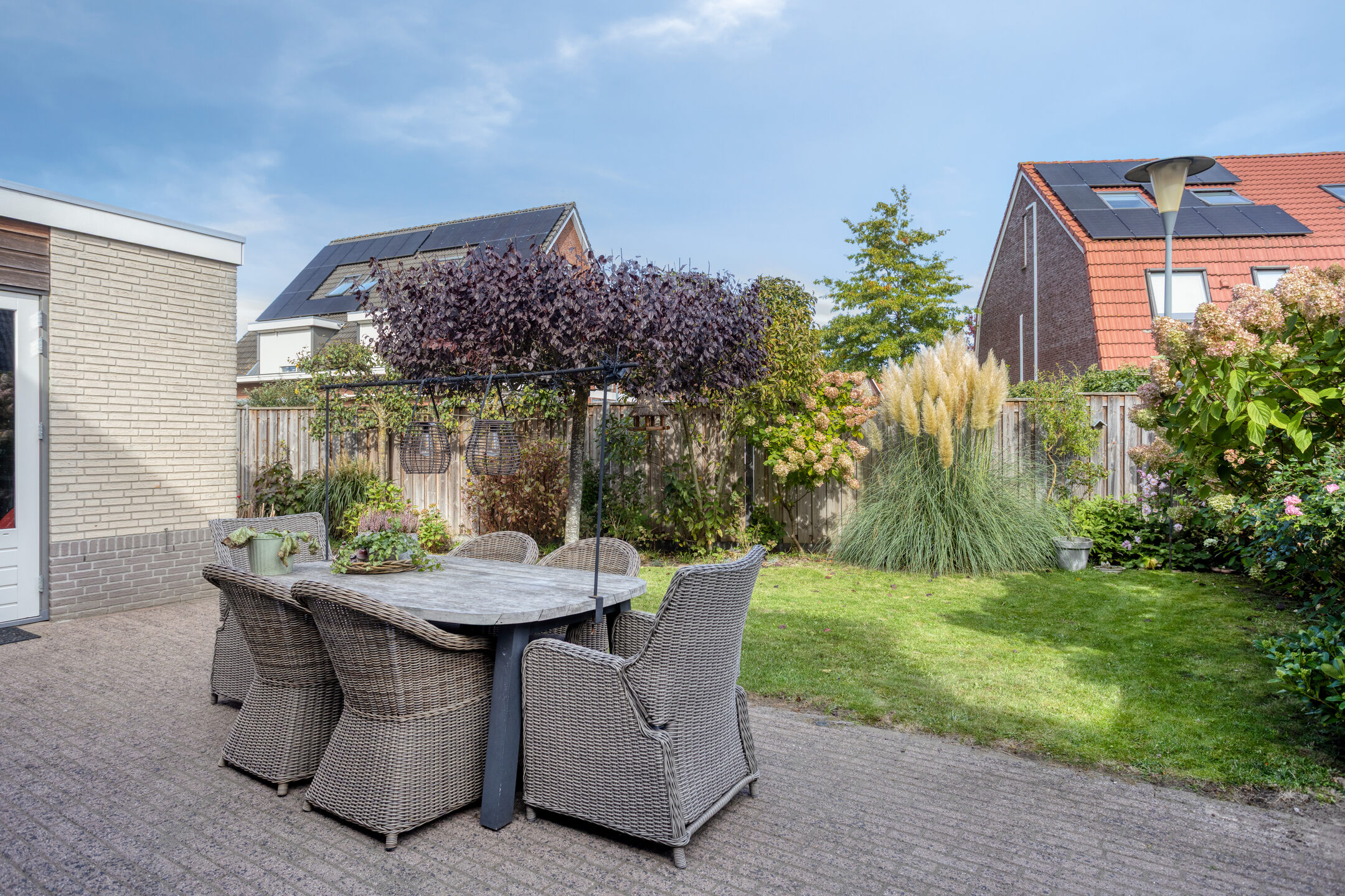 De achtertuin ligt op het noordoosten, is keurig onderhouden en voorzien van een royaal terras, een strak gazon, diverse beplanting en een praktische achterom. Hier geniet je van volop privacy en alle ruimte om heerlijk buiten te leven. Dankzij de ligging is er altijd een plek in de zon te vinden. Aan de voorzijde vind je een oprit met plek voor minimaal twee auto’s – ideaal!