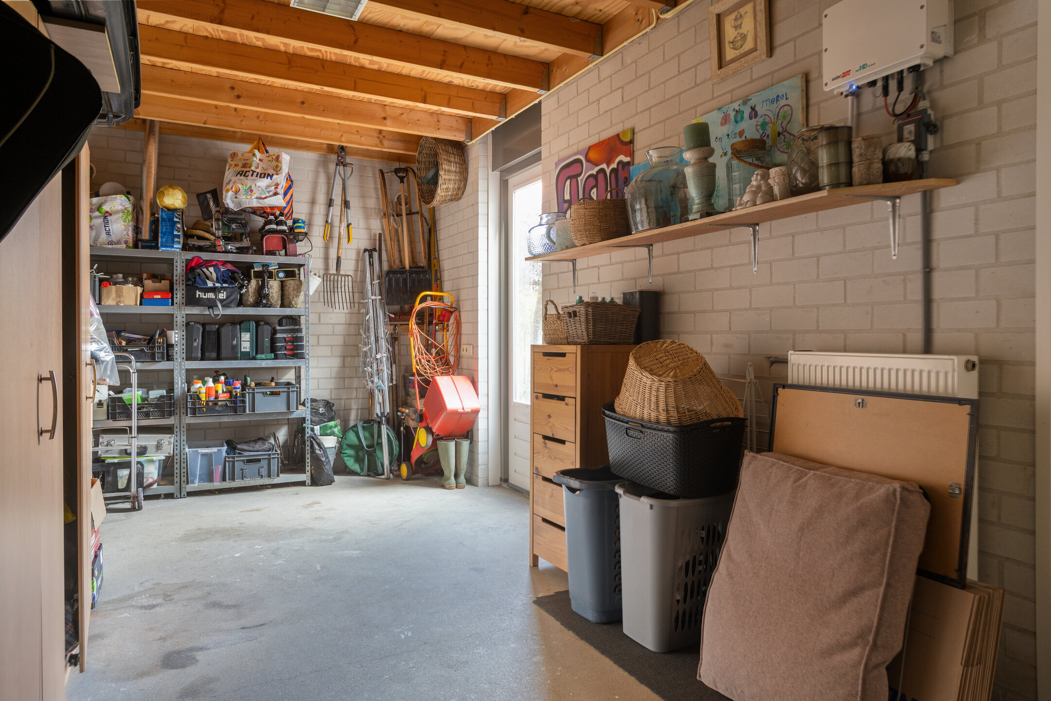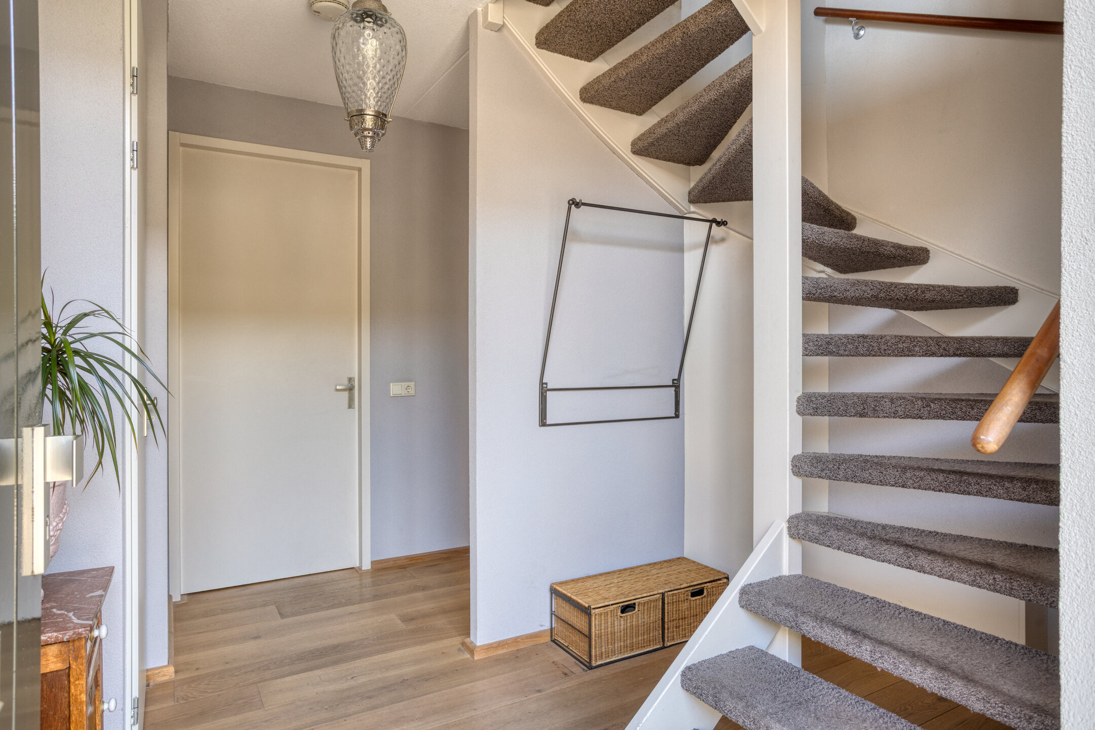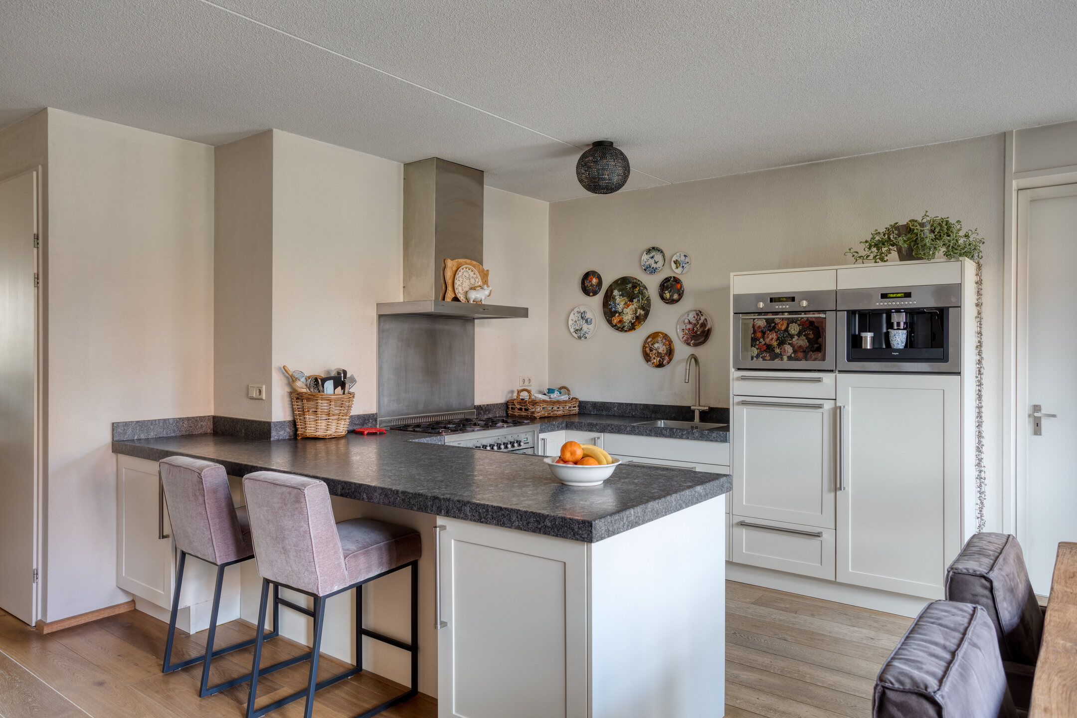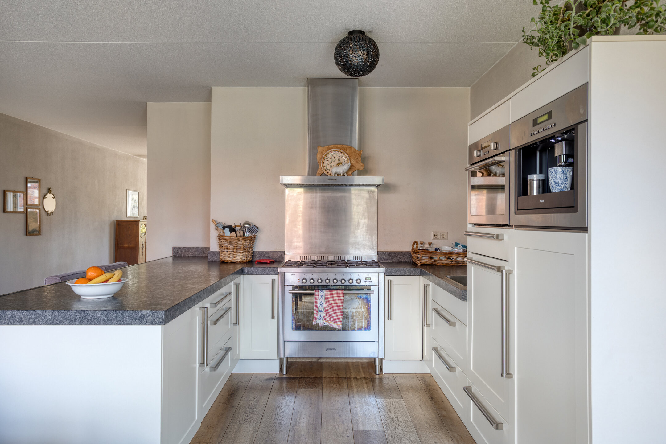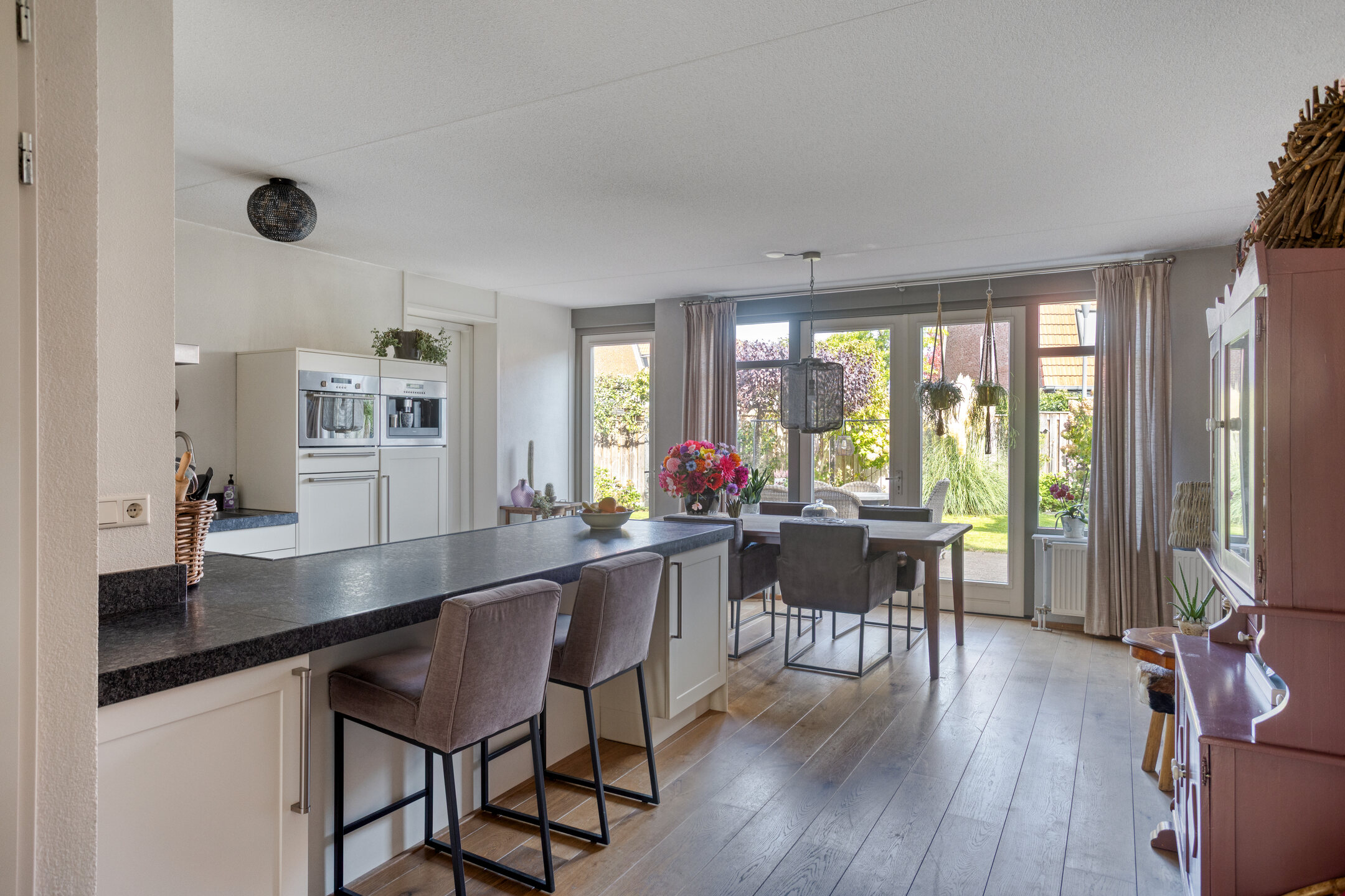 Entree, hal met garderobehoek, meterkast, toiletruimte met hangcloset en fonteintje, trapopgang naar de verdieping en toegang tot de royale woonkamer met open woonkeuken. De woonkamer biedt een sfeervolle en uitnodigende leefruimte. Aan de achterzijde bevindt zich de open keuken met openslaande deuren naar de achtertuin. De woonkeuken is voorzien van een natuurstenen aanrechtblad en diverse inbouwapparatuur, waaronder een 6-pits gasfornuis met oven, afzuigkap, een combi-oven, vaatwasser, koelkast en koffiemachine. Aansluitend vind je de praktische bijkeuken met opstelplaats voor witgoed en toegang tot zowel de garage als de voortuin. De gehele begane grond (met uitzondering van de toiletruimte, bijkeuken en garage) is afgewerkt met een fraaie eikenhouten lamelparketvloer. De garage is in spouw uitgevoerd, beschikt over openslaande deuren en biedt eveneens toegang tot de tuin.