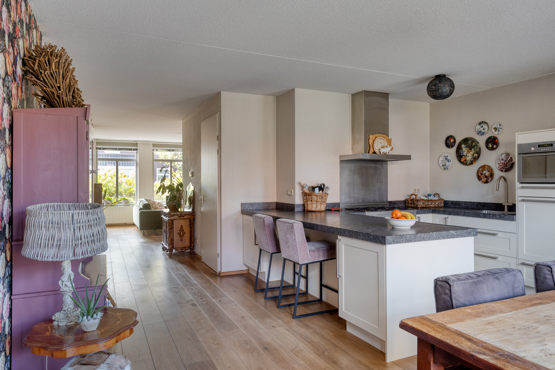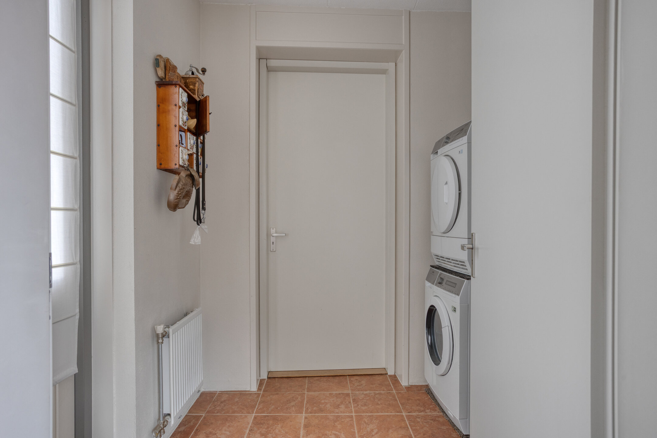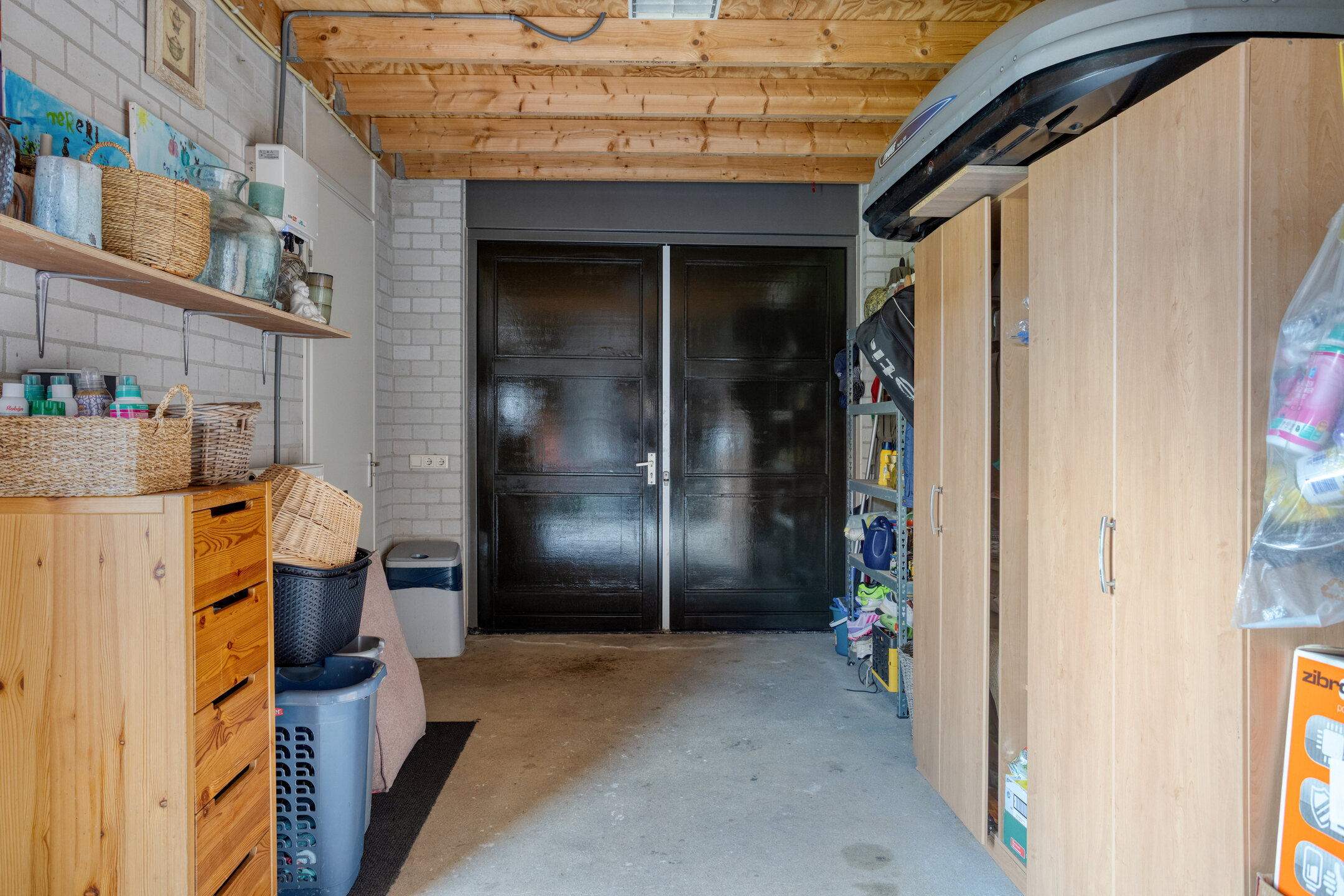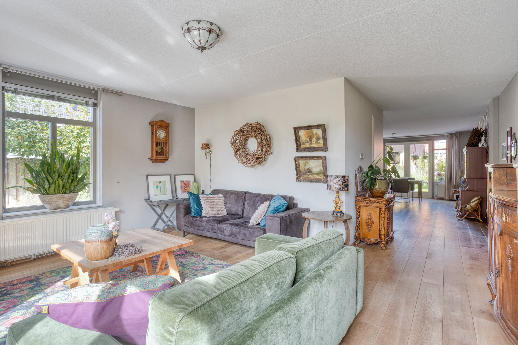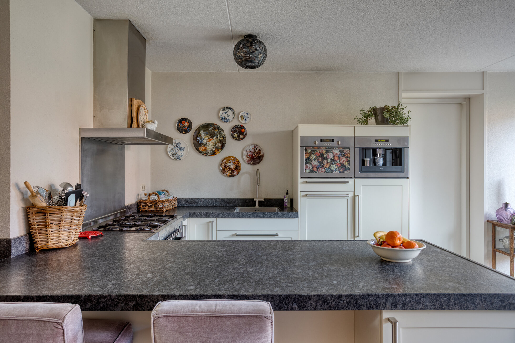 Entree, hal met garderobehoek, meterkast, toiletruimte met hangcloset en fonteintje, trapopgang naar de verdieping en toegang tot de royale woonkamer met open woonkeuken. De woonkamer biedt een sfeervolle en uitnodigende leefruimte. Aan de achterzijde bevindt zich de open keuken met openslaande deuren naar de achtertuin. De woonkeuken is voorzien van een natuurstenen aanrechtblad en diverse inbouwapparatuur, waaronder een 6-pits gasfornuis met oven, afzuigkap, een combi-oven, vaatwasser, koelkast en koffiemachine. Aansluitend vind je de praktische bijkeuken met opstelplaats voor witgoed en toegang tot zowel de garage als de voortuin. De gehele begane grond (met uitzondering van de toiletruimte, bijkeuken en garage) is afgewerkt met een fraaie eikenhouten lamelparketvloer. De garage is in spouw uitgevoerd, beschikt over openslaande deuren en biedt eveneens toegang tot de tuin.