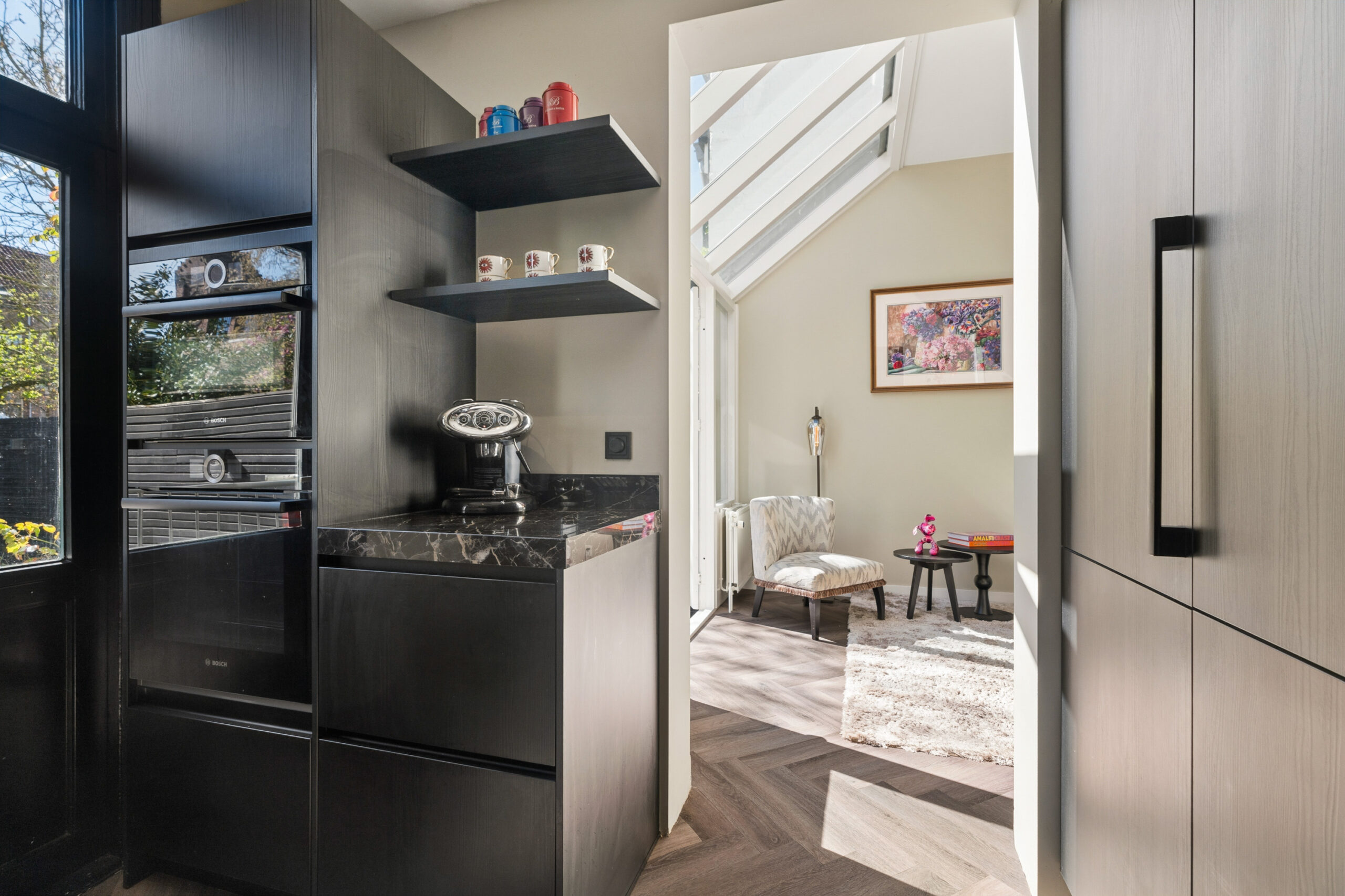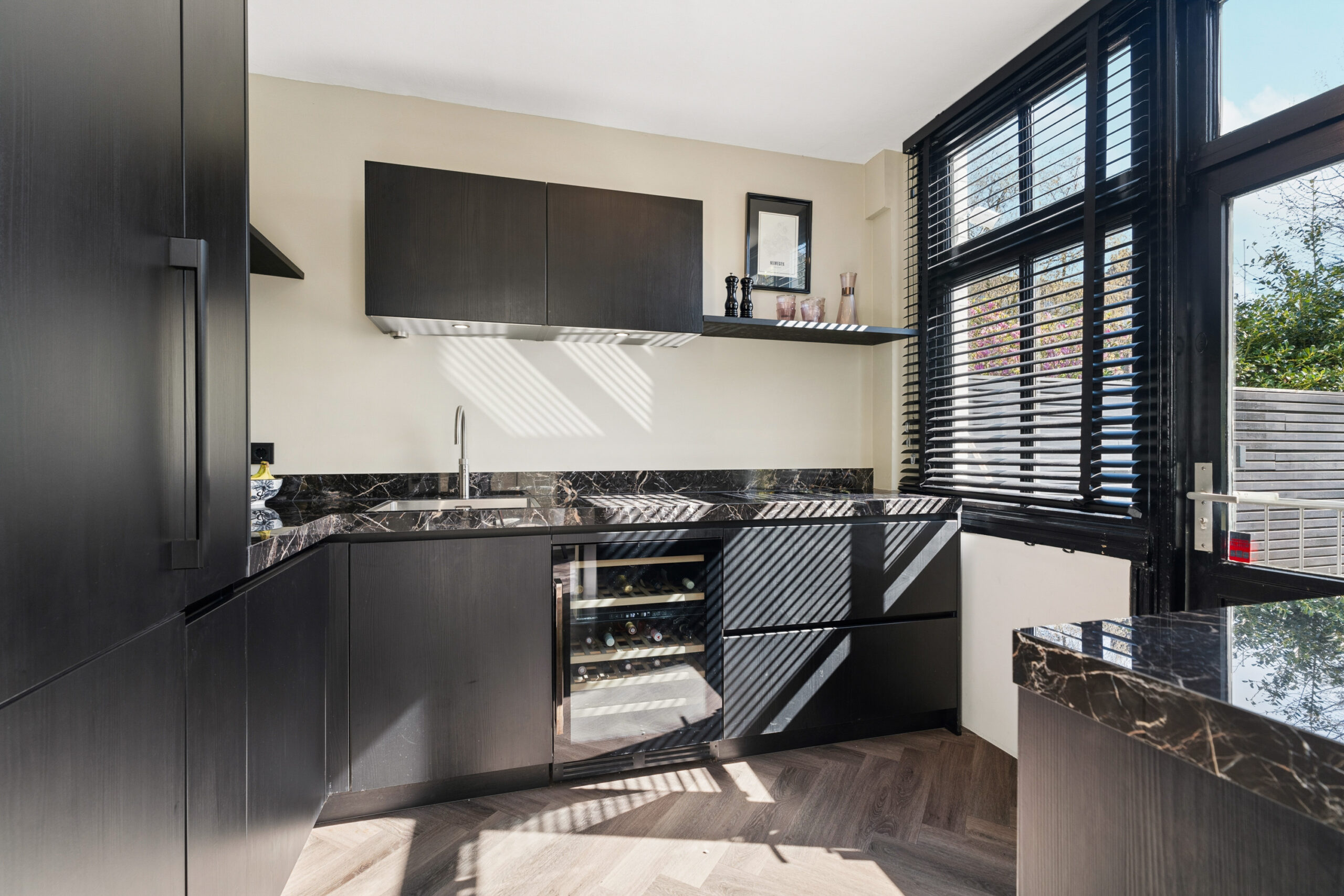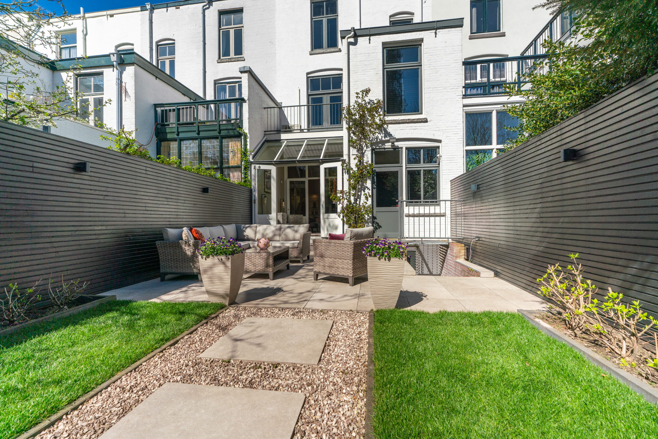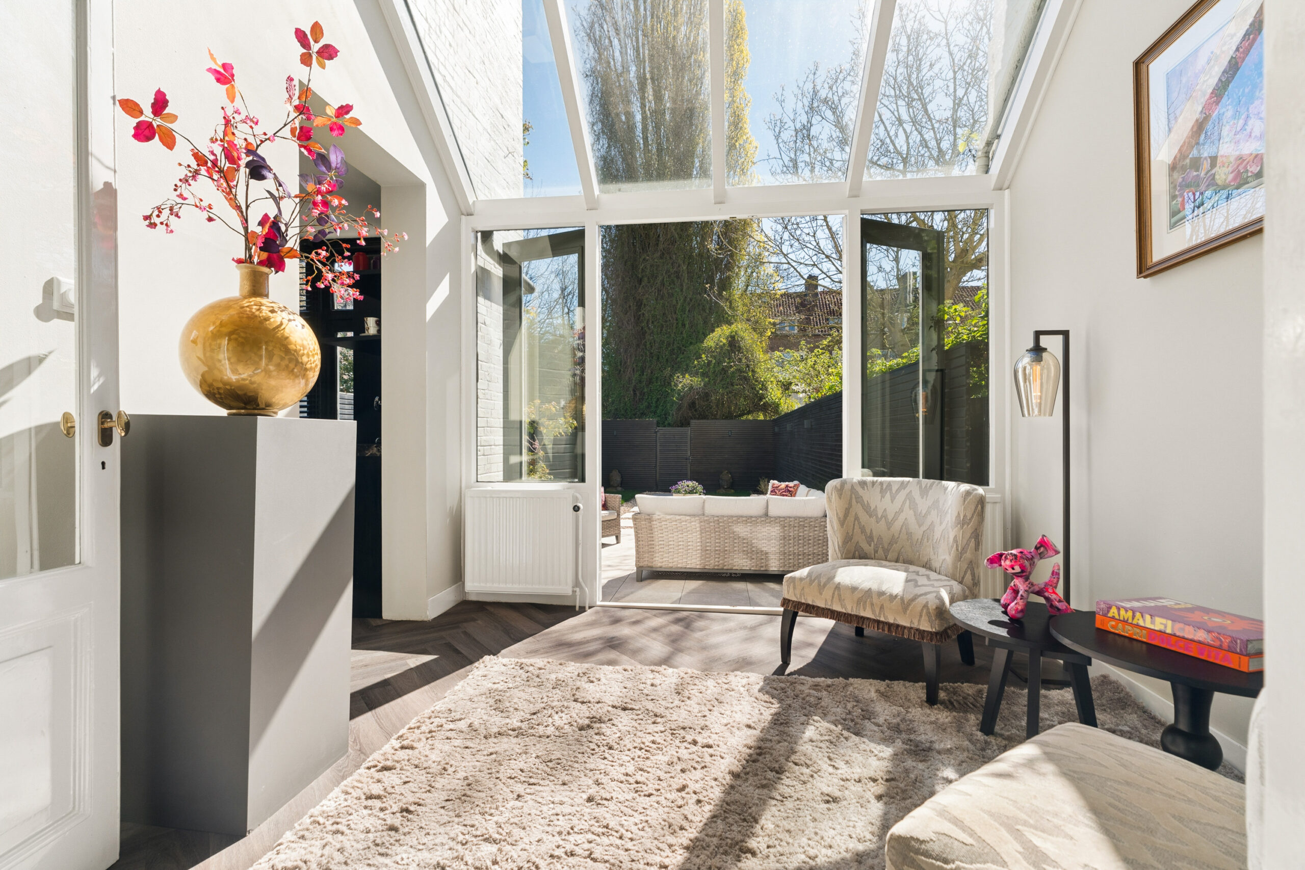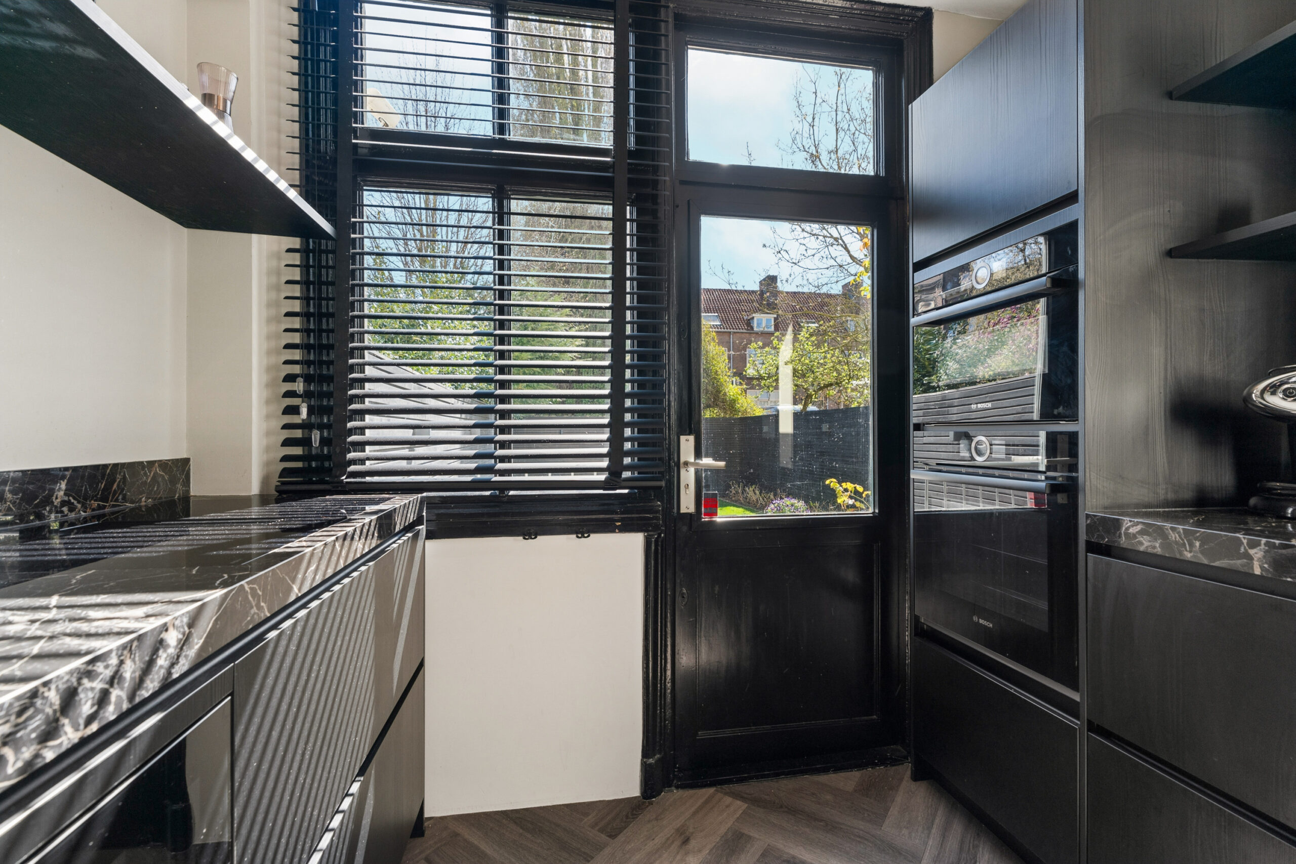 De royale woonkamer en suite beschikt over originele schuifdeuren en openslaande deuren naar de voortuin, hetgeen zorgt voor een aangename lichtinval en een optimale verbinding met buiten. Aan de achterzijde bevindt zich de serre, rijk aan daglicht en voorzien van openslaande deuren naar de diepe en fraai aangelegde stadstuin. De dichte keuken biedt eveneens toegang tot de tuin en is uitgerust met diverse hoogwaardige inbouwapparatuur, te weten een combioven, combistoomoven, extra grote inductiekookplaat (4-pits) met geïntegreerde afzuiging, wijnkoelkast, vaatwasser, vriezer XL, koelkast XL en een Quooker voor direct kokend water. De vloeren in de woonkamer en keuken zijn afgewerkt met PVC.