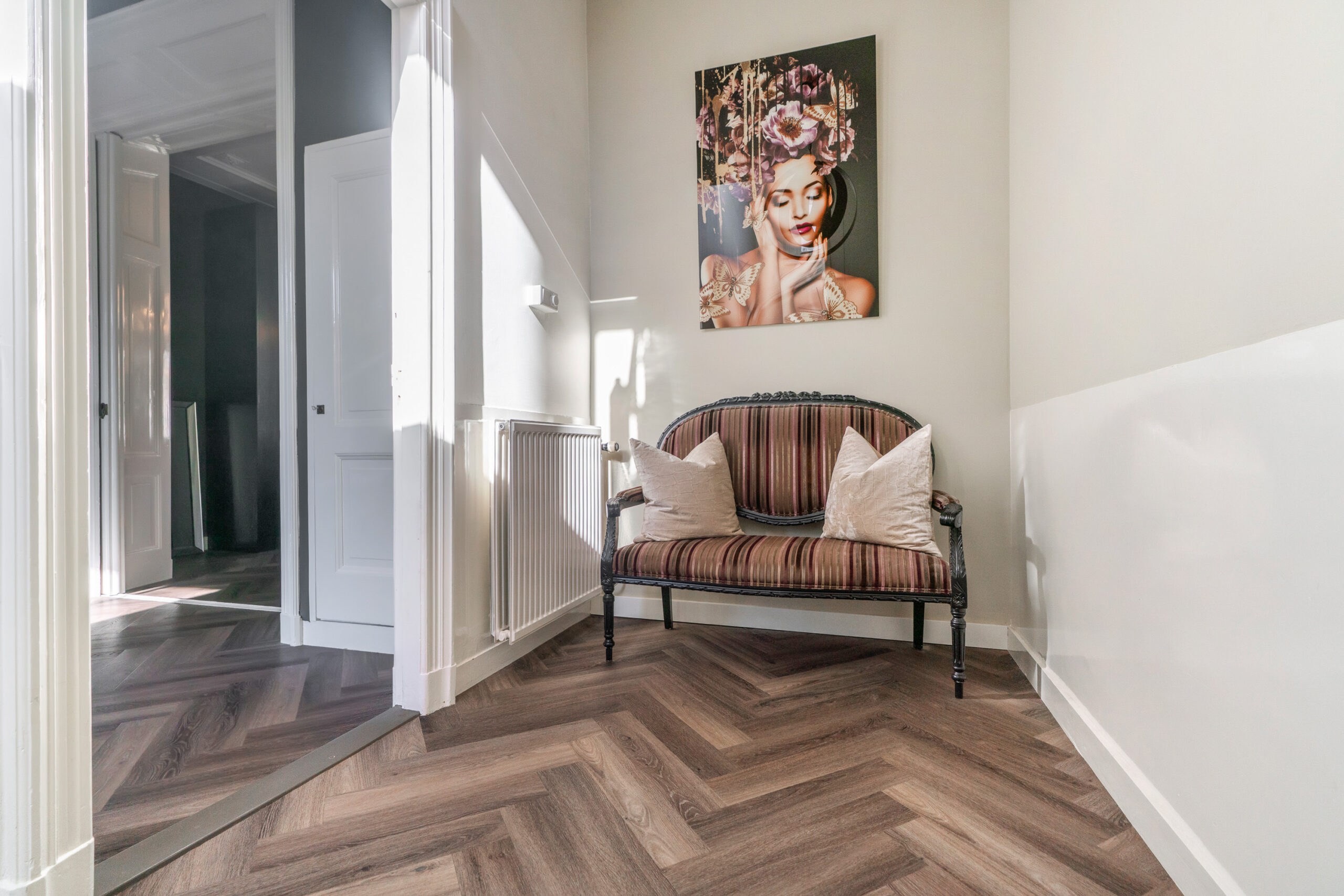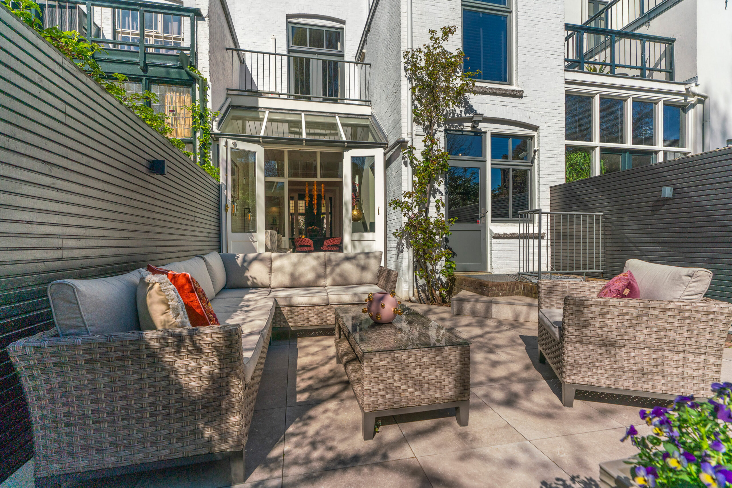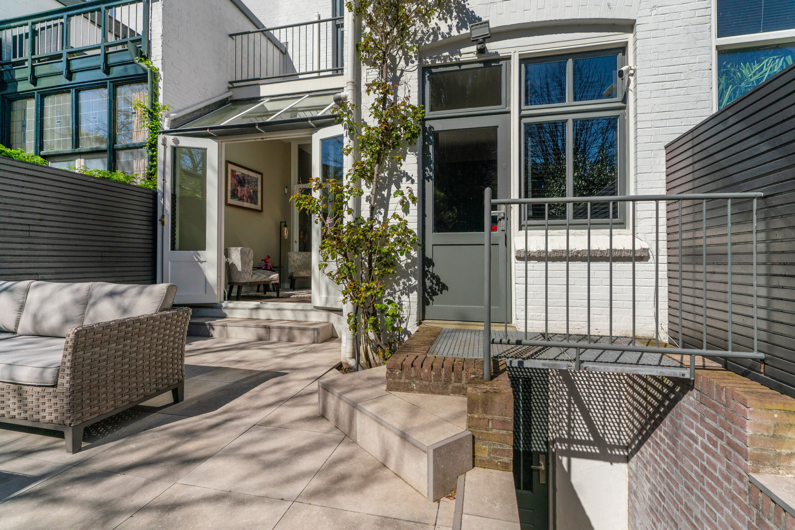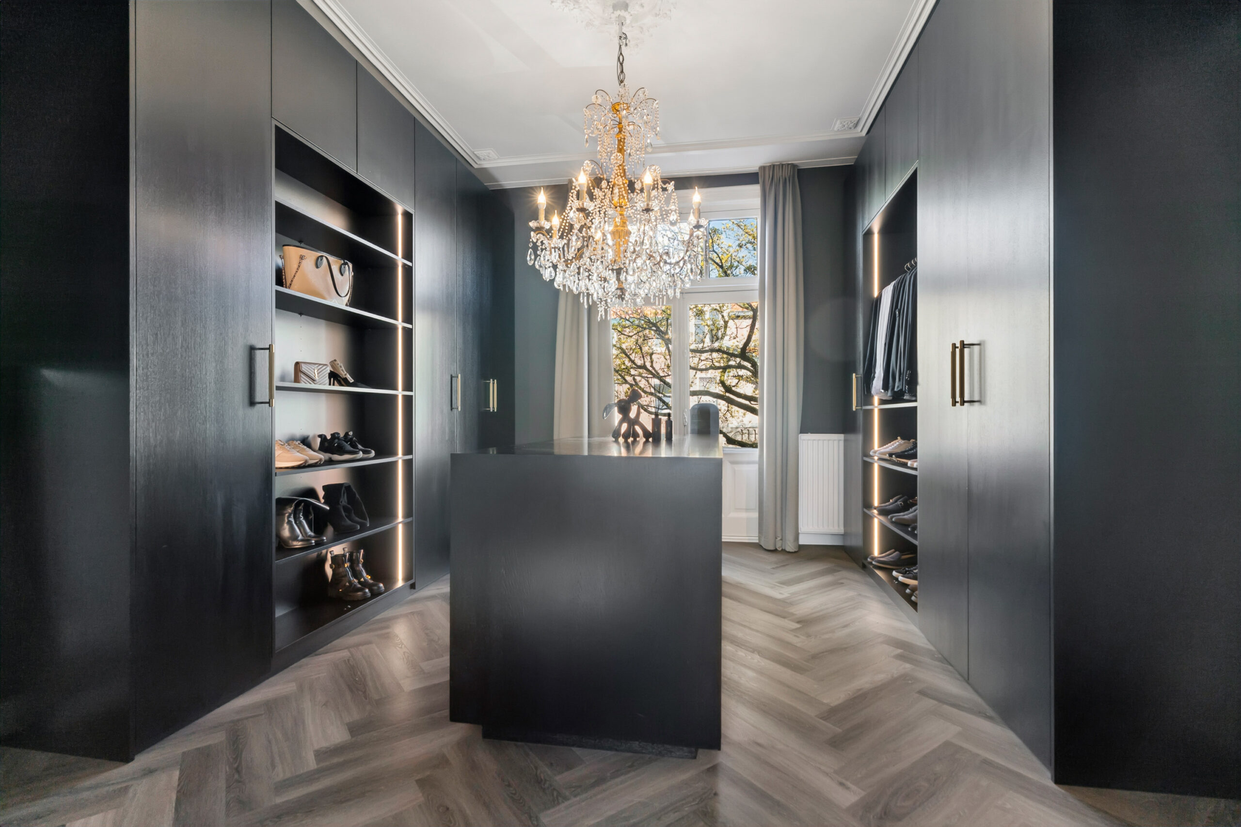 De royale woonkamer en suite beschikt over originele schuifdeuren en openslaande deuren naar de voortuin, hetgeen zorgt voor een aangename lichtinval en een optimale verbinding met buiten. Aan de achterzijde bevindt zich de serre, rijk aan daglicht en voorzien van openslaande deuren naar de diepe en fraai aangelegde stadstuin. De dichte keuken biedt eveneens toegang tot de tuin en is uitgerust met diverse hoogwaardige inbouwapparatuur, te weten een combioven, combistoomoven, extra grote inductiekookplaat (4-pits) met geïntegreerde afzuiging, wijnkoelkast, vaatwasser, vriezer XL, koelkast XL en een Quooker voor direct kokend water. De vloeren in de woonkamer en keuken zijn afgewerkt met PVC.
