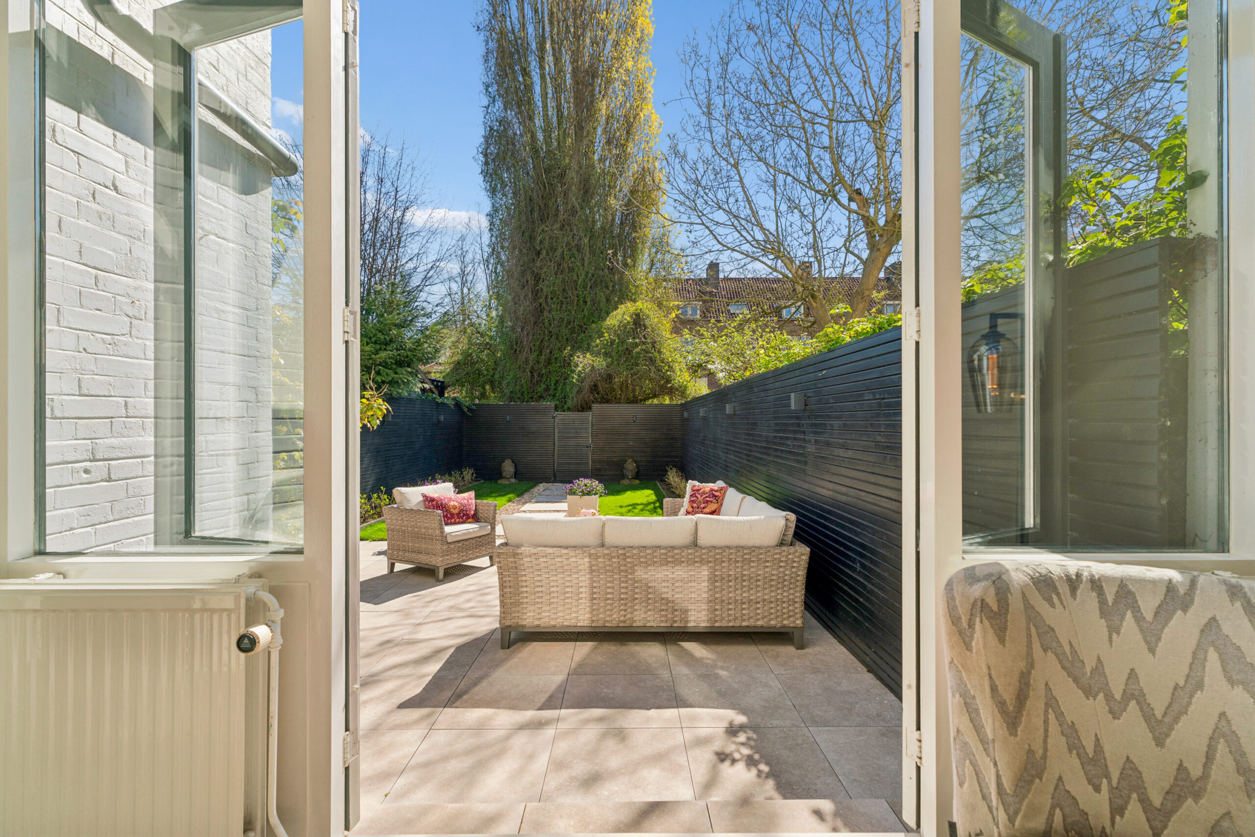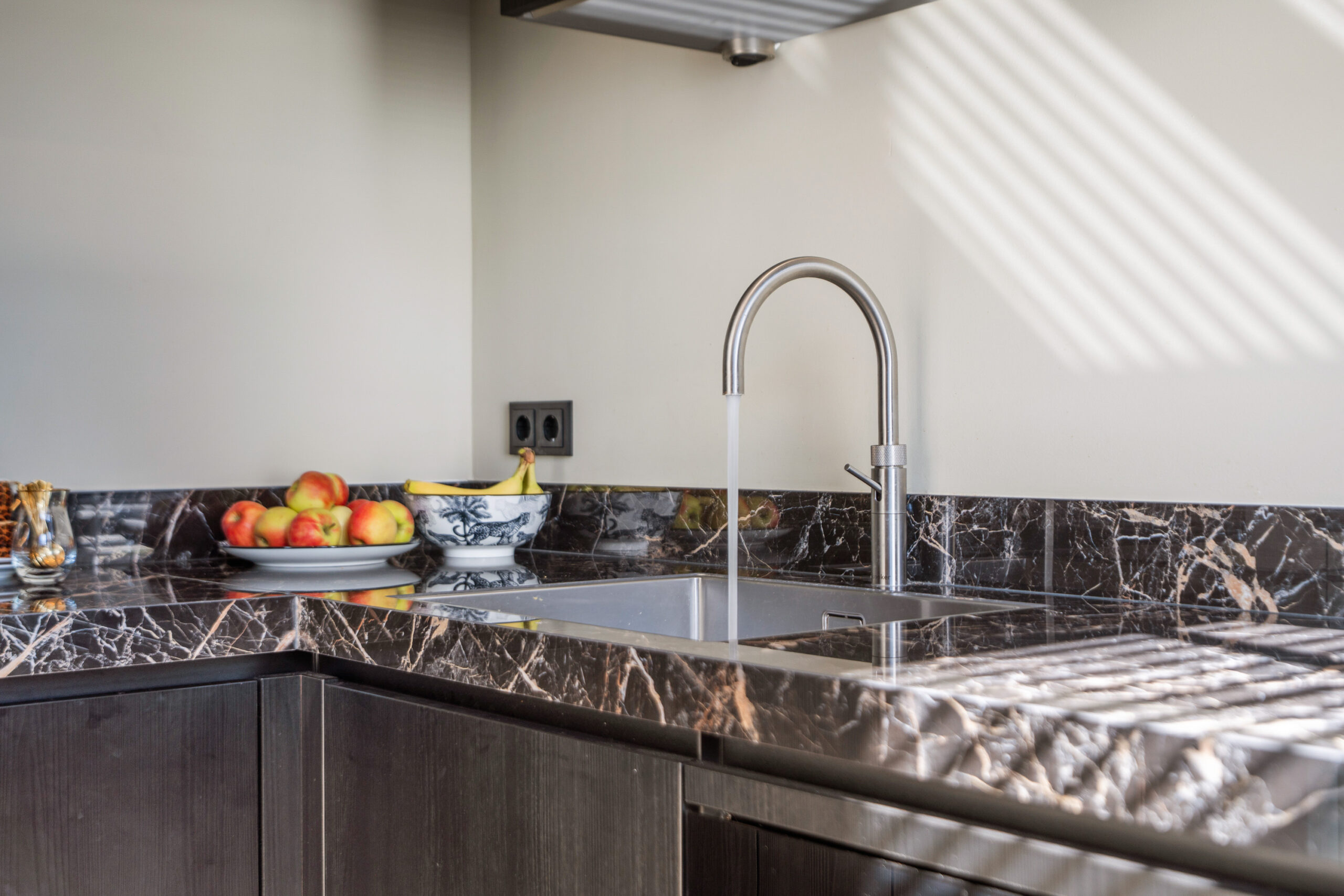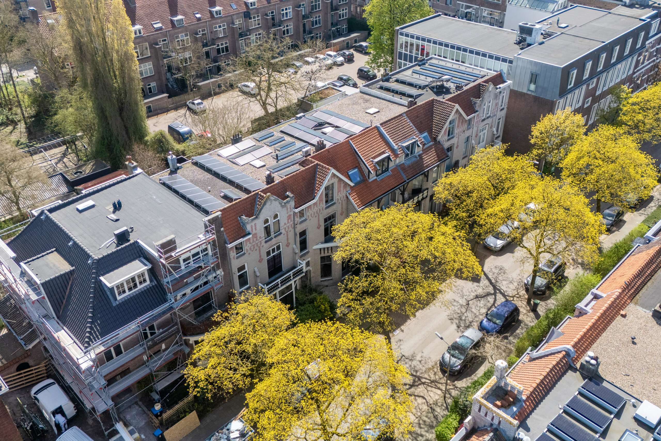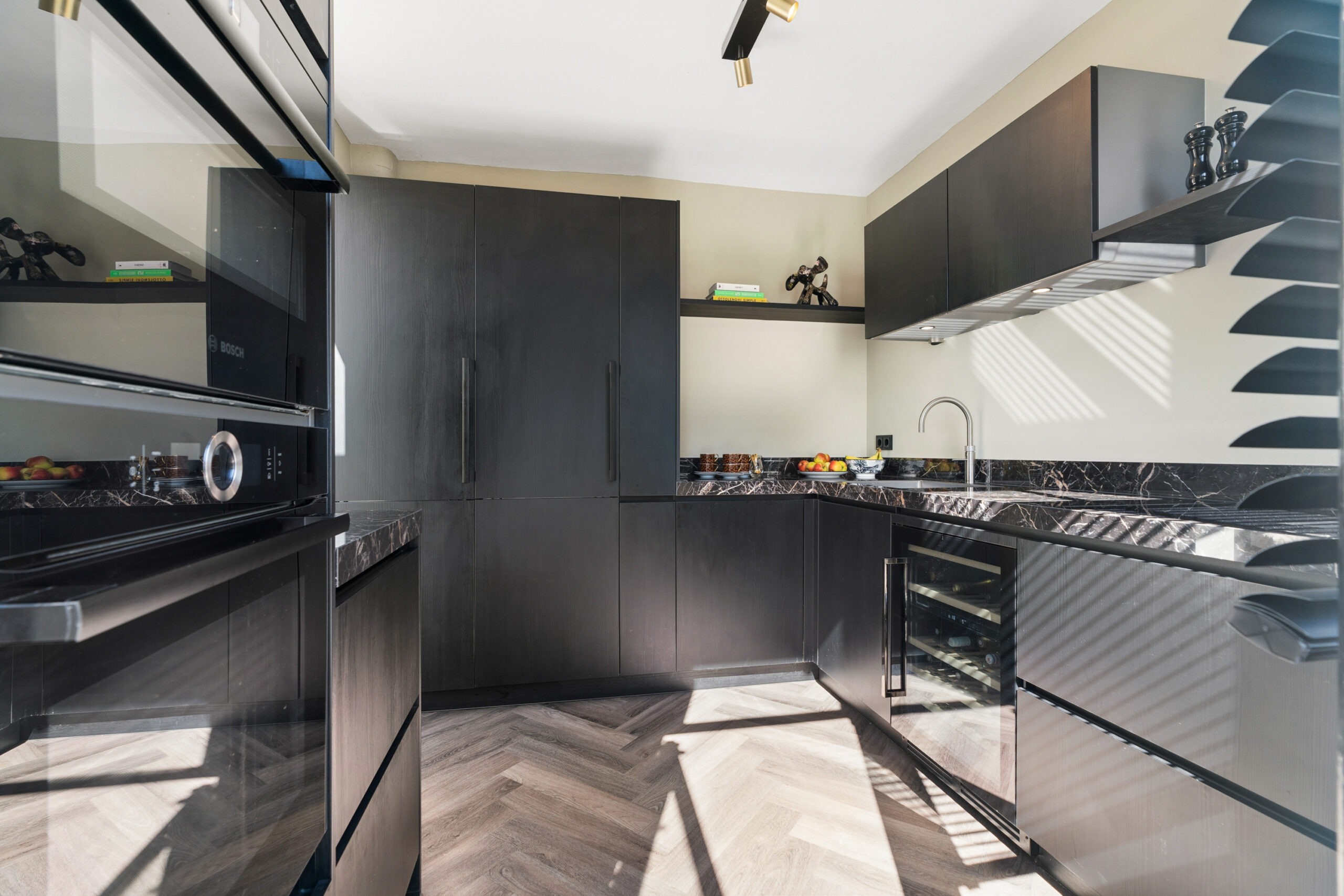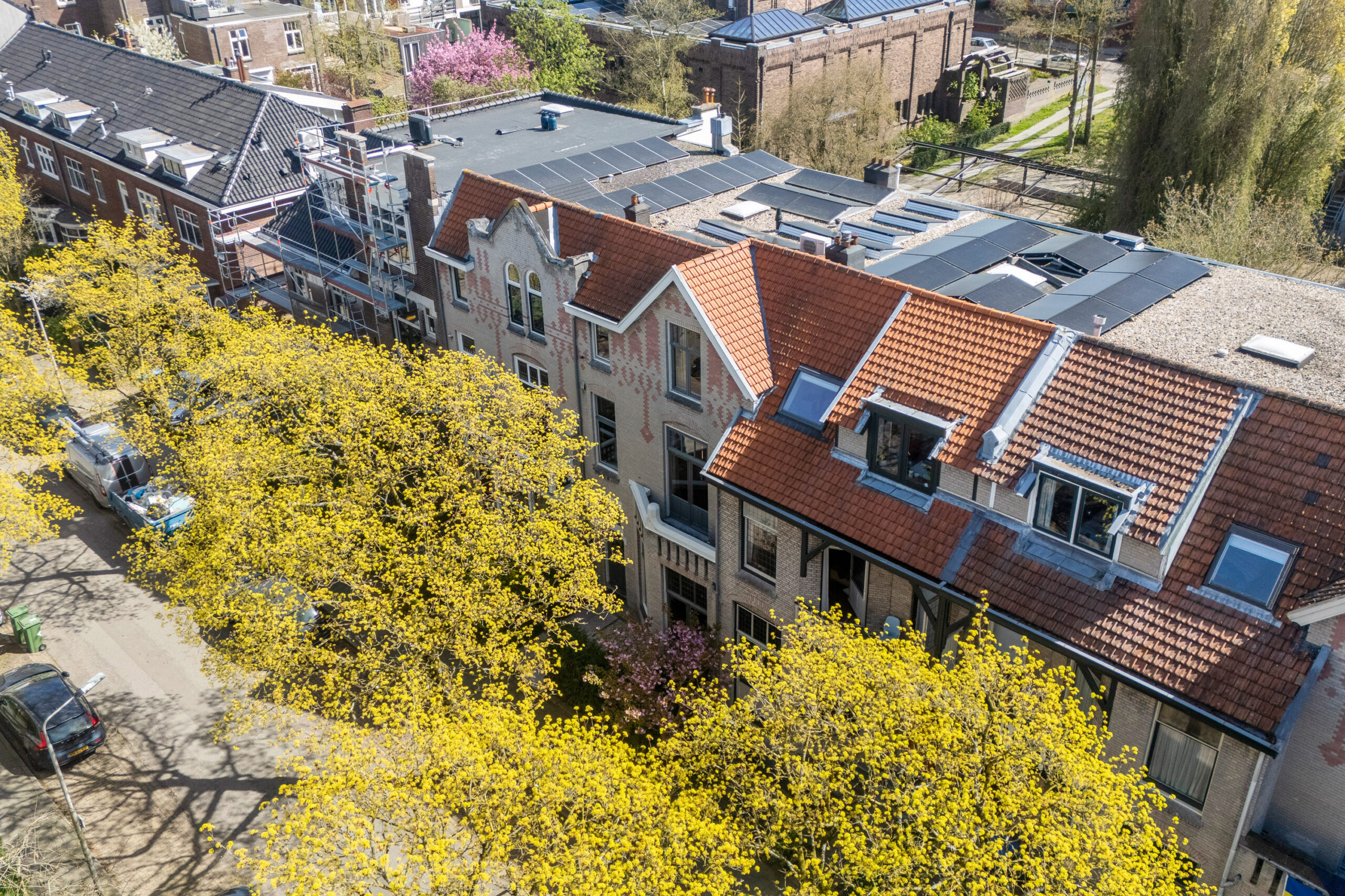 De royale woonkamer en suite beschikt over originele schuifdeuren en openslaande deuren naar de voortuin, hetgeen zorgt voor een aangename lichtinval en een optimale verbinding met buiten. Aan de achterzijde bevindt zich de serre, rijk aan daglicht en voorzien van openslaande deuren naar de diepe en fraai aangelegde stadstuin. De dichte keuken biedt eveneens toegang tot de tuin en is uitgerust met diverse hoogwaardige inbouwapparatuur, te weten een combioven, combistoomoven, extra grote inductiekookplaat (4-pits) met geïntegreerde afzuiging, wijnkoelkast, vaatwasser, vriezer XL, koelkast XL en een Quooker voor direct kokend water. De vloeren in de woonkamer en keuken zijn afgewerkt met PVC.