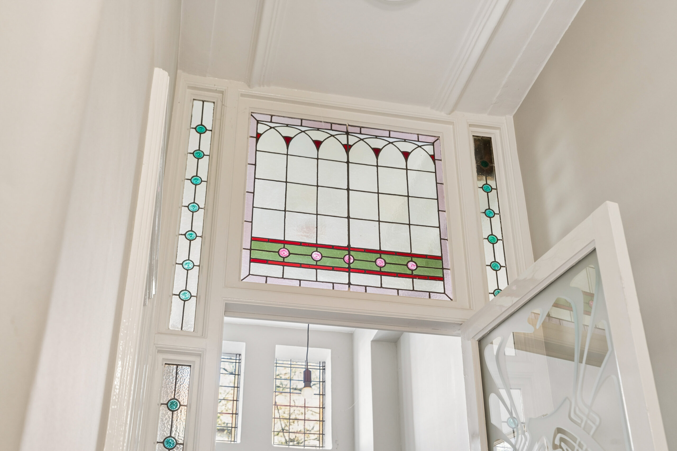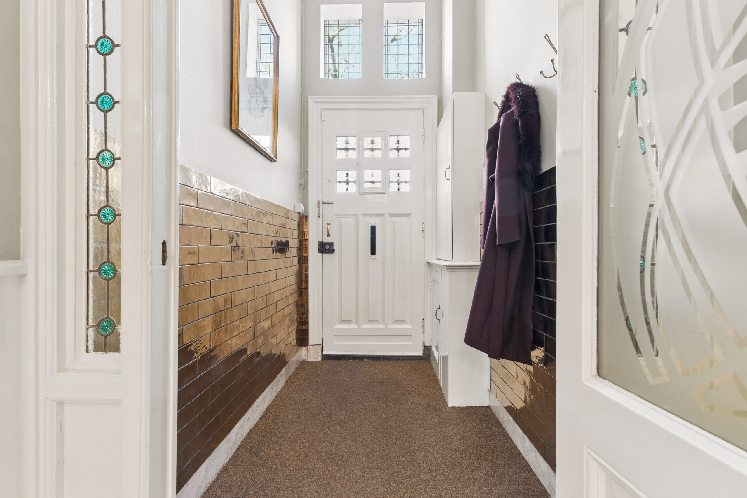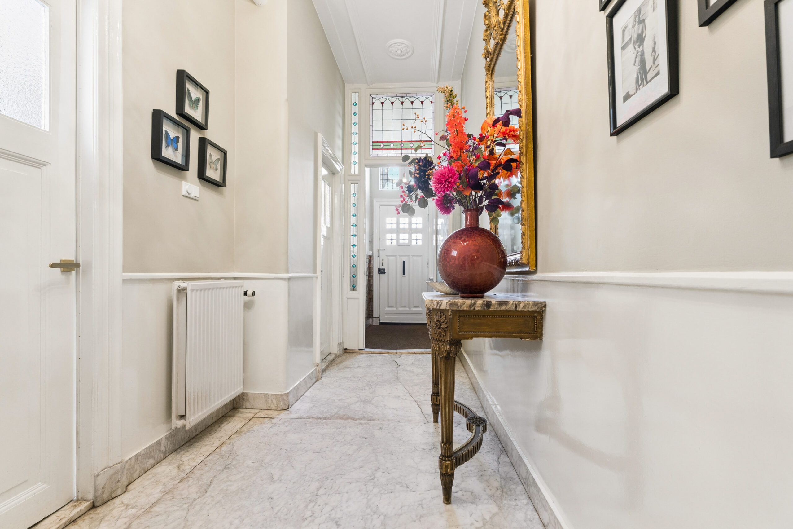 Entree met vestibule, waarna u wordt geleid naar de imposante hal, gekenmerkt door originele marmeren vloeren, fraaie glas-in-lood ramen en een karakteristieke trappartij. Vanuit de hal is er toegang tot het souterrain, de toiletruimte met hangcloset en fontein en de woonkamer.