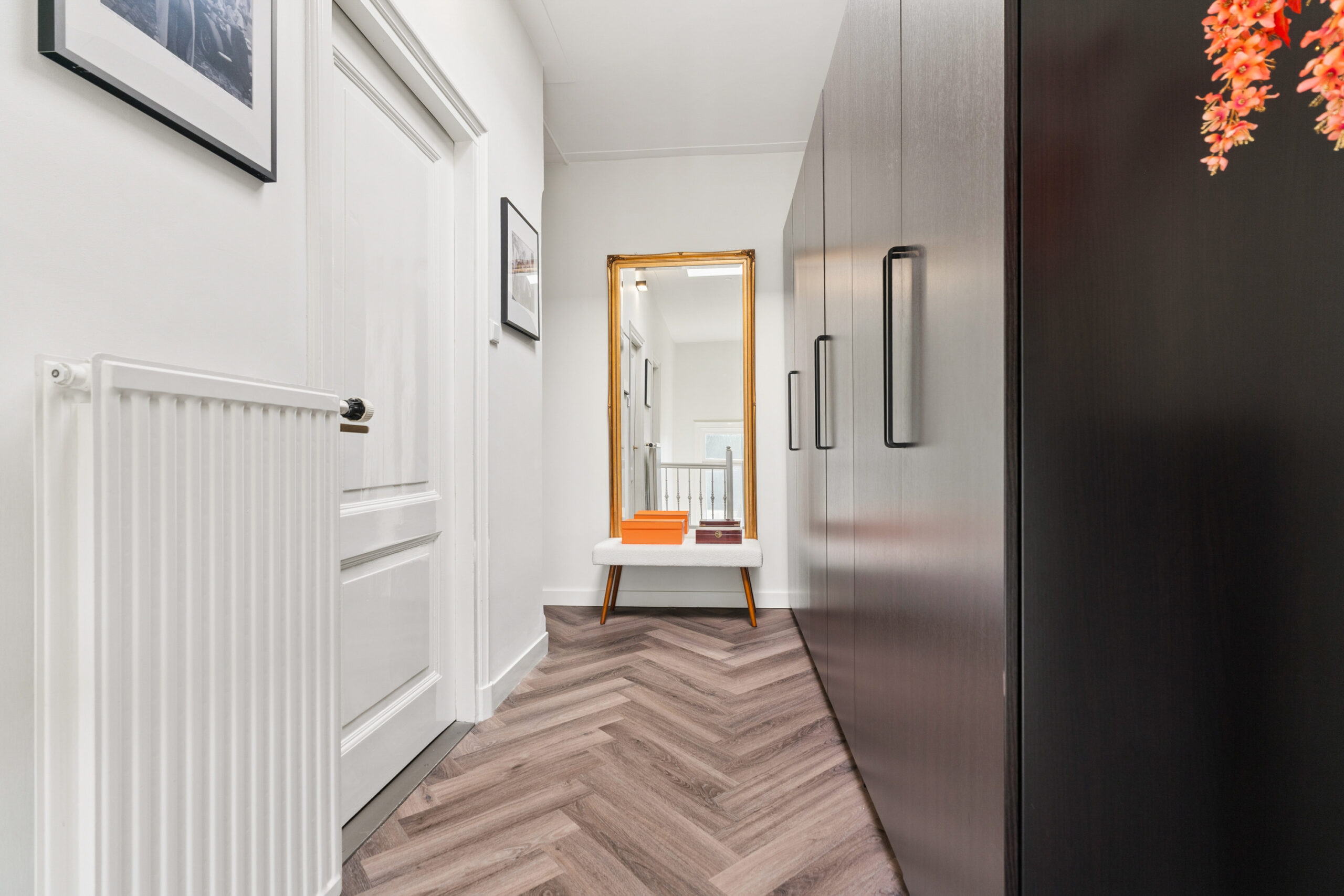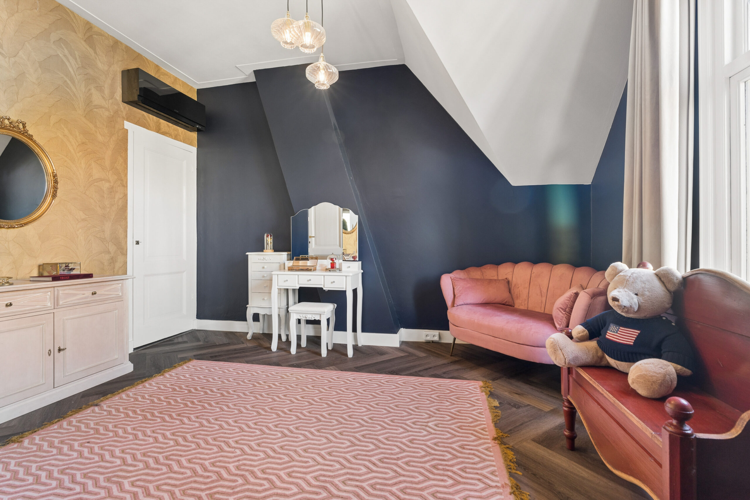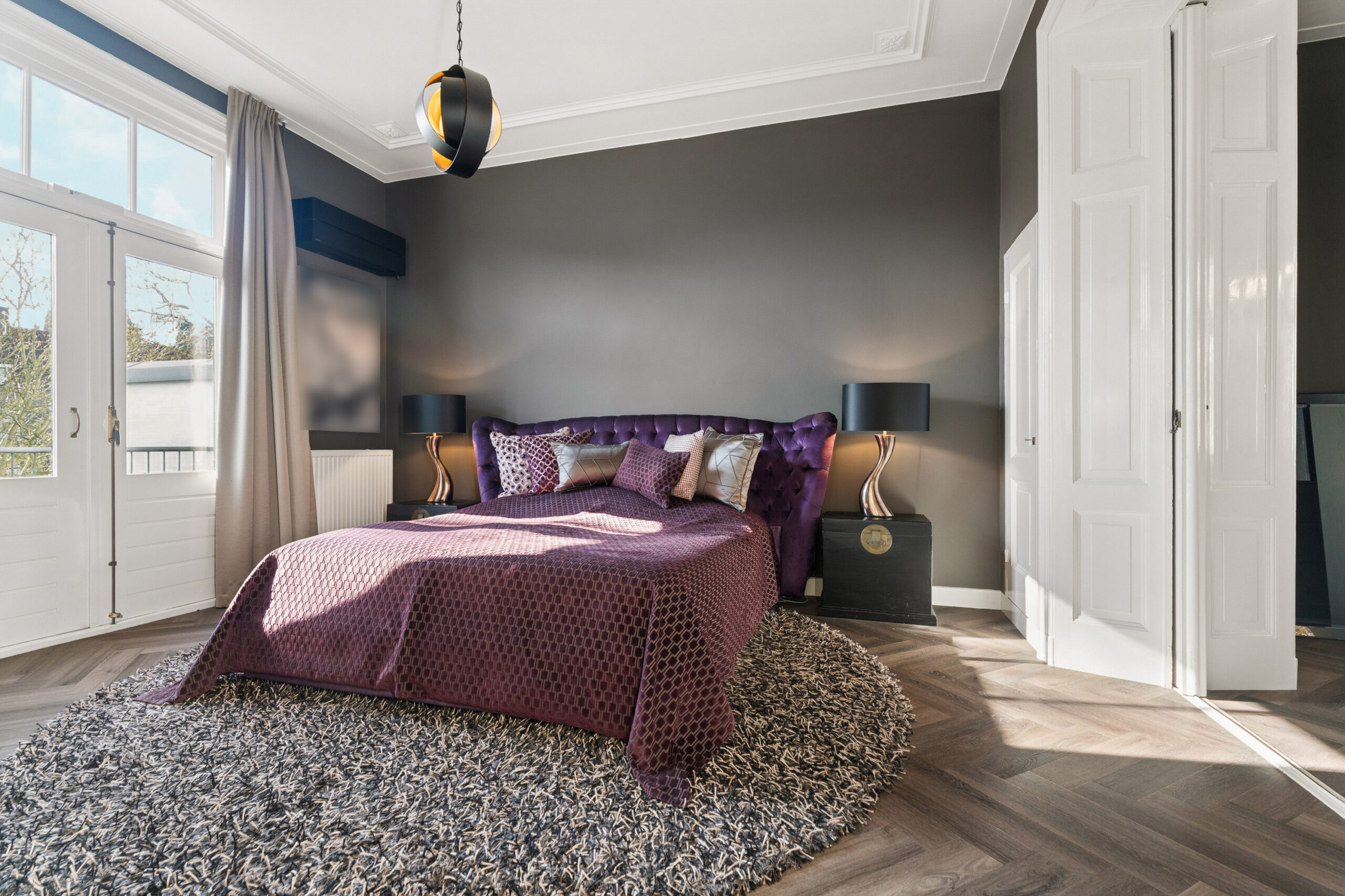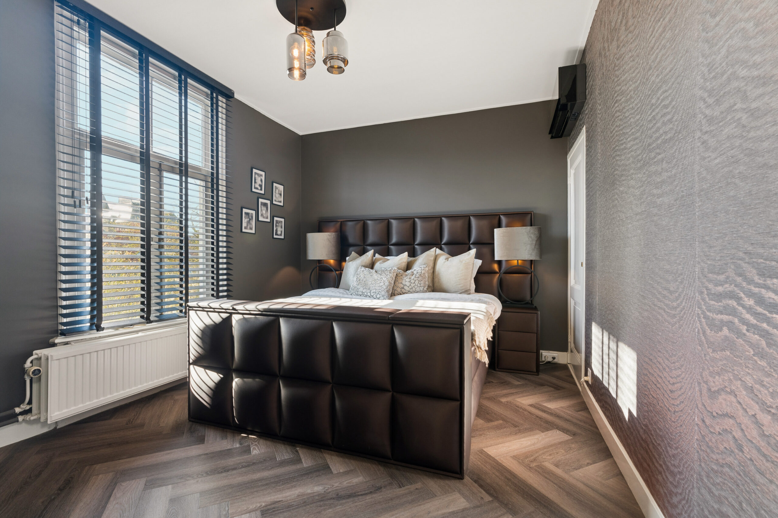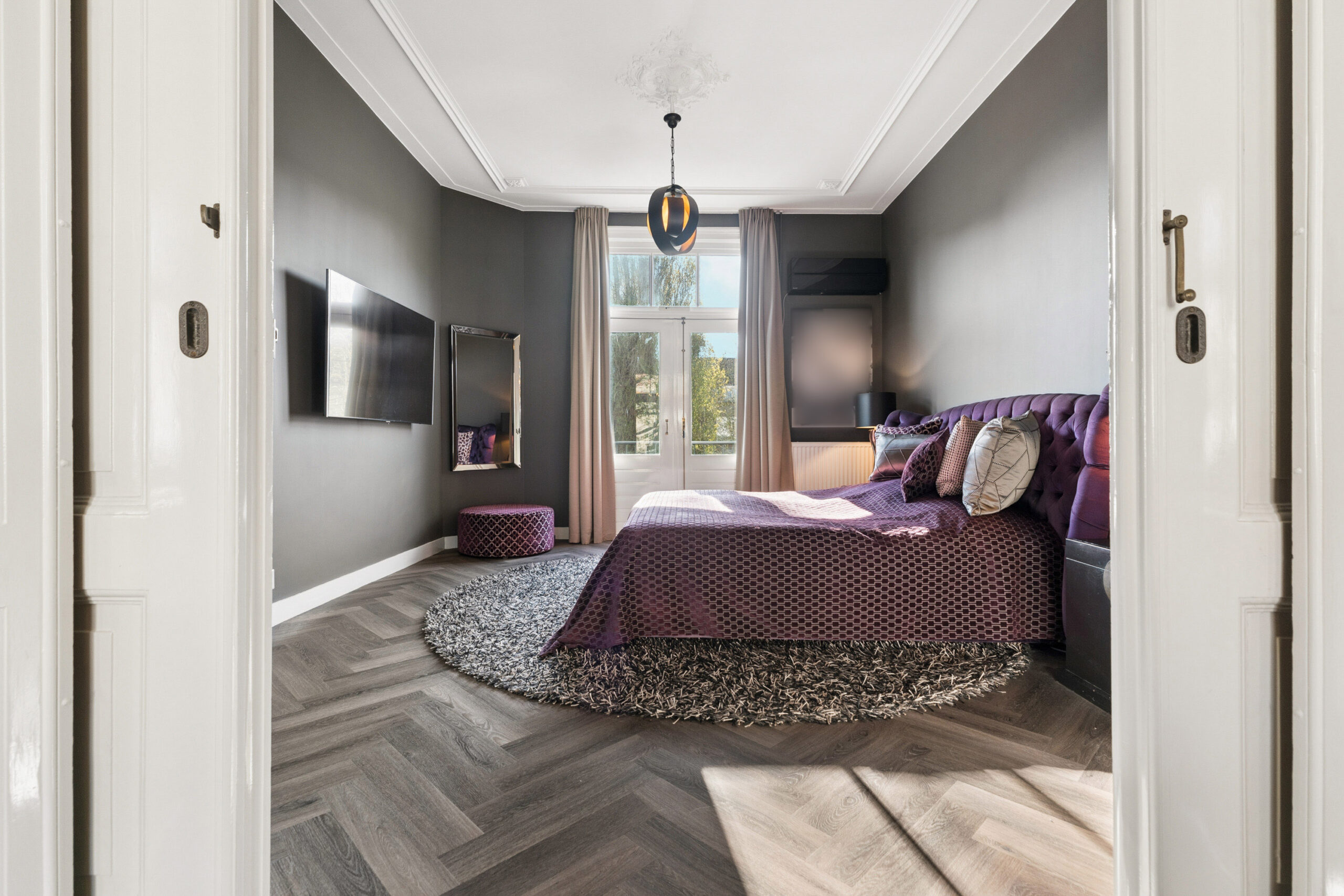 Overloop met toegang tot een toiletruimte voorzien van hangcloset en fontein, alsmede twee royale slaapkamers met fraaie originele ornamenten. De kamers zijn onderling afsluitbaar middels gerenoveerde authentieke en suitedeuren met vaste kasten, waarbij één kamer thans is ingericht als luxe kleedkamer. Beide kamers beschikken over een balkon; het balkon aan de achterzijde is ruim van opzet en bereikbaar via openslaande deuren. De badkamer is stijlvol uitgevoerd en voorzien van een vrijstaand ligbad, een inloopdouche en een extra groot wastafelmeubel met verlichte spiegel. De vloeren op deze verdieping zijn, met uitzondering van de natte ruimtes, afgewerkt met PVC.
