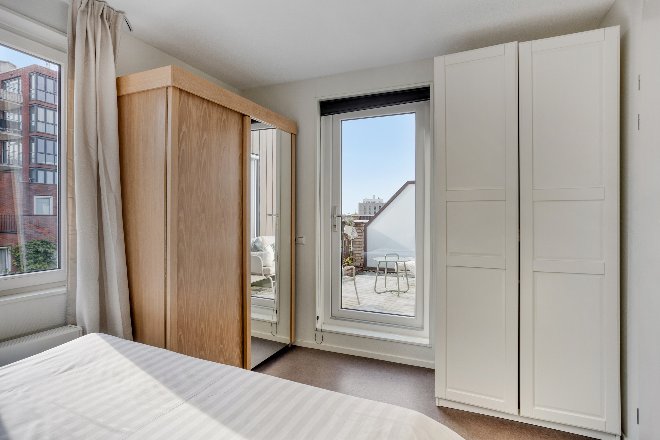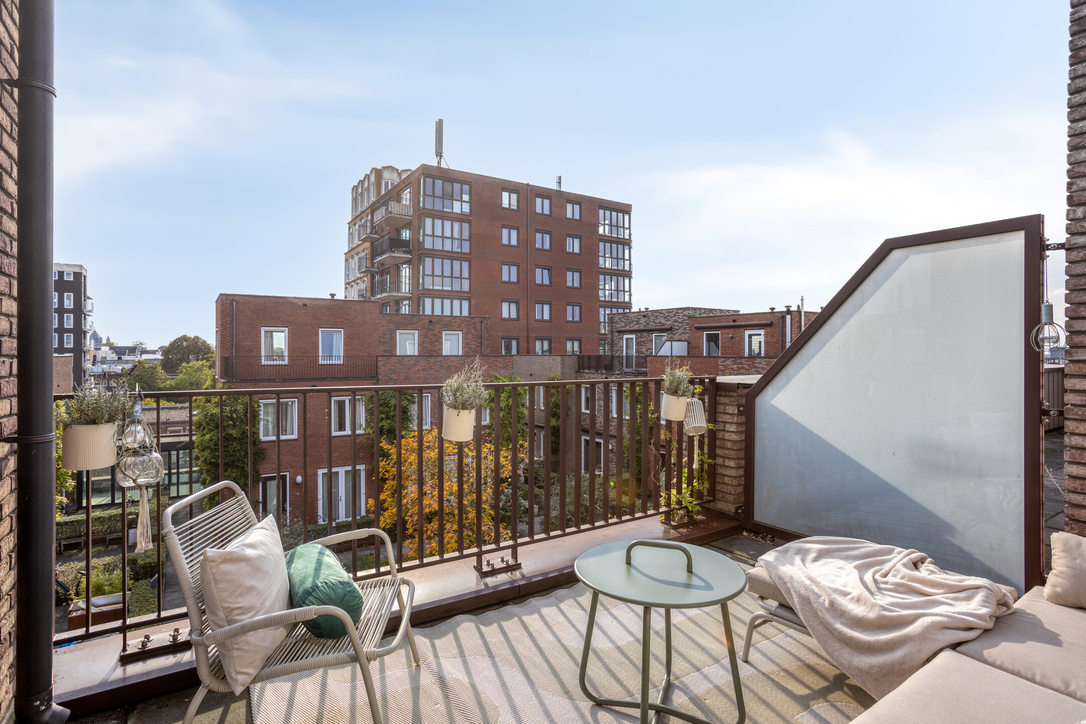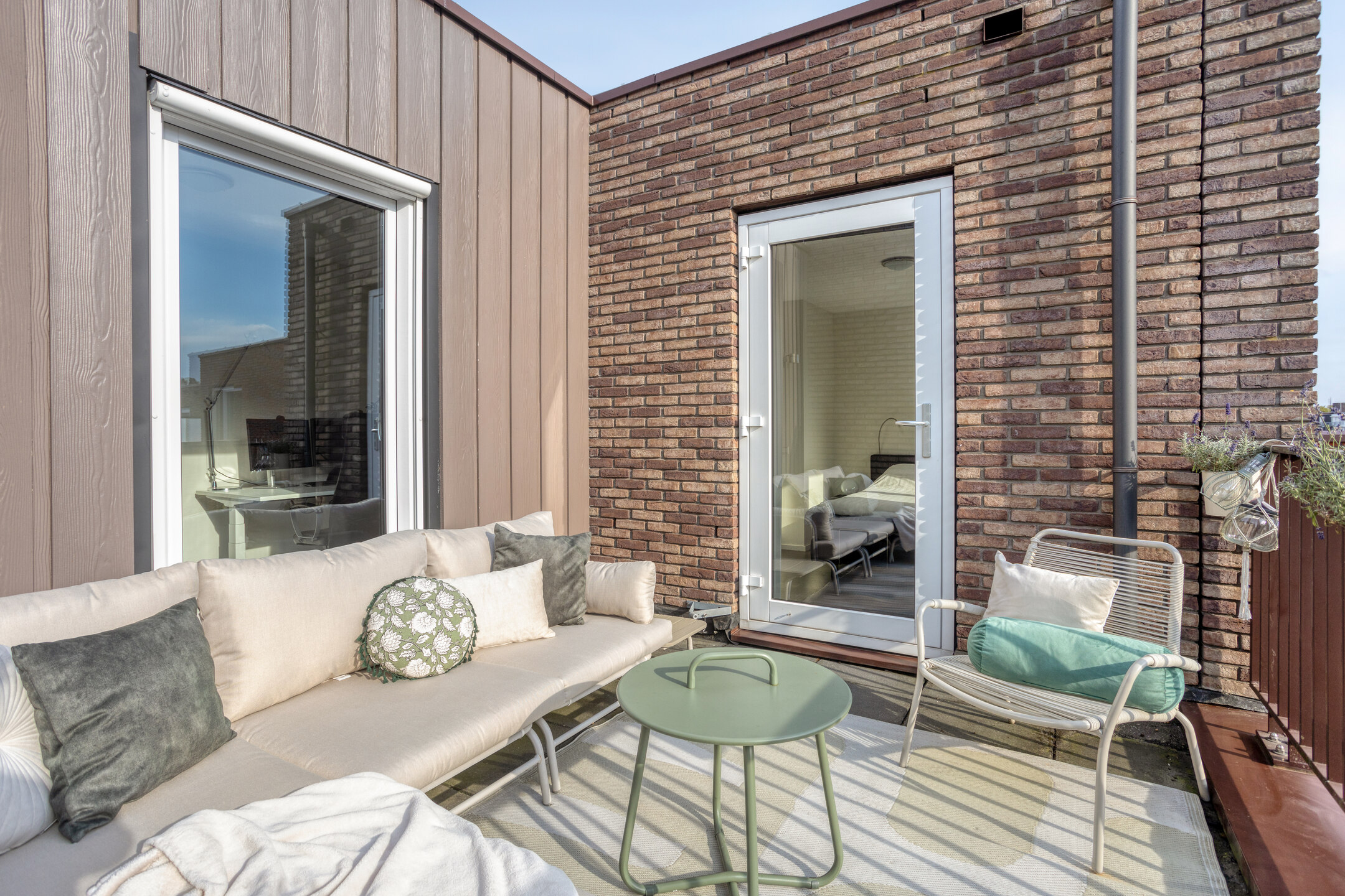 Het appartement beschikt over een zonneterras en een dakterras, beide gunstig gelegen op het zuiden. Het zonneterras, direct naast de voordeur, is volledig betegeld en kijkt uit op de groene binnentuin. Dankzij de afscherming met een haag geniet je hier van optimale privacy. Een groot zonnescherm biedt daarnaast prettige schaduw op warme dagen. Het dakterras, bereikbaar vanaf de tweede verdieping, is ruim opgezet en biedt volop plek om te ontspannen, te loungen of te borrelen in de zon – een heerlijke buitenruimte midden in de stad.