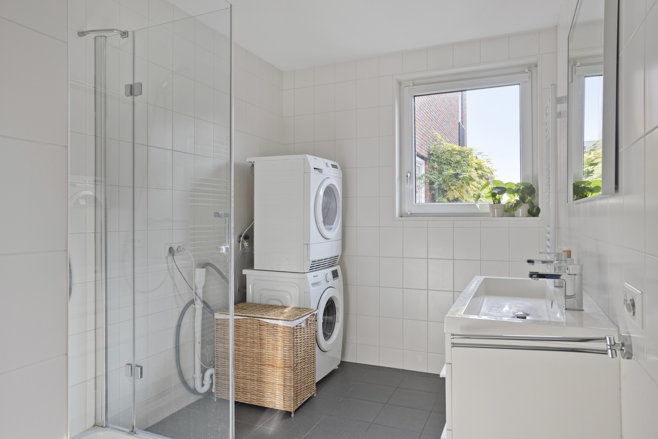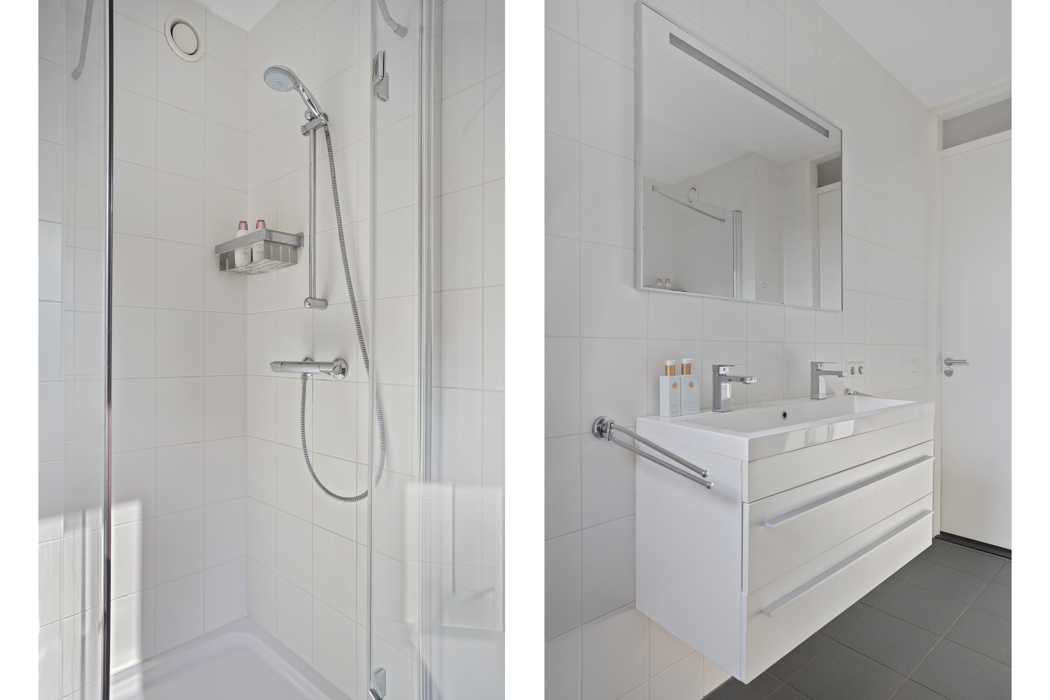 - Douche, dubbele wastafel, wastafelmeubel, wasmachineaansluiting