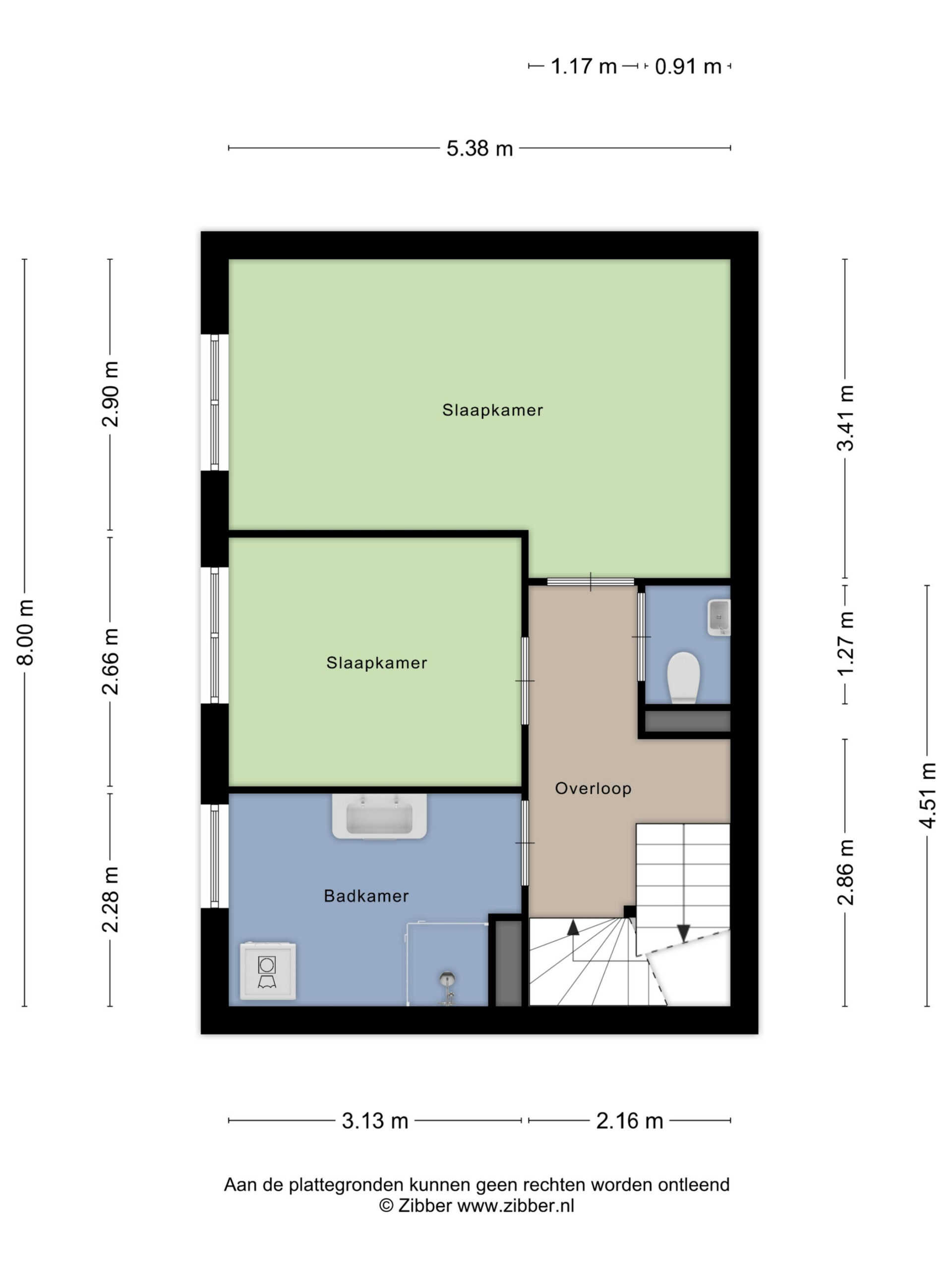 Overloop met toegang tot een separaat toiletruimte met hangcloset en fonteintje. De nette badkamer is ingericht met een douchecabine, dubbel wastafelmeubel en aansluitingen voor witgoed. Daarnaast zijn er voorzieningen aanwezig om – desgewenst – een ligbad te plaatsen. Op deze verdieping bevinden zich verder twee slaapkamers (slaapkamer I en slaapkamer II). De gehele verdieping, met uitzondering van de badkamer en het toilet, is voorzien van een vinylvloer.