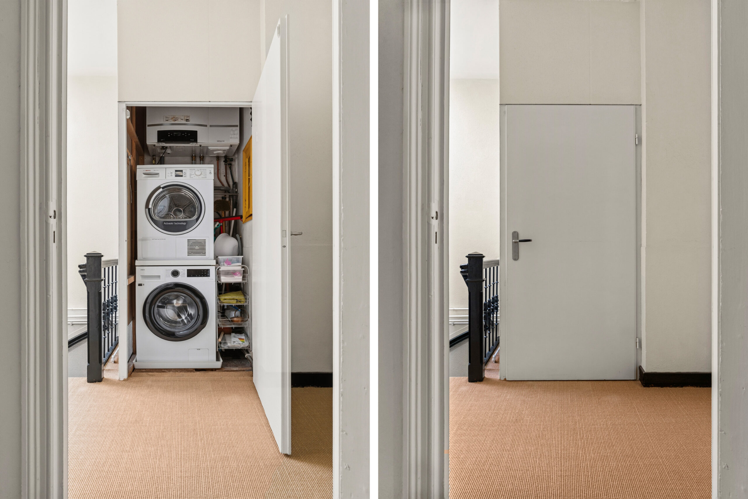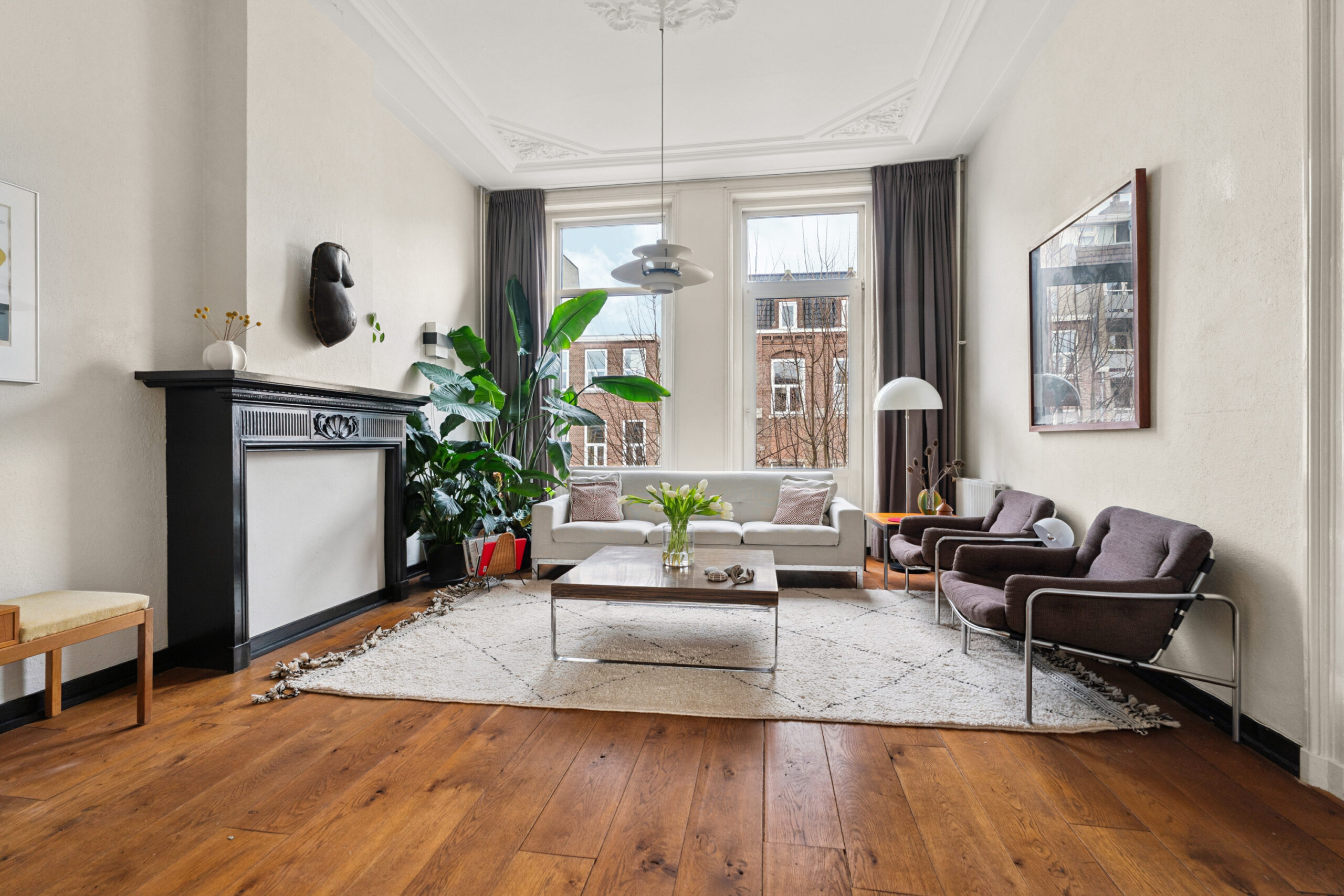 De overloop biedt toegang tot de woonkamer en suite, een werk-/slaapkamer, de toiletruimte en de trapopgang naar zowel de keuken als de tweede verdieping. De royale woonkamer en suite wordt gekenmerkt door hoge plafonds met ornamenten, schuifdeuren met vaste kasten, een karakteristieke schouw en een schuifpui die toegang biedt tot het ruime balkon aan de achterzijde, alsmede tot een balkon aan de voorzijde.