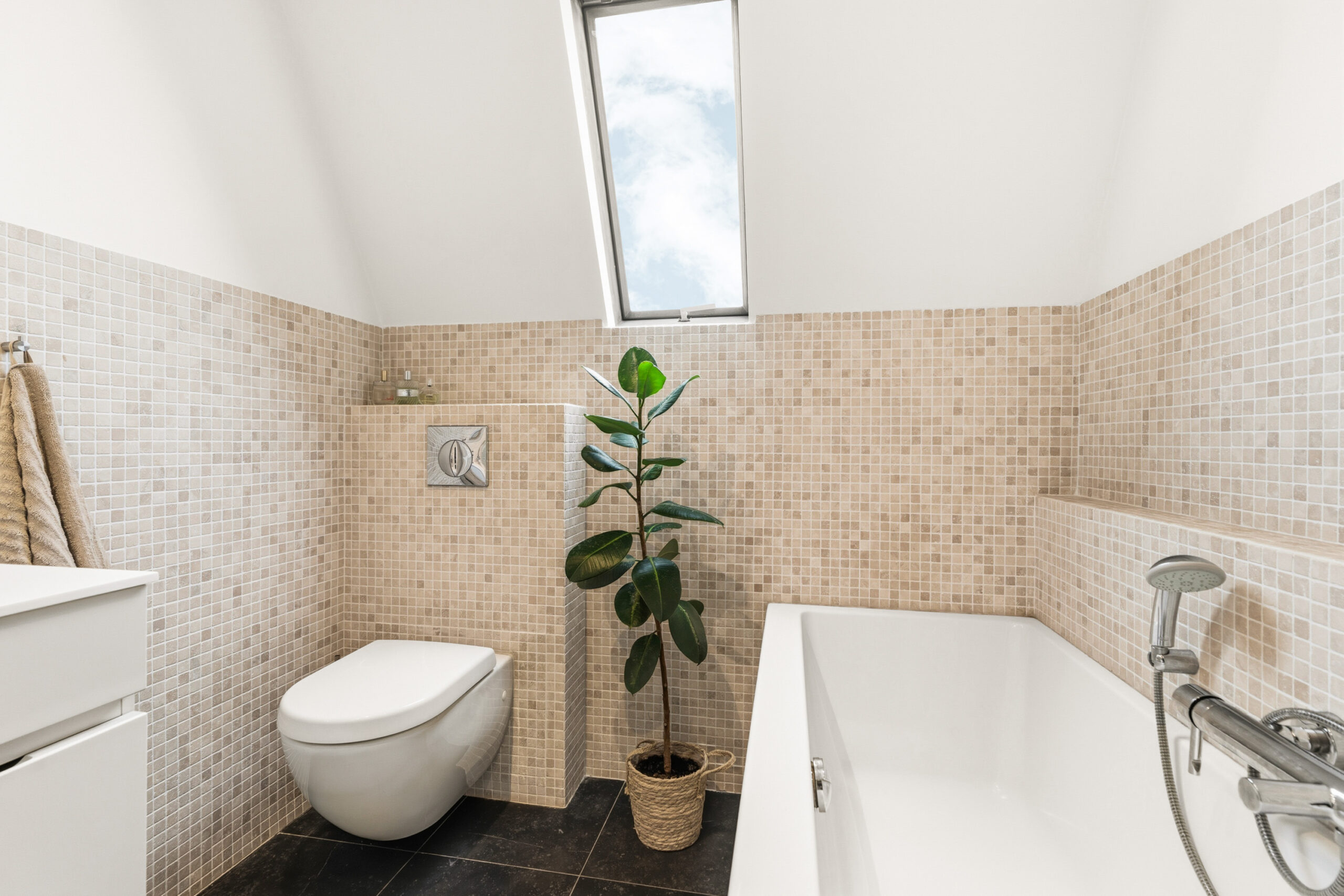- Ligbad, toilet, wastafel, wastafelmeubel, inloopdouche