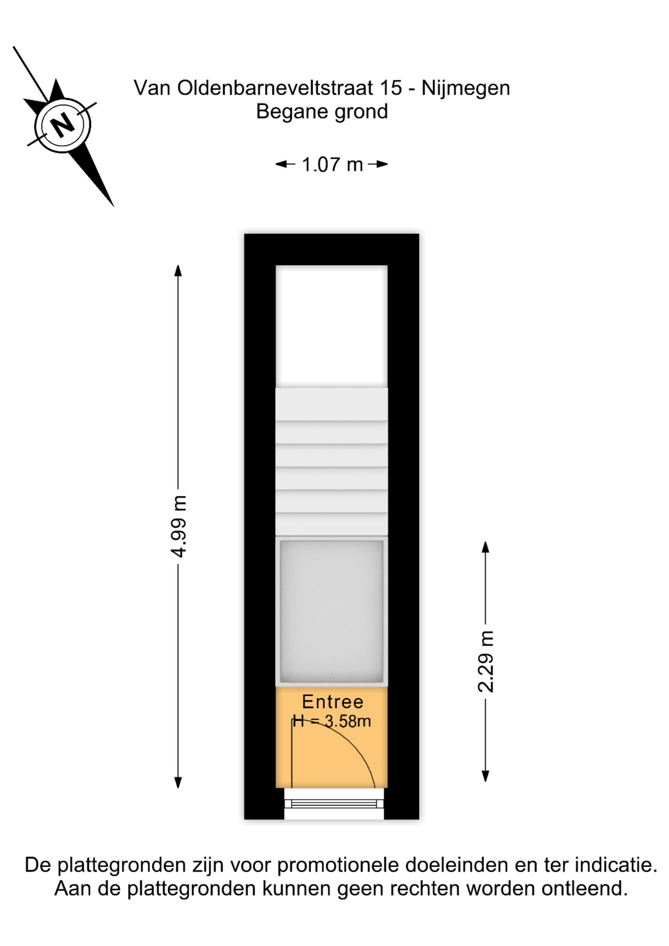 De voortuin biedt ruimte voor het stallen van fietsen. In de hal bevinden zich de gas- en elektrameters. Vanuit de hal is de kelder bereikbaar via een uitschuifbare trap, alsmede de trapopgang naar de verdiepingen.