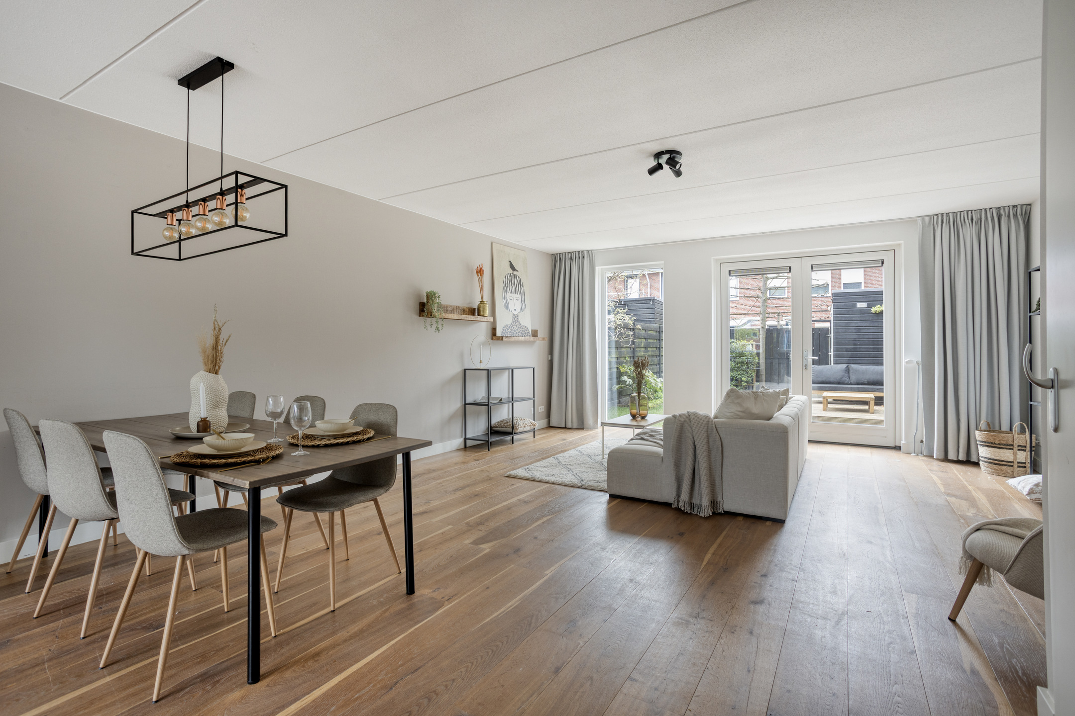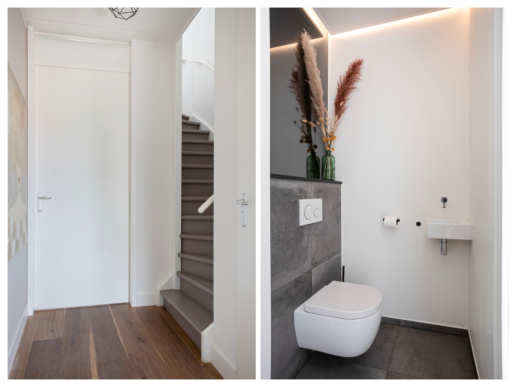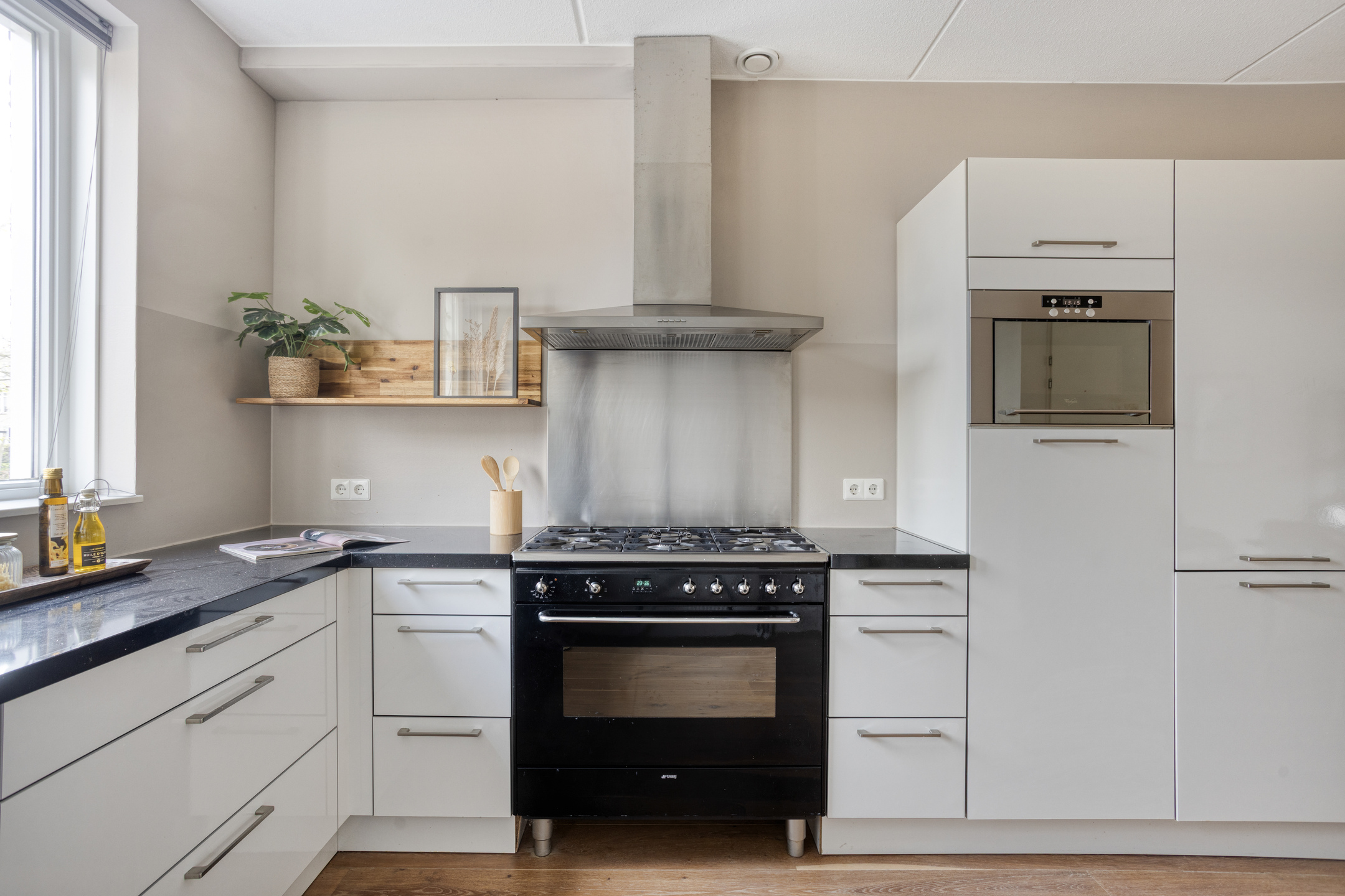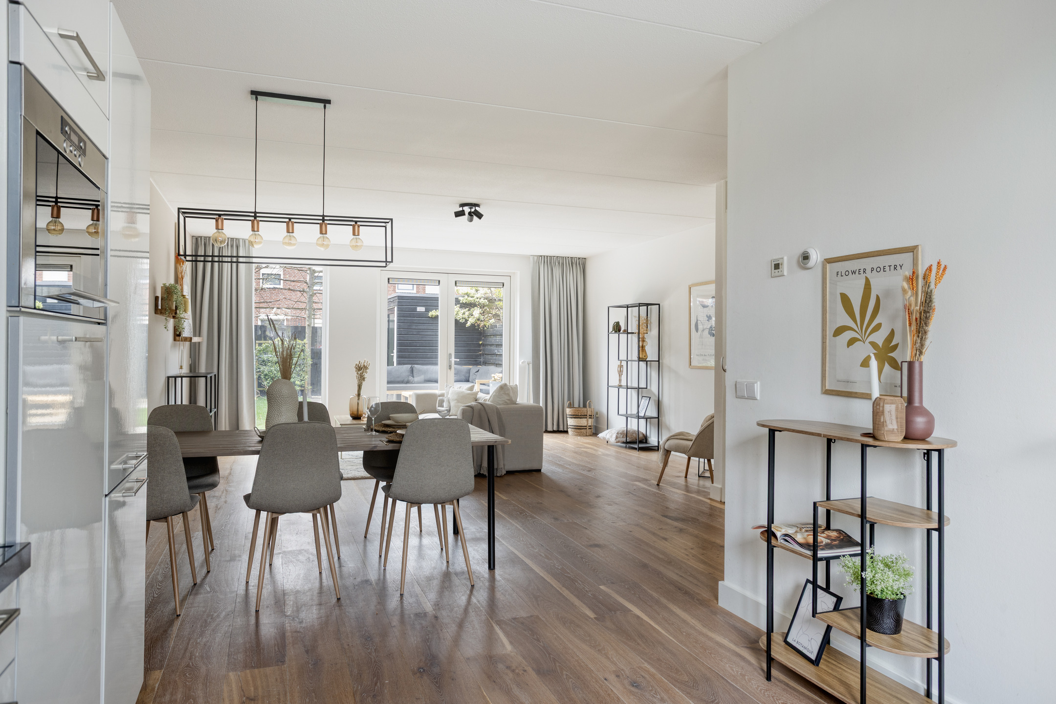 Entree met hal, garderobehoek, meterkast, toiletruimte met hangcloset en fonteintje en trapopgang naar de verdiepingen. Vanuit de hal heb je toegang tot de woonkamer. De tuingerichte woonkamer beschikt over een praktische trapkast en biedt volop ruimte voor ontspanning en gezellig samenzijn. Via de openslaande deuren stap je direct de achtertuin in. Aan de voorzijde van de woning bevindt zich de moderne open keuken, voorzien van diverse inbouwapparatuur, waaronder een 5-pits gasfornuis met oven, afzuigkap, vaatwasser, koel-vriescombinatie en magnetron. Dankzij de grote raampartijen geniet je van een aangename hoeveelheid daglicht. De gehele begane grond is afgewerkt met een fraaie eikenhouten vloer, wat zorgt voor een warme en stijlvolle uitstraling.