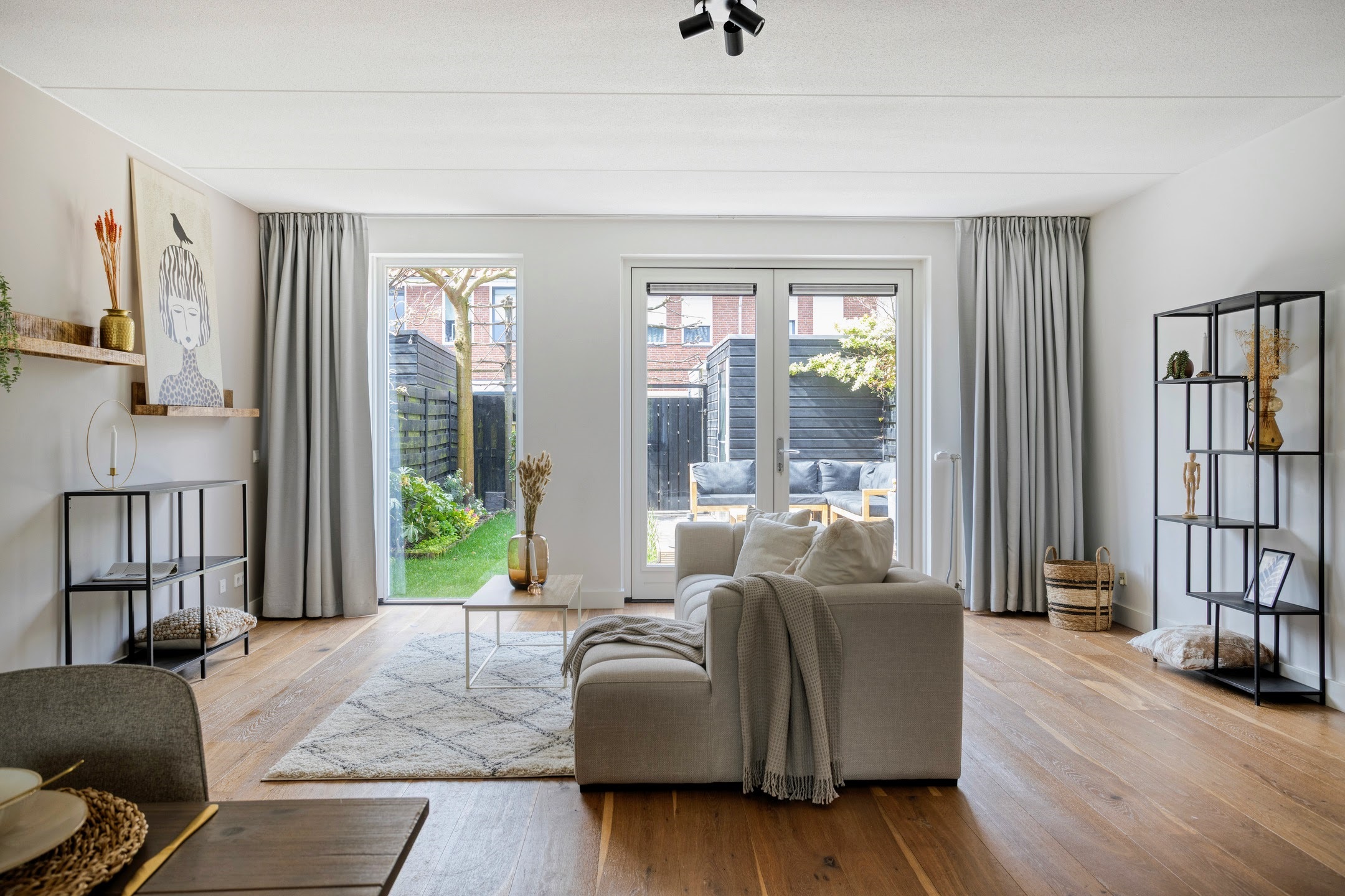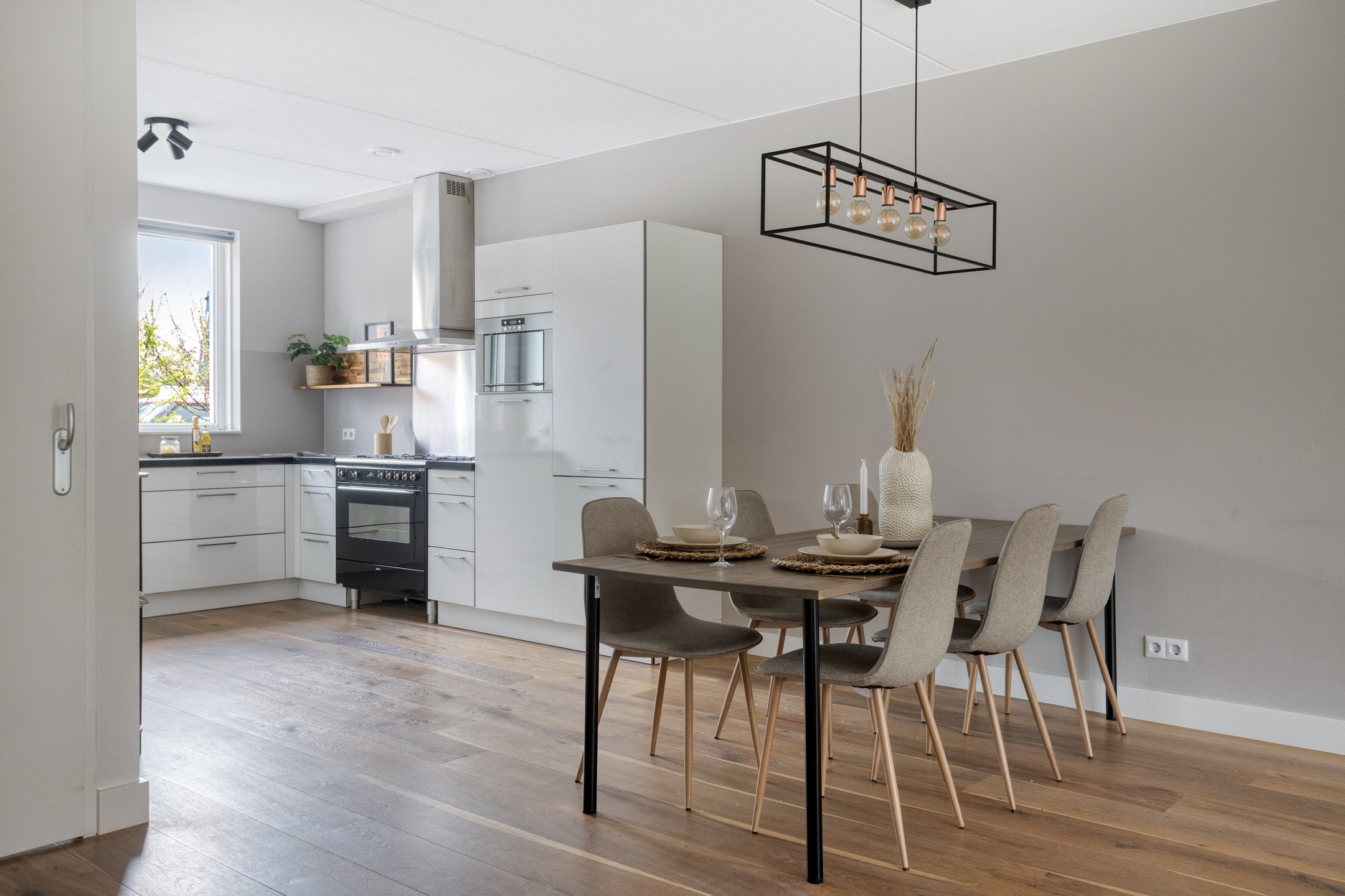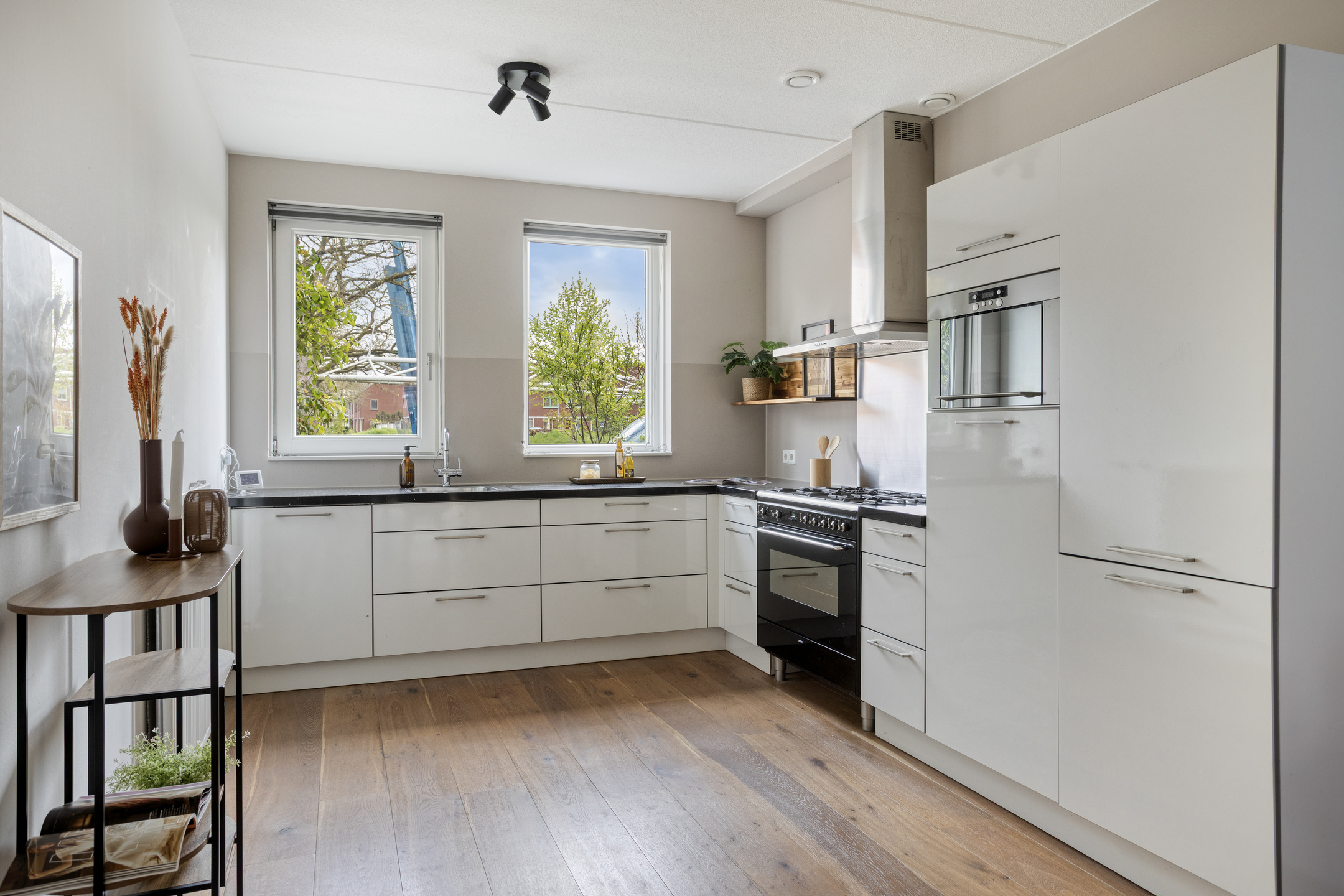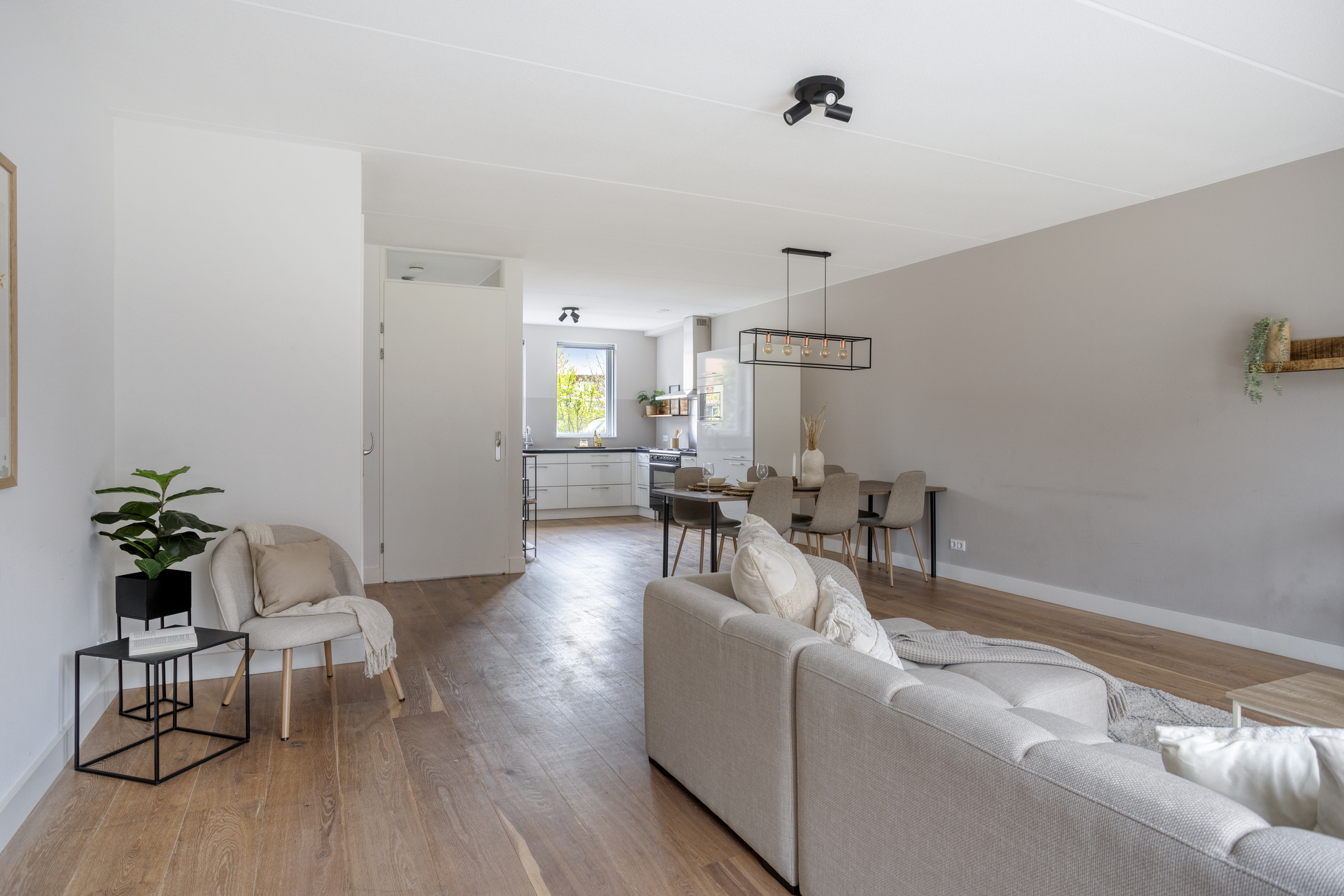 Entree met hal, garderobehoek, meterkast, toiletruimte met hangcloset en fonteintje en trapopgang naar de verdiepingen. Vanuit de hal heb je toegang tot de woonkamer. De tuingerichte woonkamer beschikt over een praktische trapkast en biedt volop ruimte voor ontspanning en gezellig samenzijn. Via de openslaande deuren stap je direct de achtertuin in. Aan de voorzijde van de woning bevindt zich de moderne open keuken, voorzien van diverse inbouwapparatuur, waaronder een 5-pits gasfornuis met oven, afzuigkap, vaatwasser, koel-vriescombinatie en magnetron. Dankzij de grote raampartijen geniet je van een aangename hoeveelheid daglicht. De gehele begane grond is afgewerkt met een fraaie eikenhouten vloer, wat zorgt voor een warme en stijlvolle uitstraling.