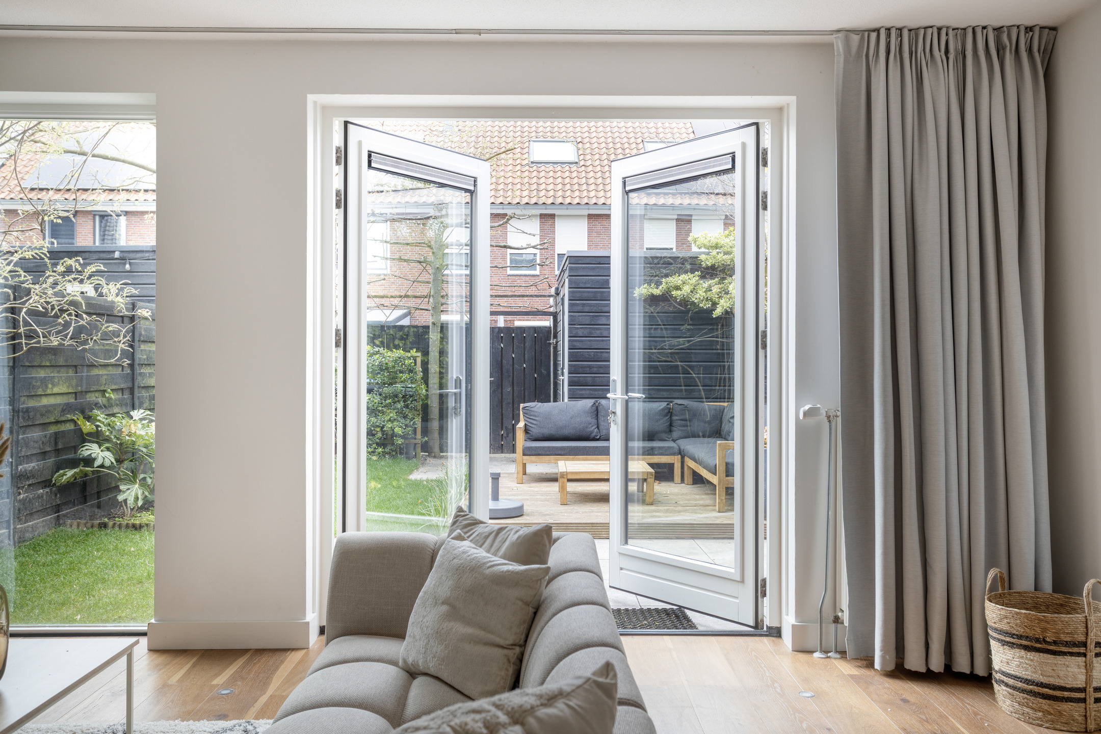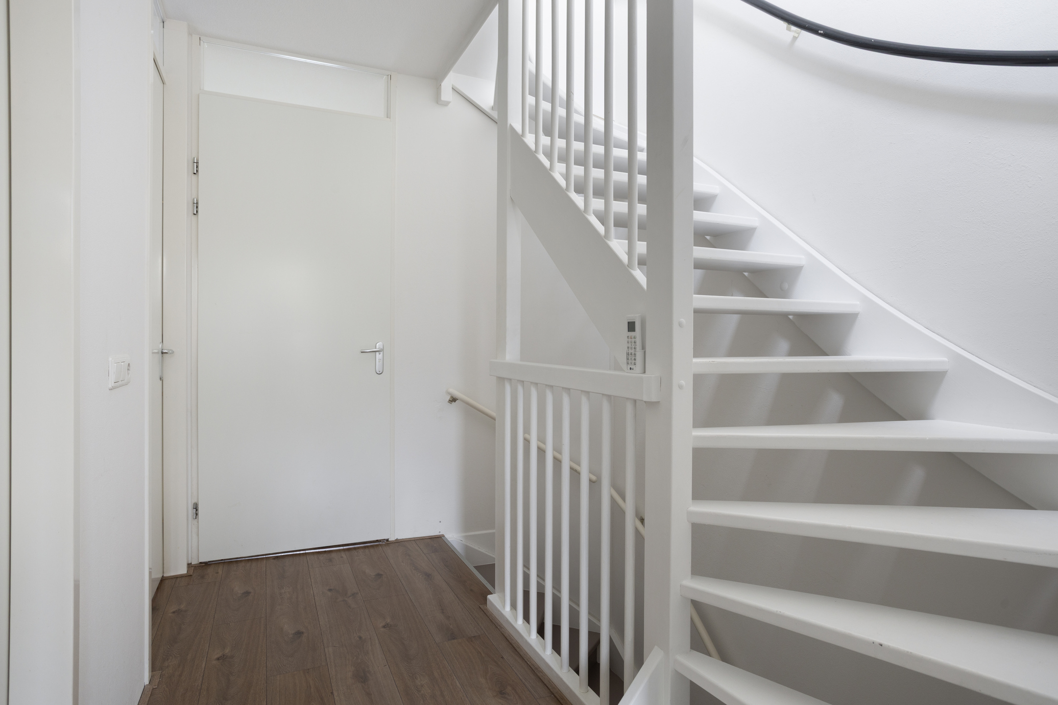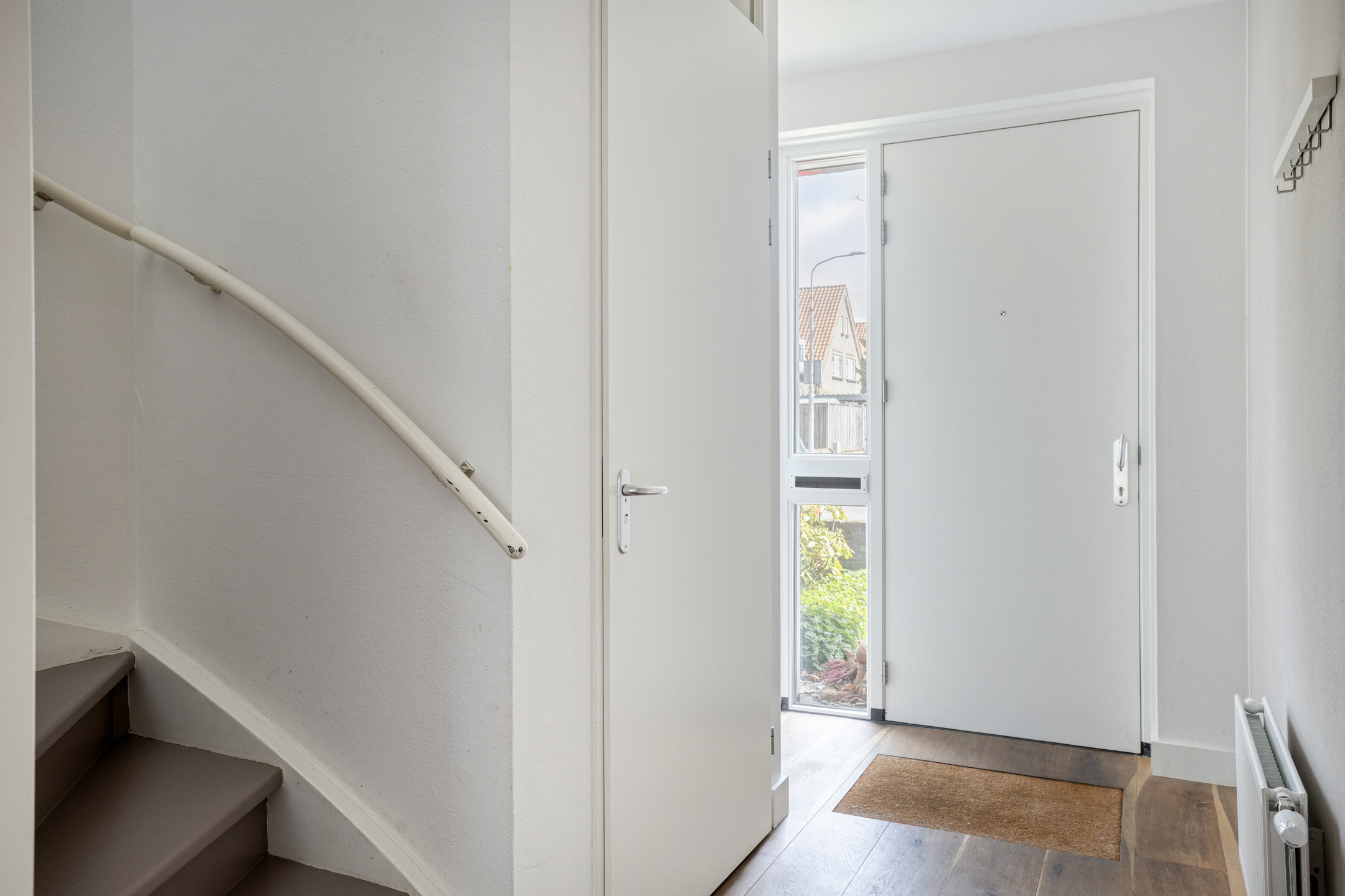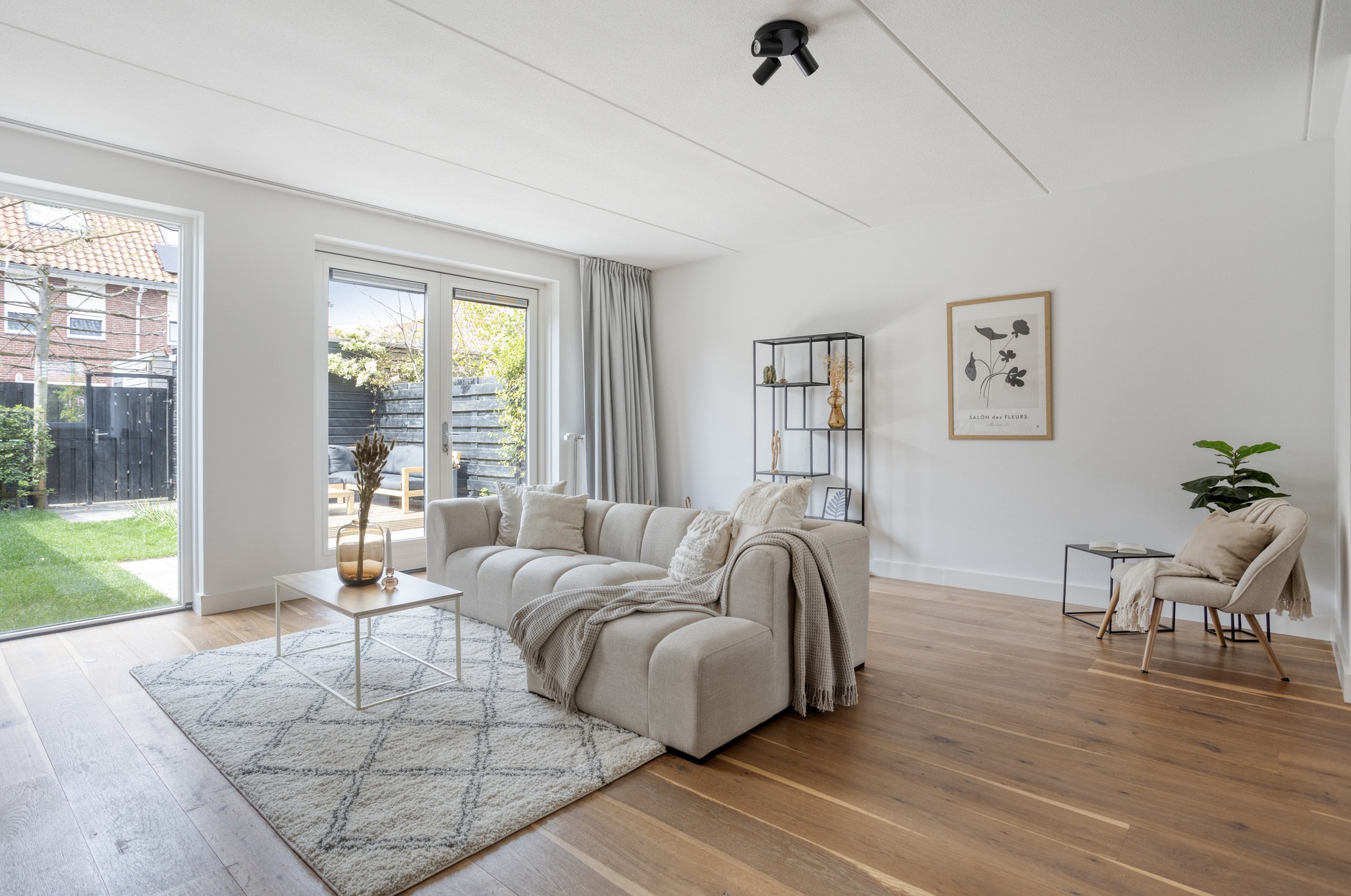 Entree met hal, garderobehoek, meterkast, toiletruimte met hangcloset en fonteintje en trapopgang naar de verdiepingen. Vanuit de hal heb je toegang tot de woonkamer. De tuingerichte woonkamer beschikt over een praktische trapkast en biedt volop ruimte voor ontspanning en gezellig samenzijn. Via de openslaande deuren stap je direct de achtertuin in. Aan de voorzijde van de woning bevindt zich de moderne open keuken, voorzien van diverse inbouwapparatuur, waaronder een 5-pits gasfornuis met oven, afzuigkap, vaatwasser, koel-vriescombinatie en magnetron. Dankzij de grote raampartijen geniet je van een aangename hoeveelheid daglicht. De gehele begane grond is afgewerkt met een fraaie eikenhouten vloer, wat zorgt voor een warme en stijlvolle uitstraling.