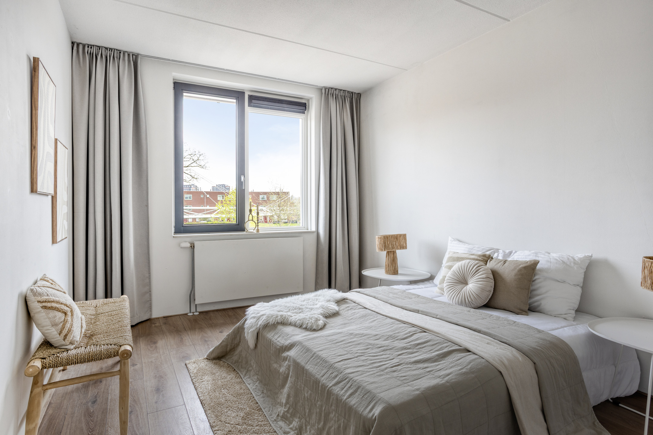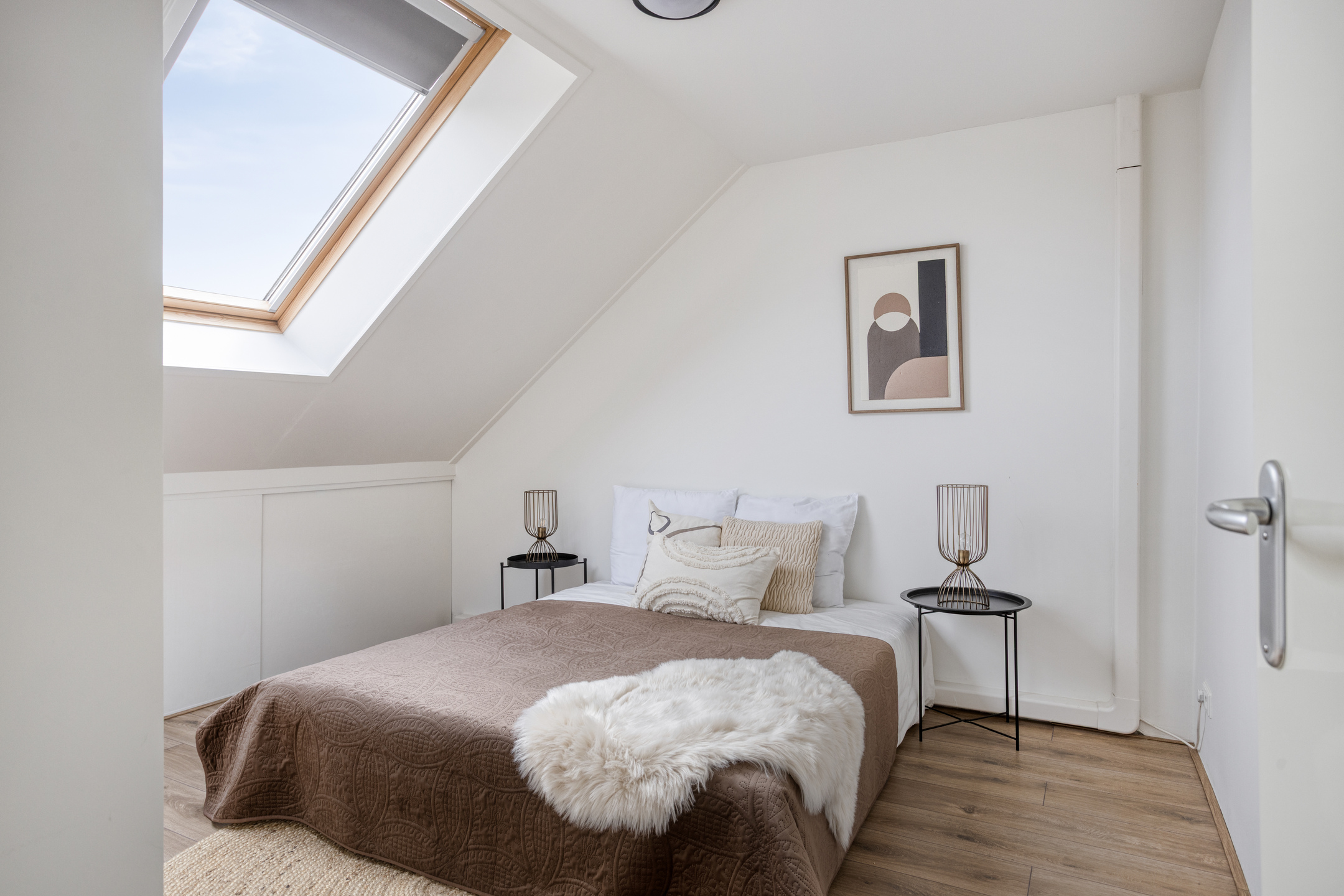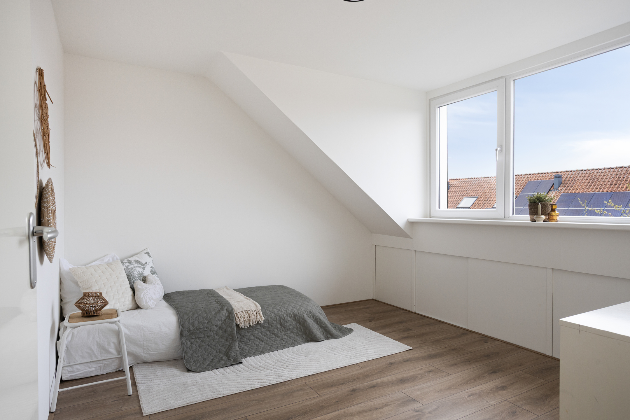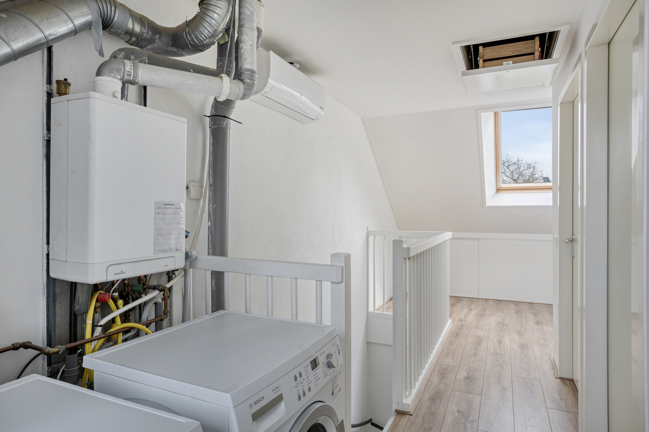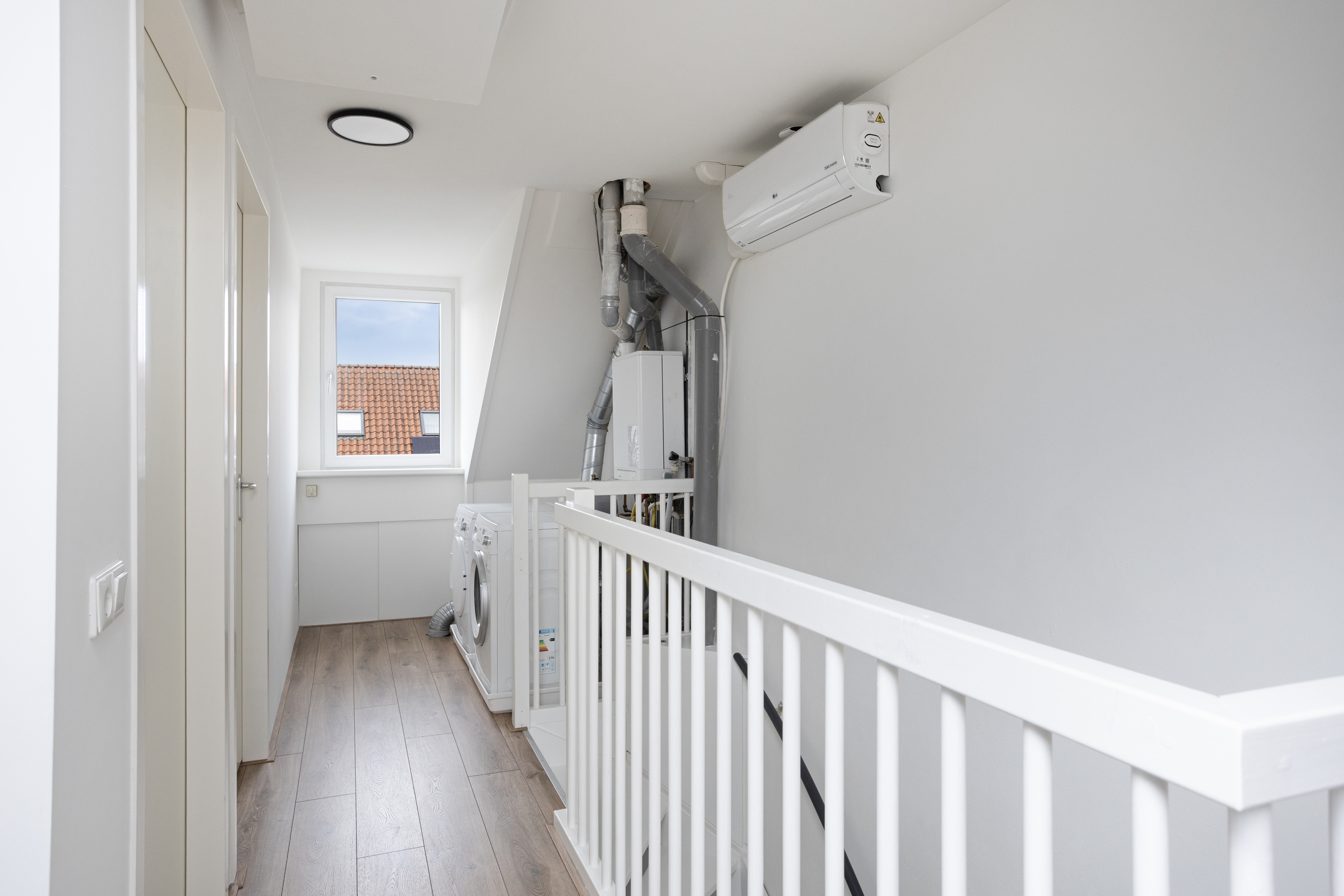 In 2025 is de zolderverdieping op zorgvuldige wijze heringericht en getransformeerd tot een volwaardige woonlaag. Hier tref je een overloop met toegang tot twee goed bemeten slaapkamers. De overloop is functioneel ingericht en biedt plaats aan de witgoedopstelling, de mechanische ventilatie-unit, de cv-installatie en airconditioning. Tevens heb je vanaf hier toegang tot de praktische vliering, ideaal voor extra bergruimte. Dankzij de dakkapel aan de achterzijde ervaar je een merkbare verruiming van zowel lichtinval als leefruimte. De aanwezigheid van rolluiken aan deze zijde draagt bij aan extra comfort en privacy. De gehele etage is bovendien verzorgd afgewerkt met een moderne laminaatvloer.
