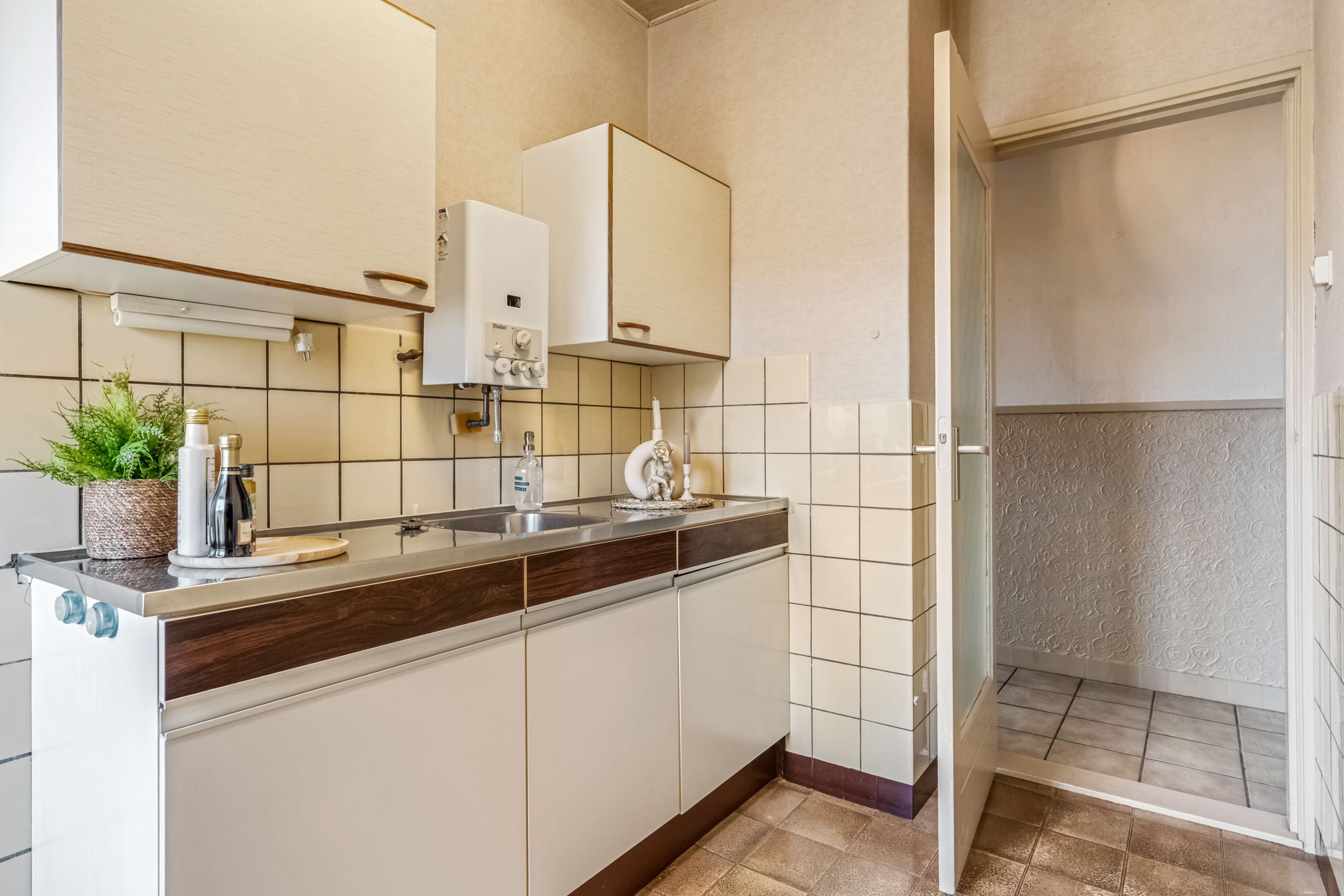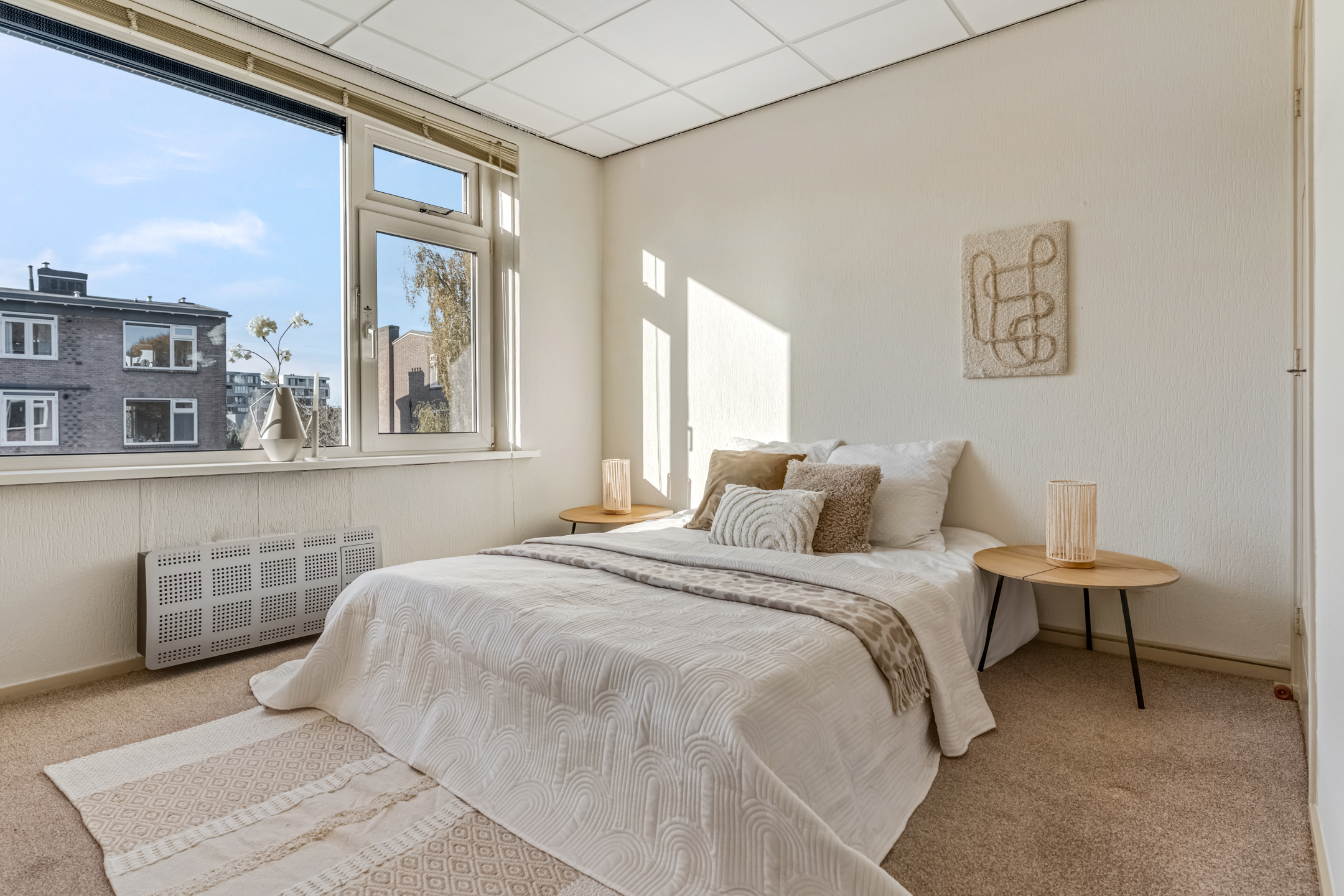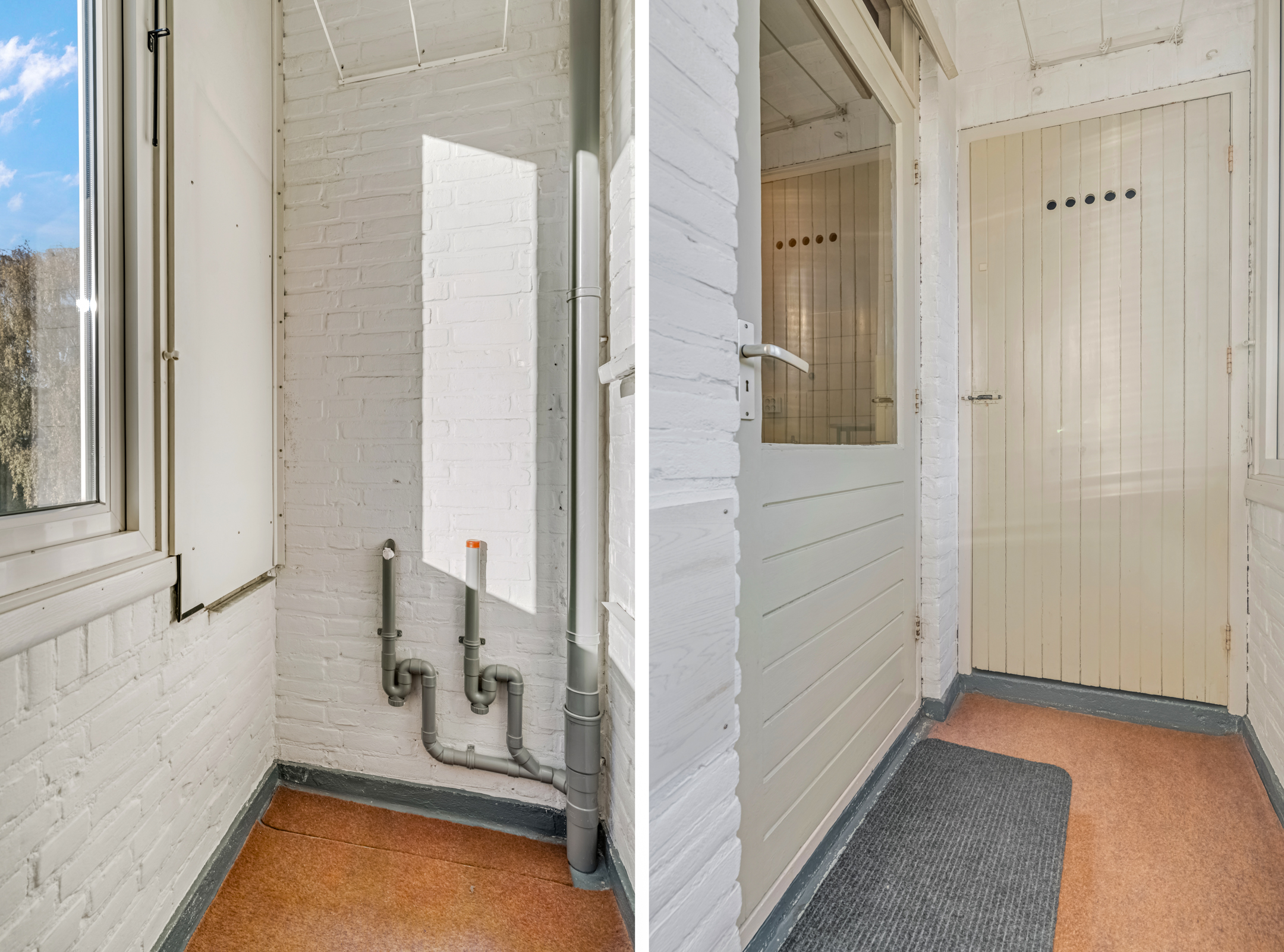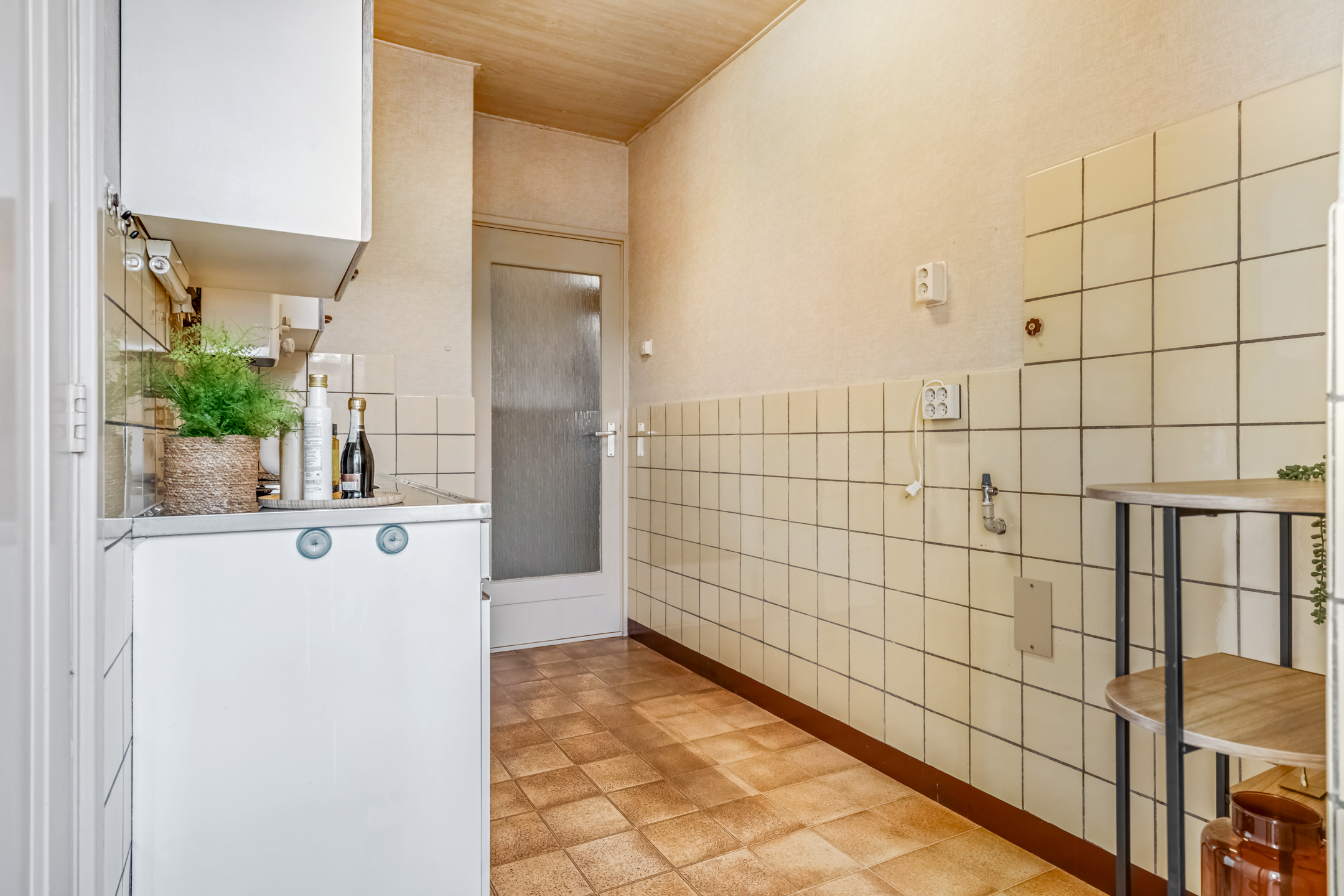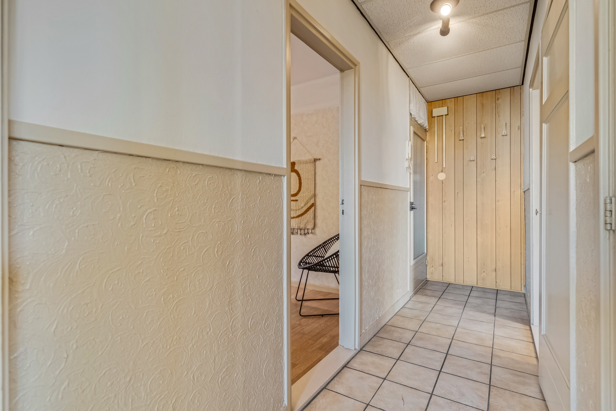 Entree met hal, meterkast en toiletruimte voorzien van closet en fonteintje. De lichte woonkamer heeft een schouw, vaste kast en grote raampartijen met extra zijramen, waardoor er veel natuurlijk licht binnenvalt. Vanuit de woonkamer stap je zo het balkon op, dat gunstig op het westen ligt. De dichte keuken is eenvoudig van uitvoering en geeft toegang tot de loggia met aansluitingen voor witgoed en de cv-installatie. Er zijn twee slaapkamers, beide met vaste kast, en een badkamer met inloopdouche en wastafel.