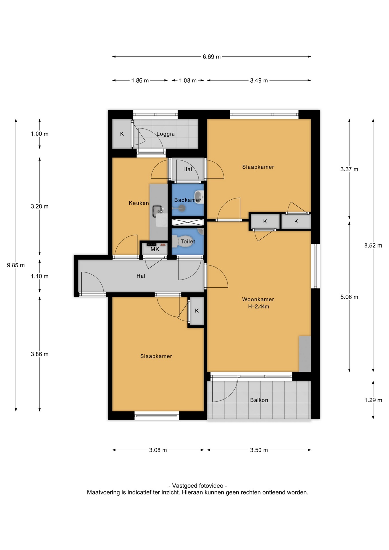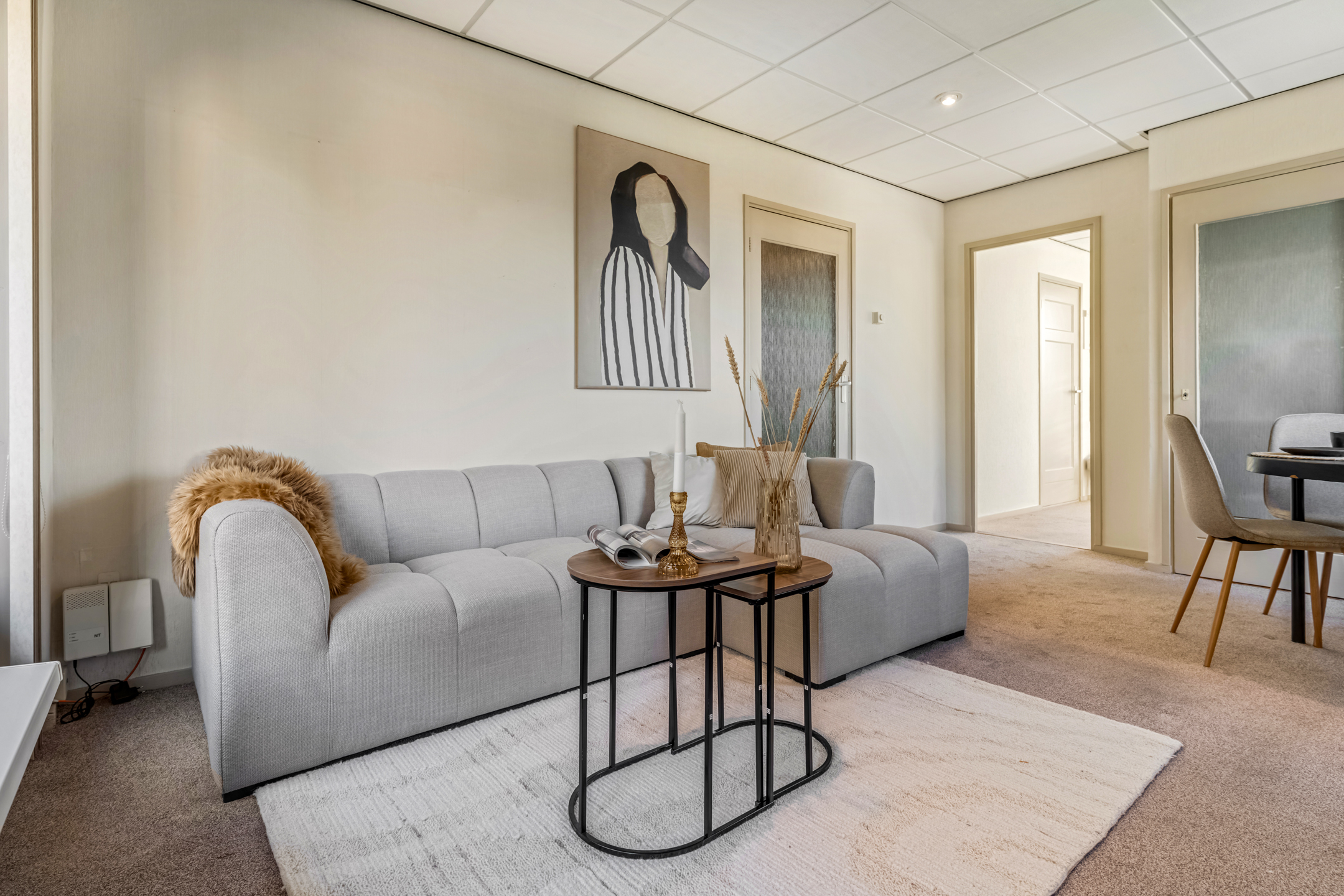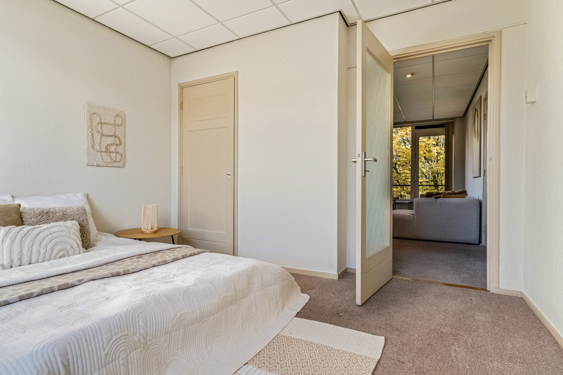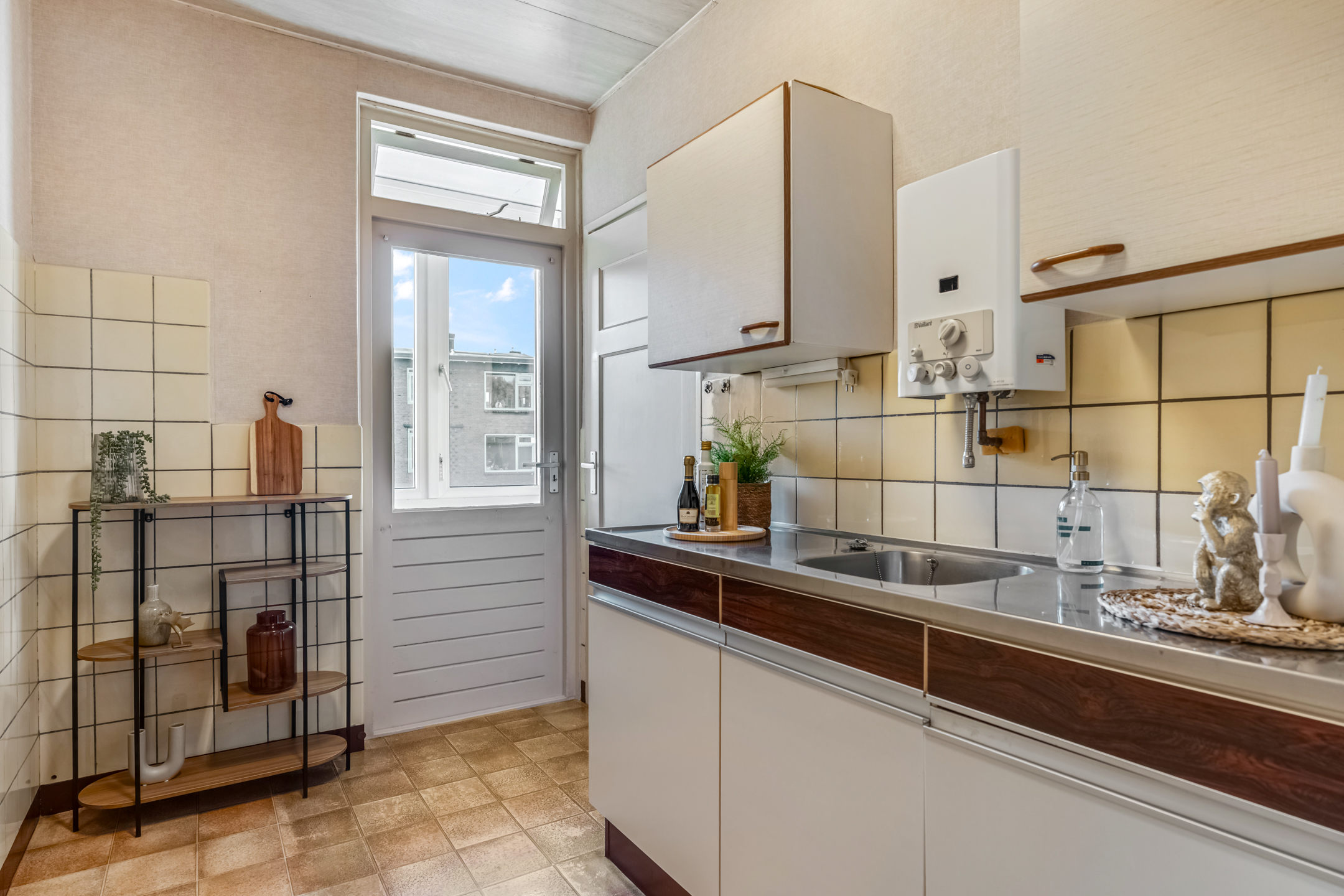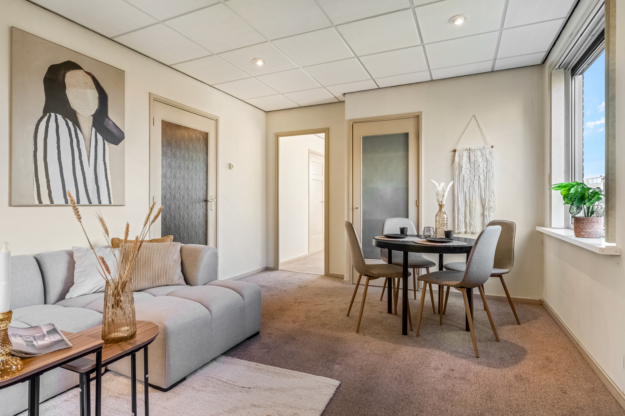 Entree met hal, meterkast en toiletruimte voorzien van closet en fonteintje. De lichte woonkamer heeft een schouw, vaste kast en grote raampartijen met extra zijramen, waardoor er veel natuurlijk licht binnenvalt. Vanuit de woonkamer stap je zo het balkon op, dat gunstig op het westen ligt. De dichte keuken is eenvoudig van uitvoering en geeft toegang tot de loggia met aansluitingen voor witgoed en de cv-installatie. Er zijn twee slaapkamers, beide met vaste kast, en een badkamer met inloopdouche en wastafel.